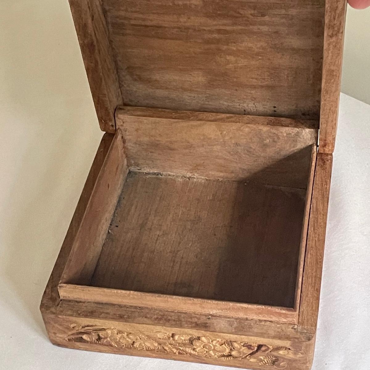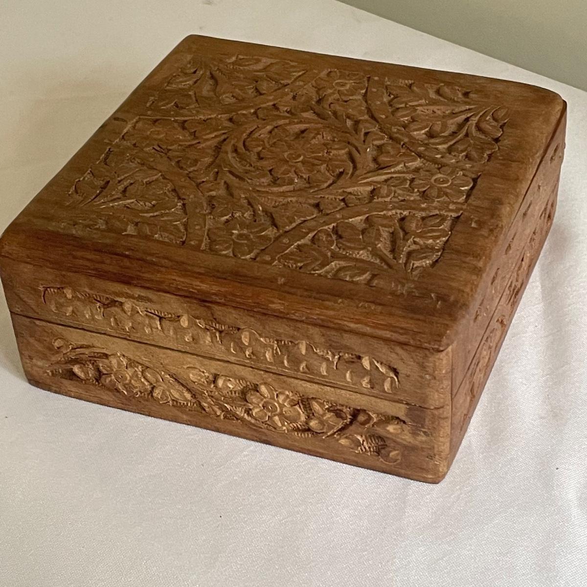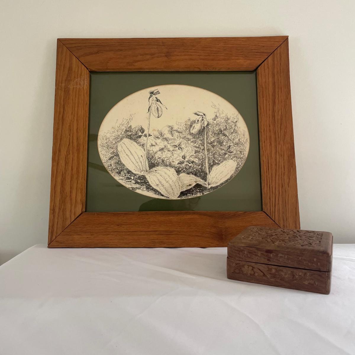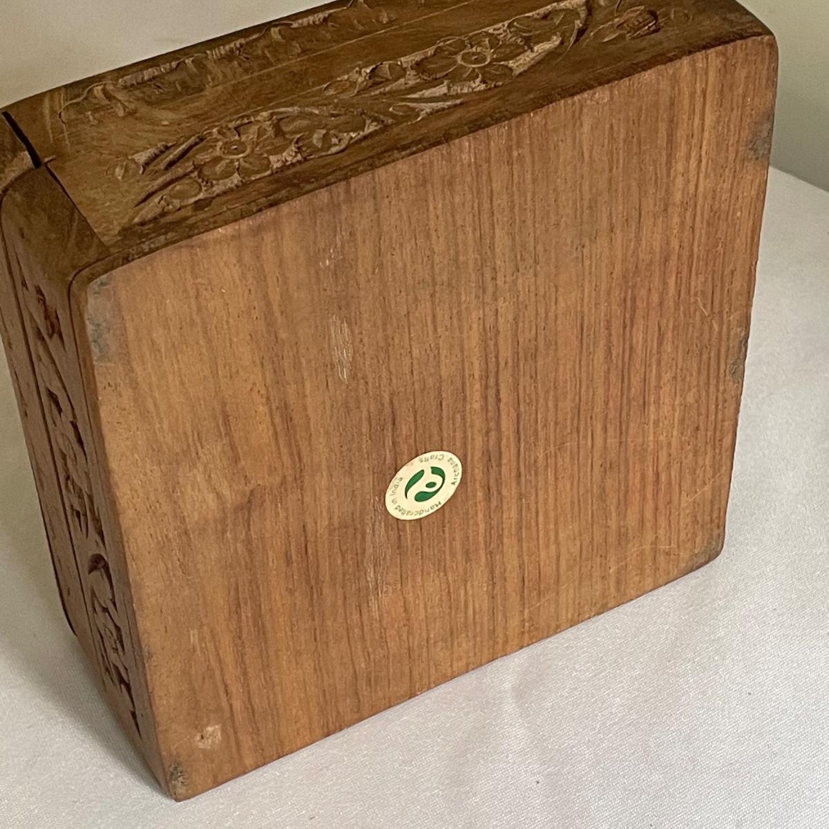 Hand crafted in India, this carved wooden box measures 6” square x 2.4” tall. The print is signed Judy Hull and matted and mounted in a frame that measures 21” x 19”. There are some small marks on it, see images.