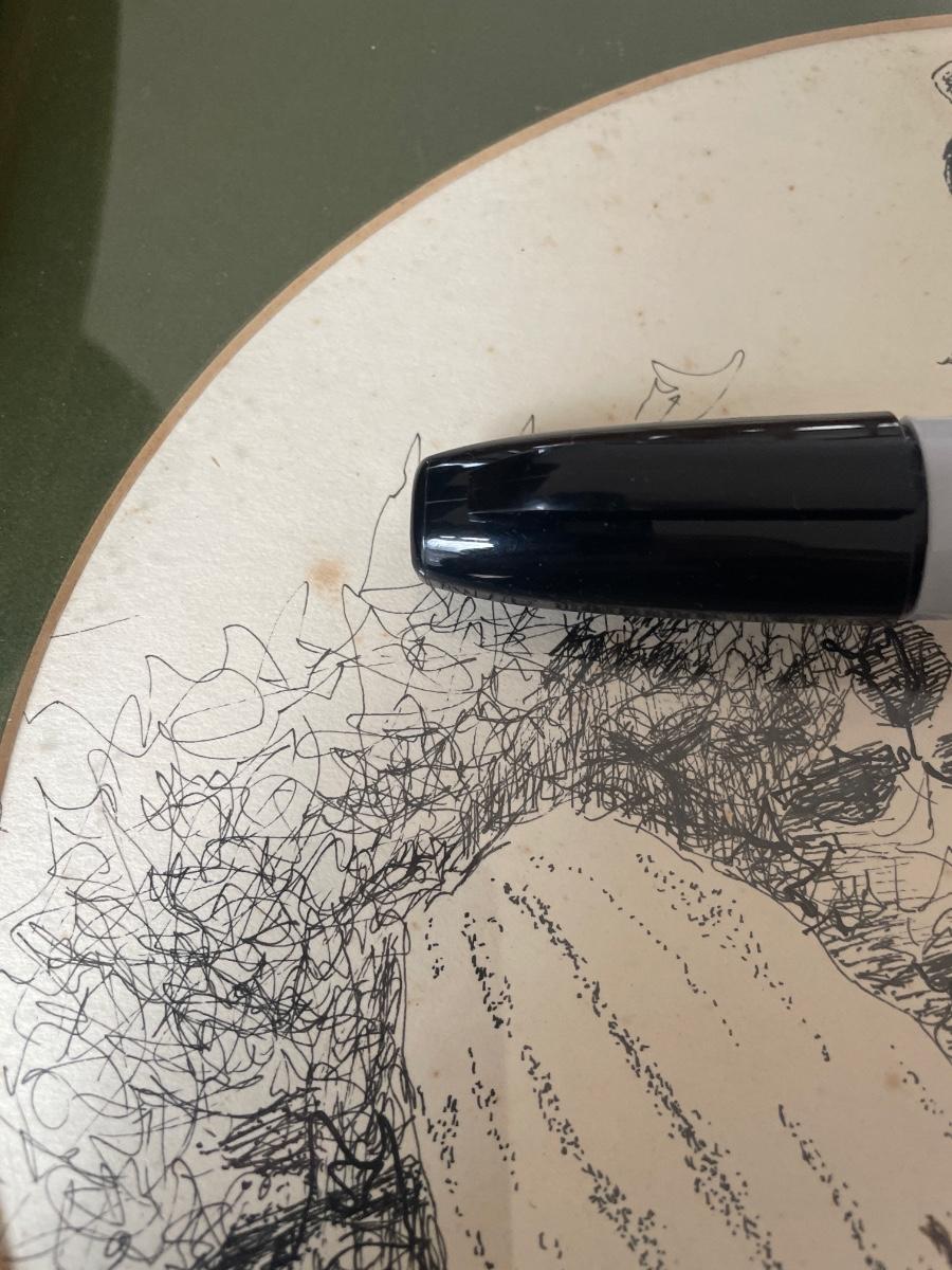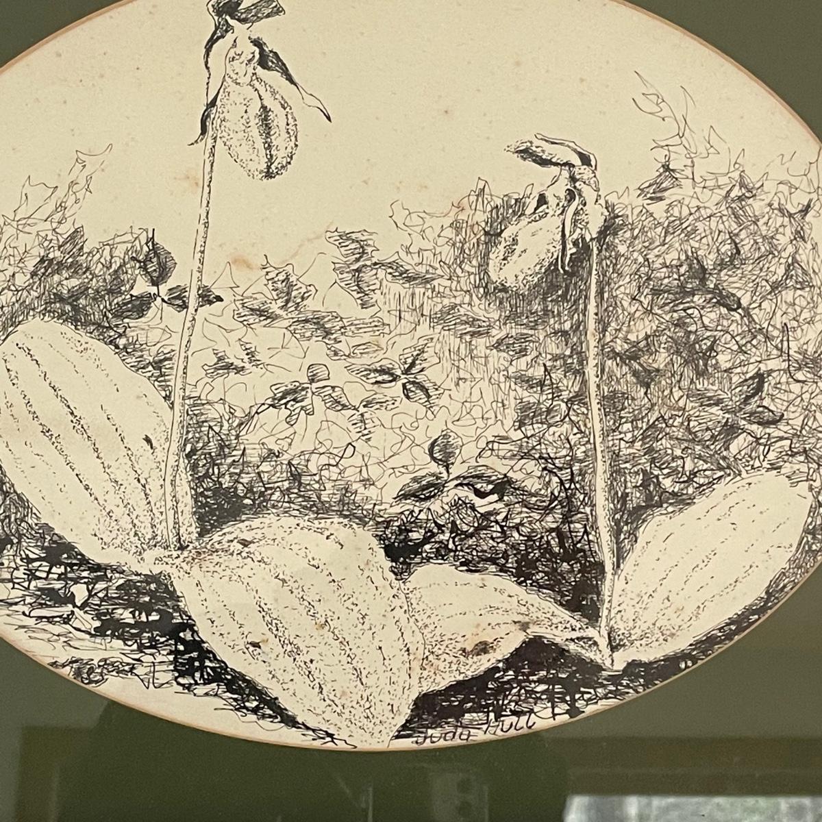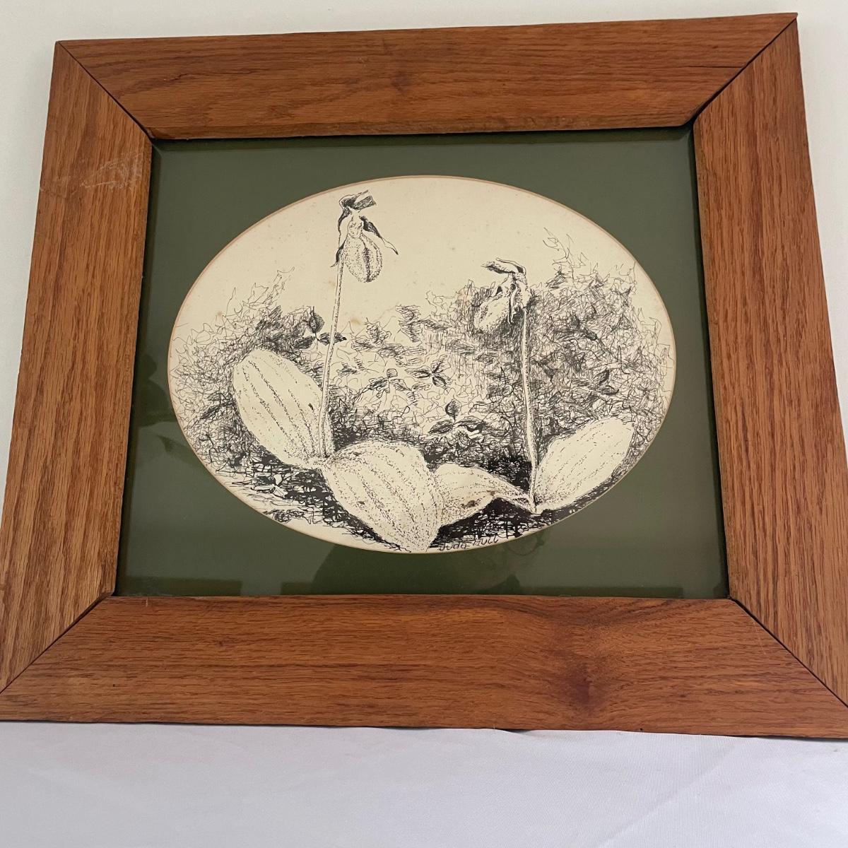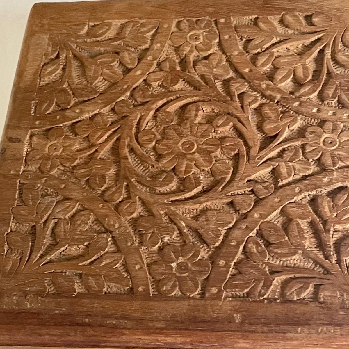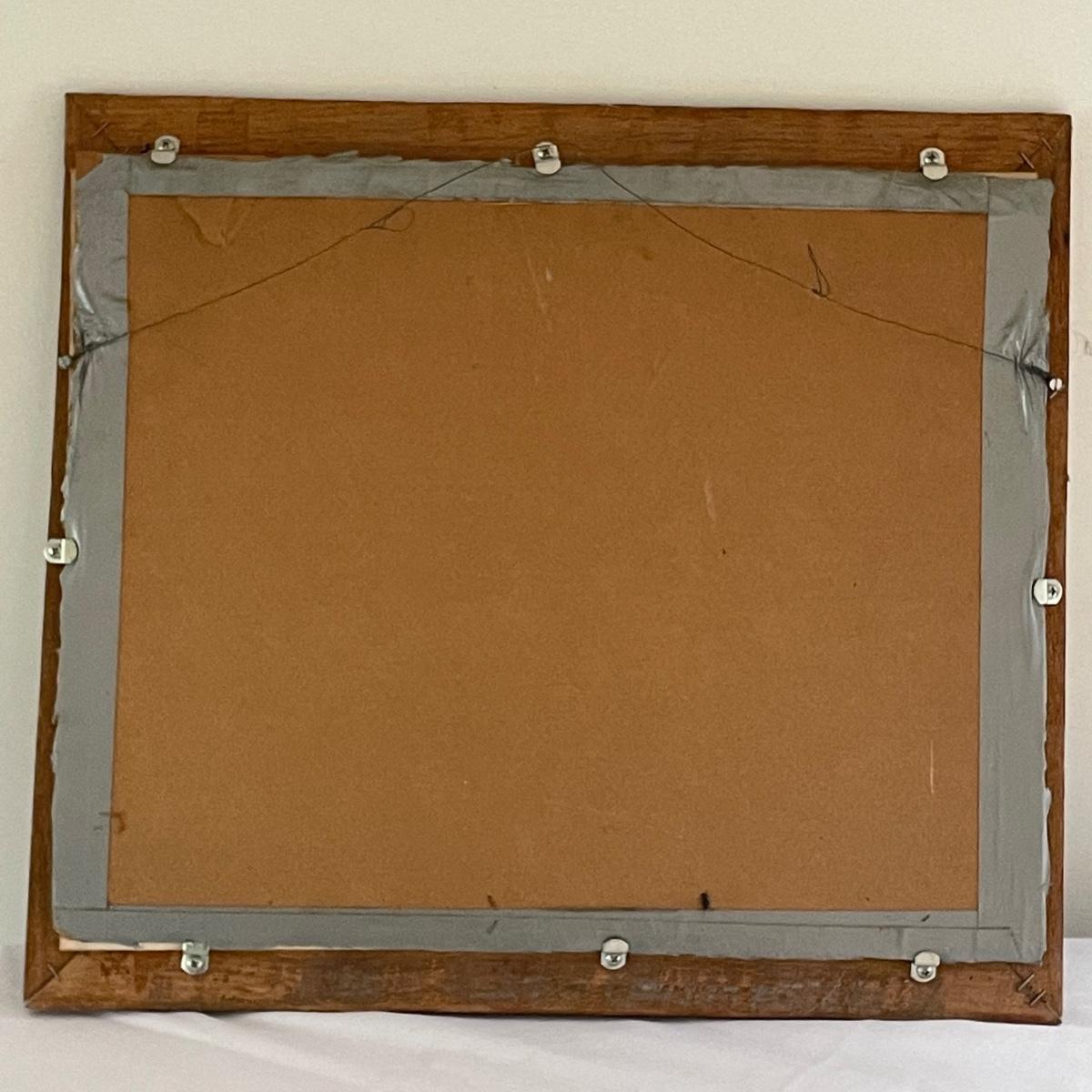 Hand crafted in India, this carved wooden box measures 6” square x 2.4” tall. The print is signed Judy Hull and matted and mounted in a frame that measures 21” x 19”. There are some small marks on it, see images.