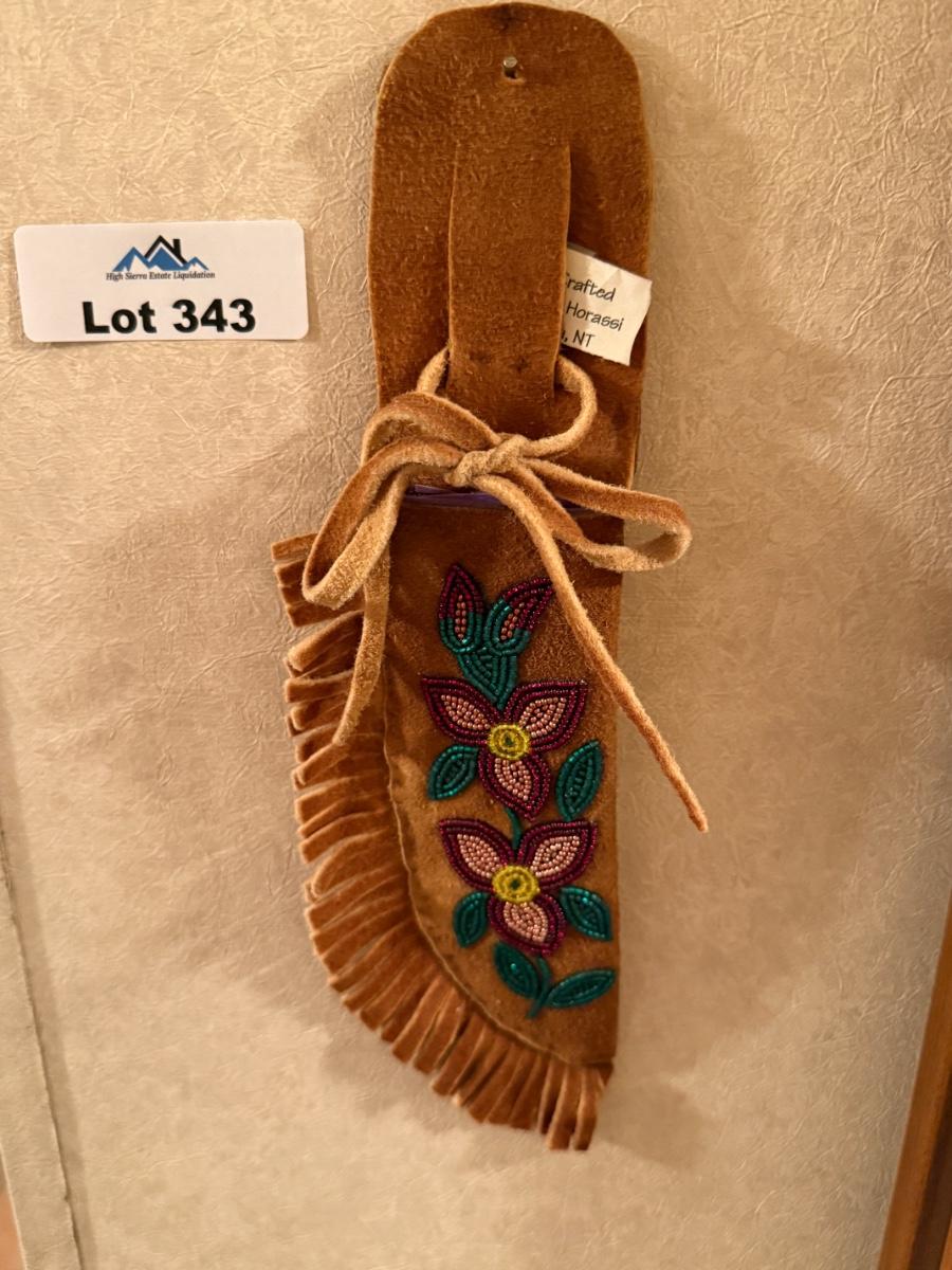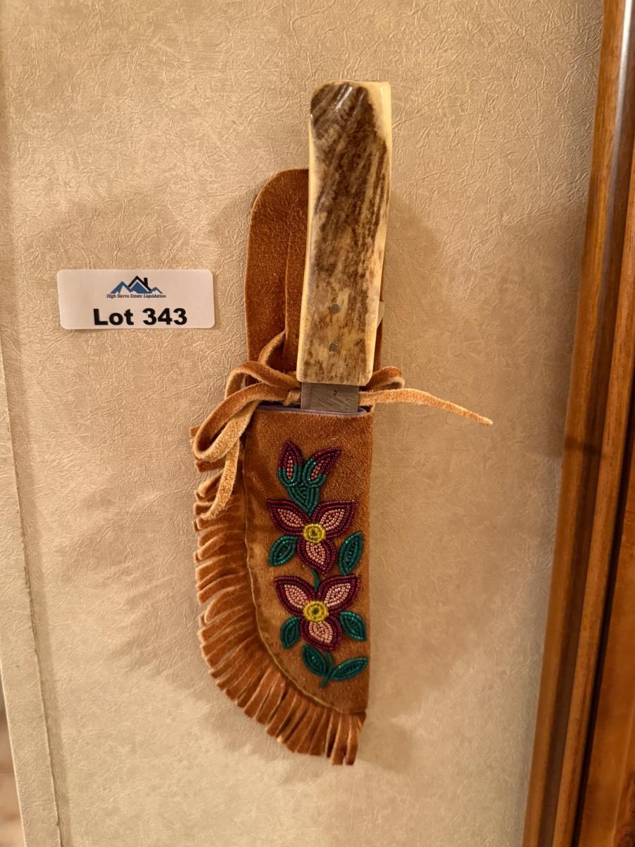 nice native looking knife w/leather beaded sheath as shown