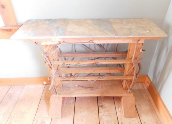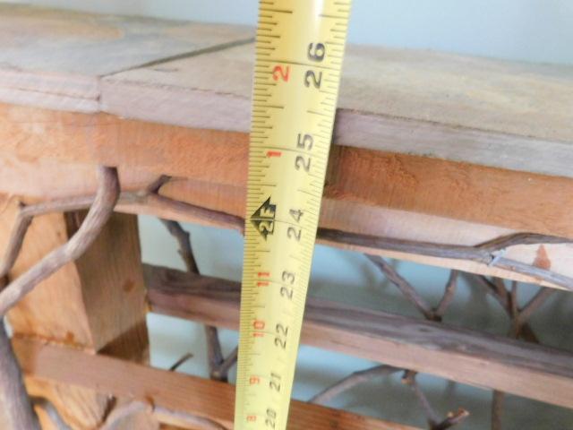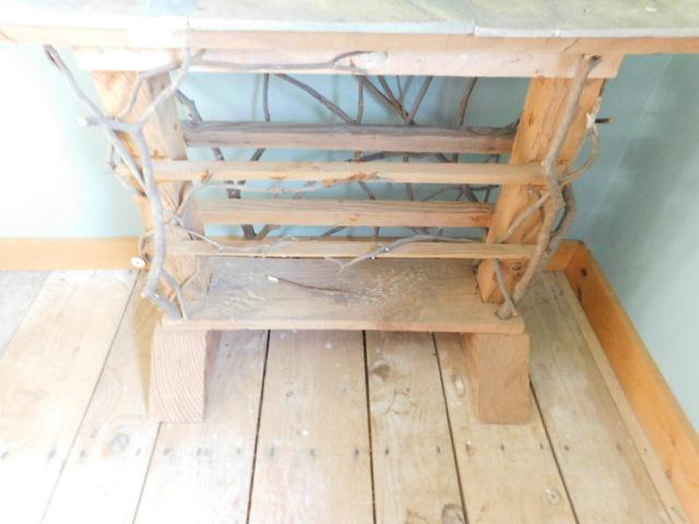 Hand Crafted Natural Wood and Twig Accent Table with Tile Top 35"x12"x25" heavy item. Tile top is not attached. ready for paint or finish. Upstairs item.