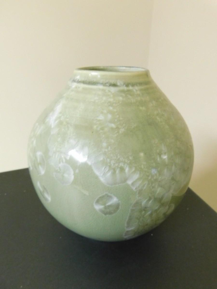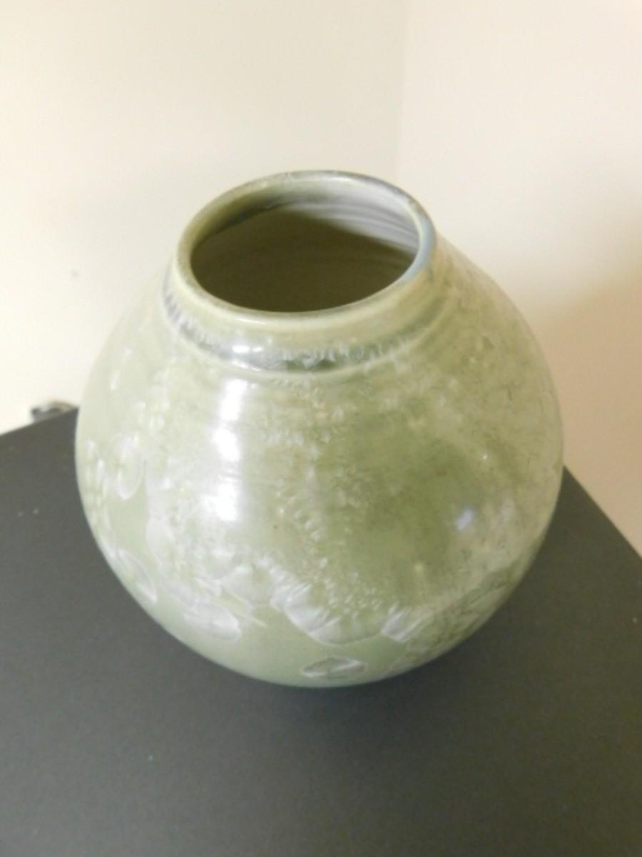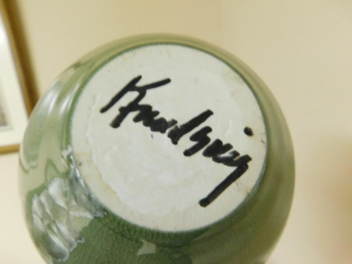 Hand Crafted Pottery Vase Signed Knudsui. A must see- has an irridescent/mother of pearl quality that cannot be adequately captured in pictures.