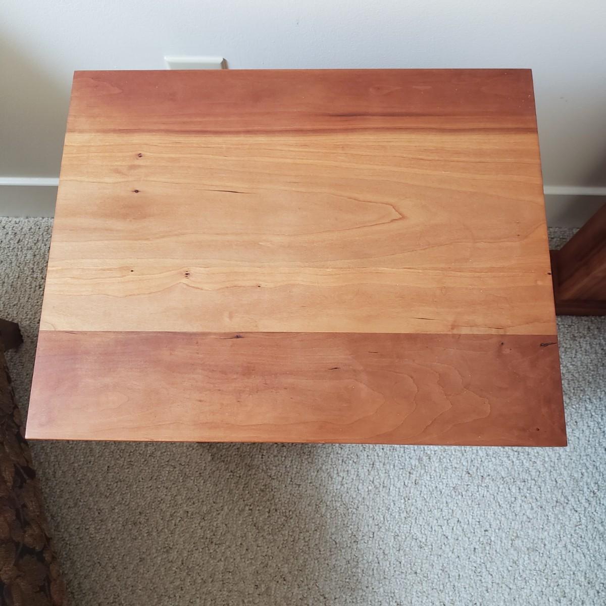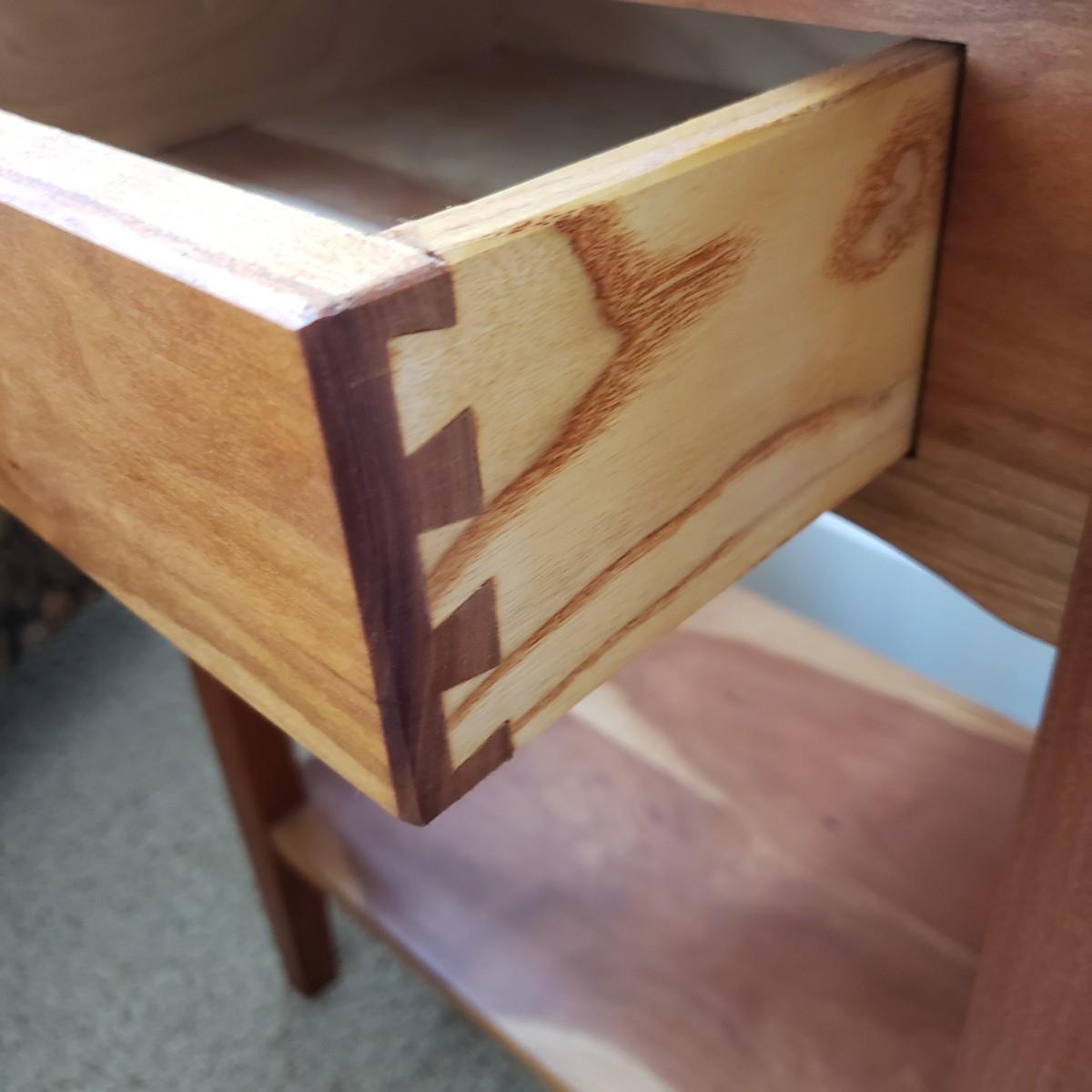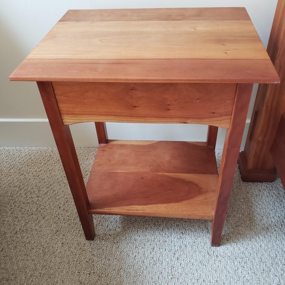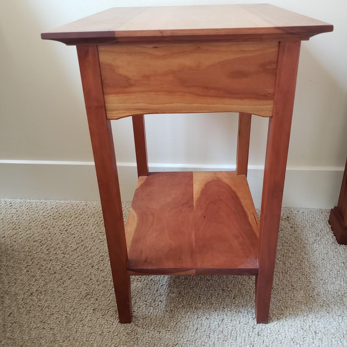 This gorgeous side table appears to be solid wood.The wood is very smooth. Many wood colors and grains are reflected. The table measures 20" x 16" x 24.5"H. It features one dovetailed drawer.