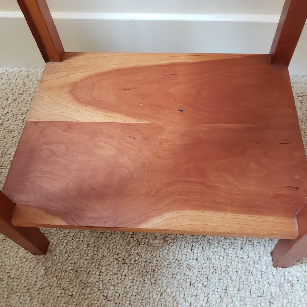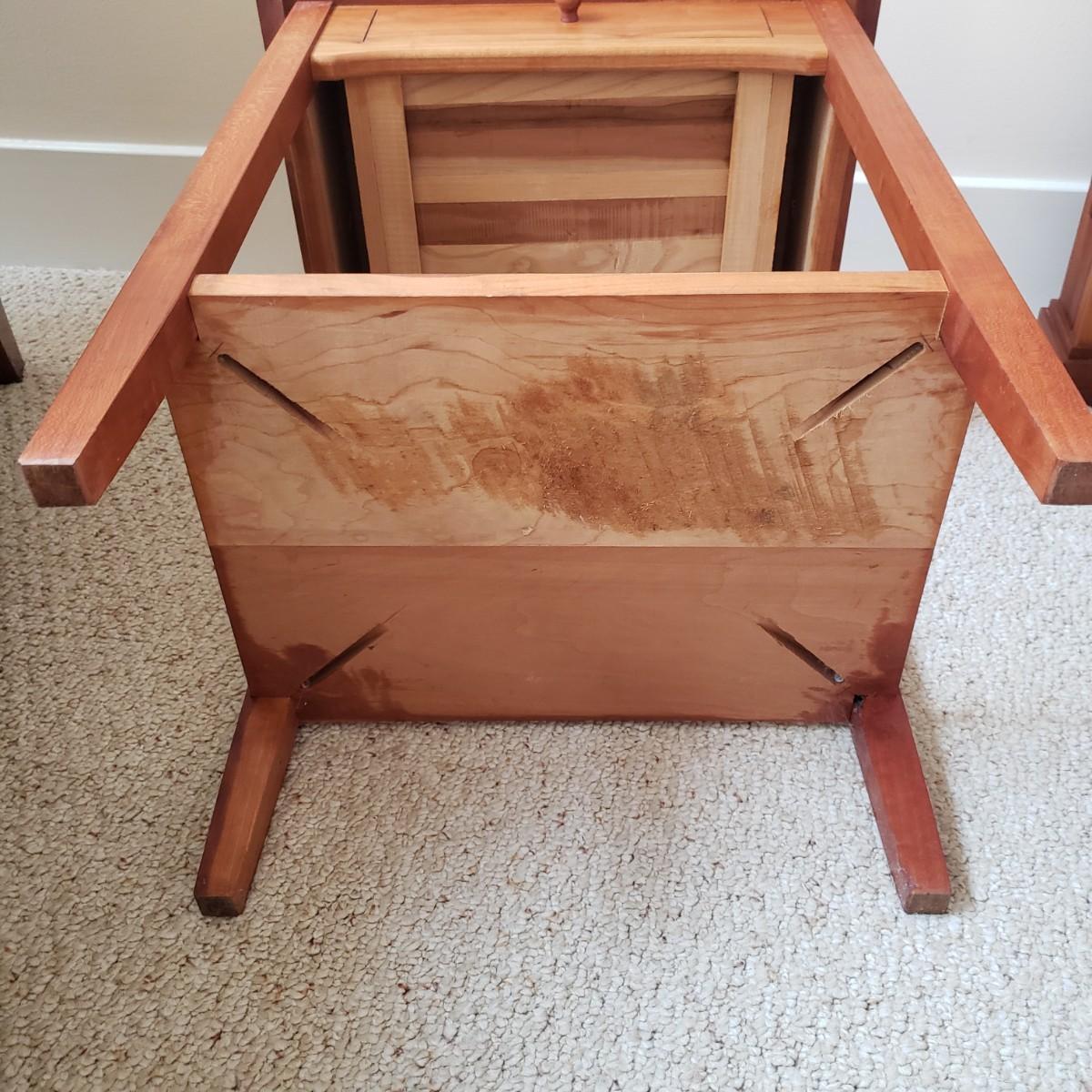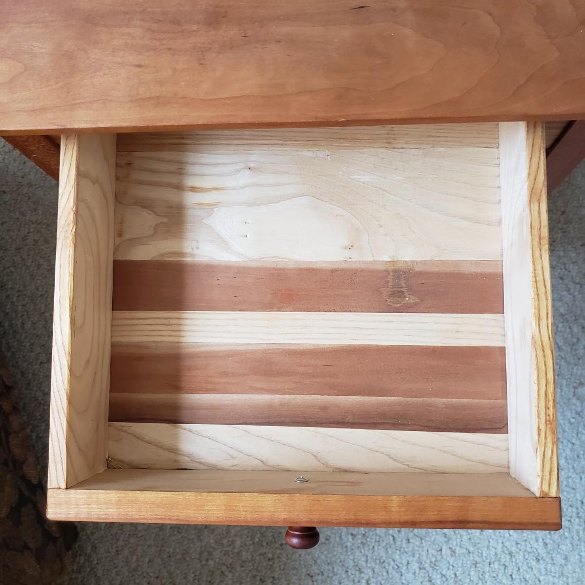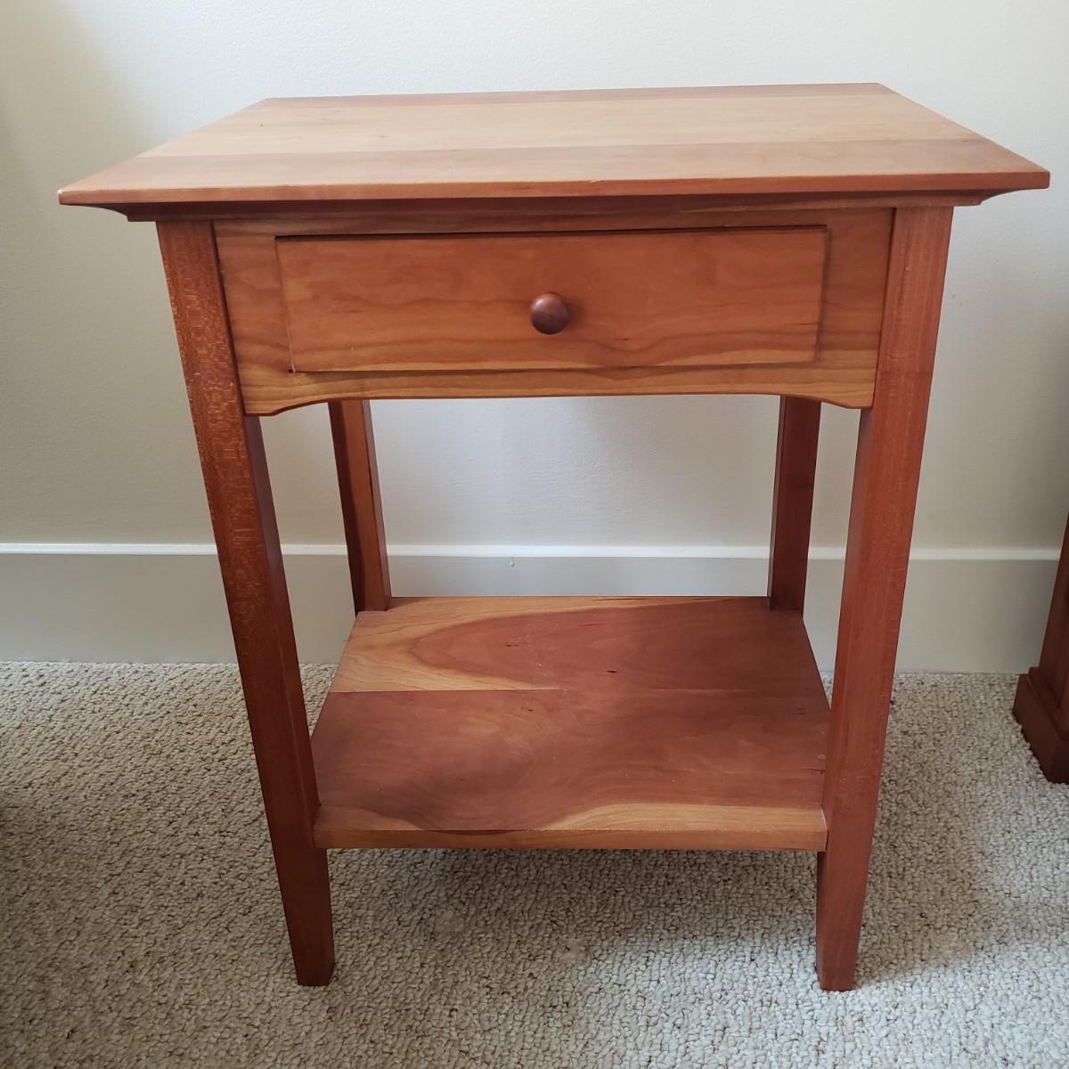 This gorgeous side table appears to be solid wood.The wood is very smooth. Many wood colors and grains are reflected. The table measures 20" x 16" x 24.5"H. It features one dovetailed drawer.