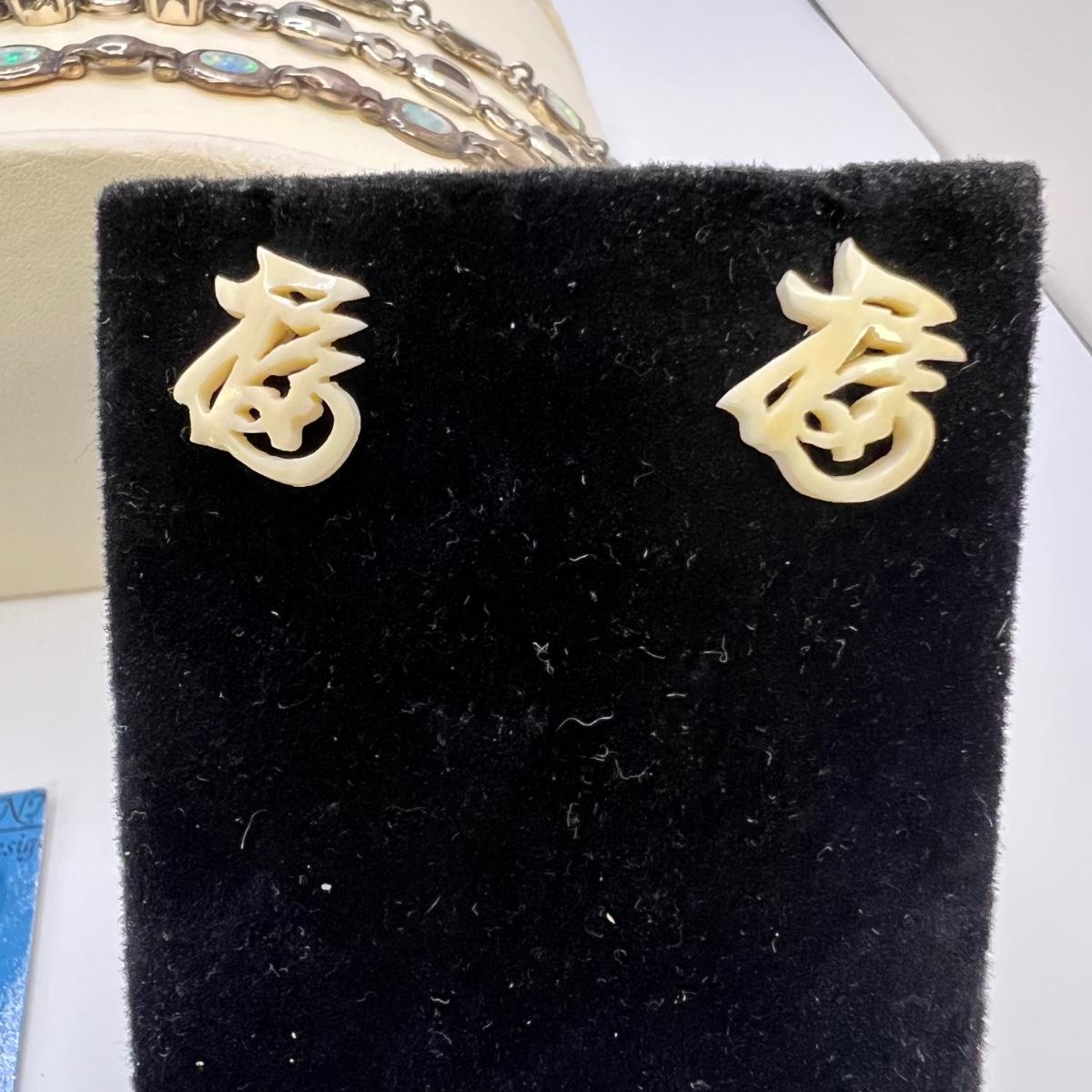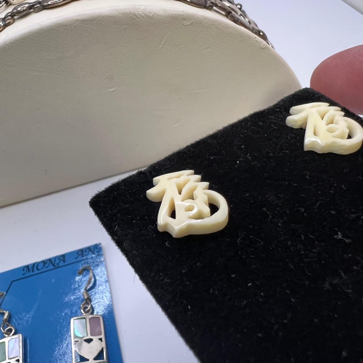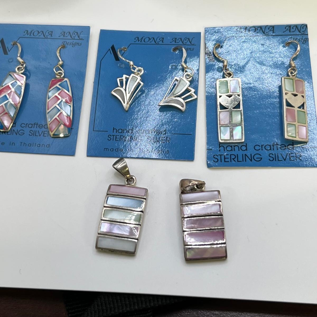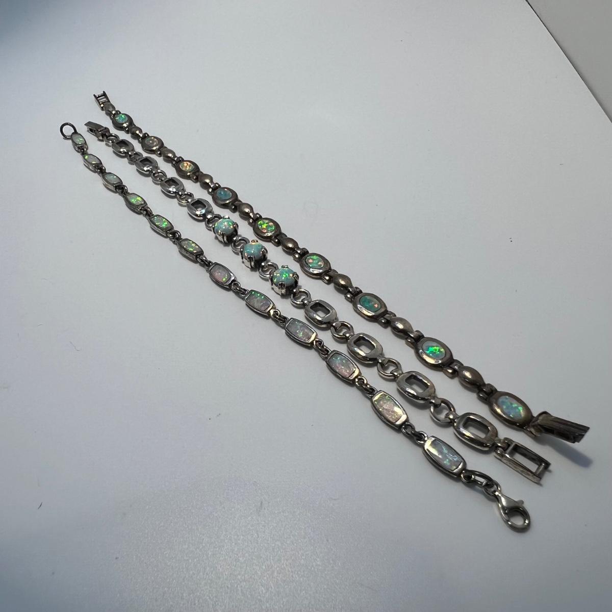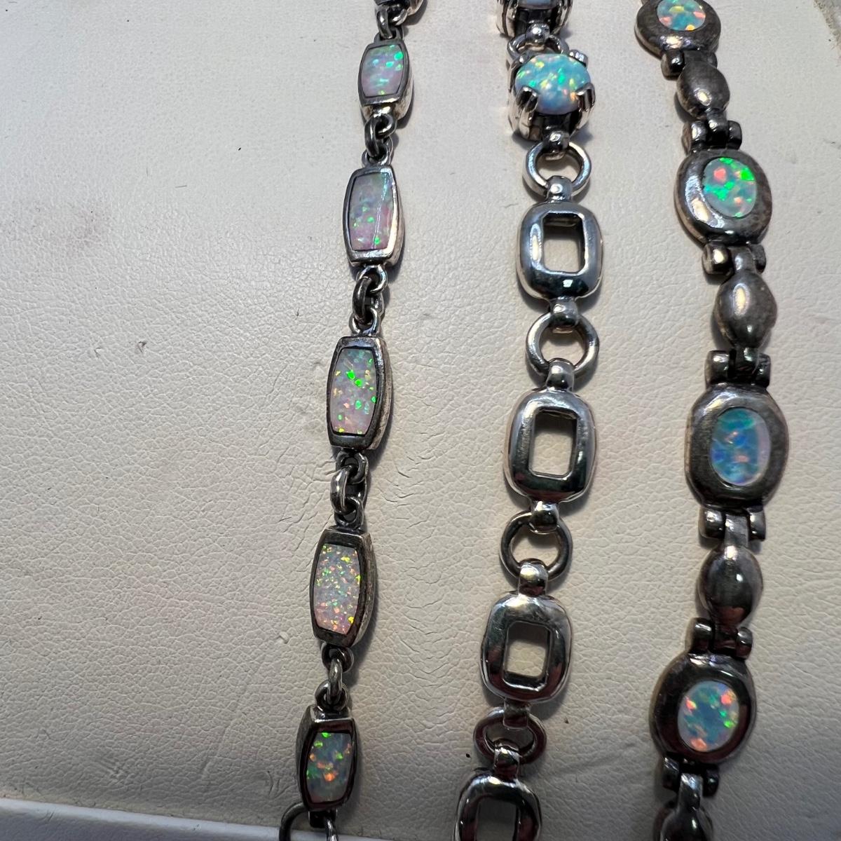 Three tennis style opal bracelets, six pairs of earrings for pierced ears and two pendants. The pendants and three pairs of Mona Ann earrings all have what appears to be mother of pearl and have sterling marks. Note the one pair of earrings has a 925 marking on the French hook but not on the body of the earrings unlike the other two pairs. The other three pairs of earrings have no marks. The two bracelets photographed on a wrist both have 925 clasps, the third does not. All three have opal like stones.