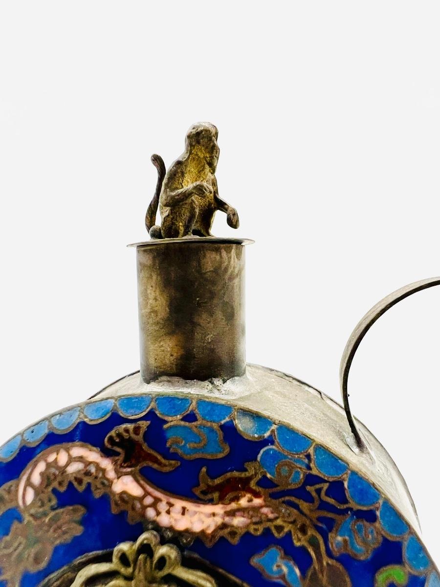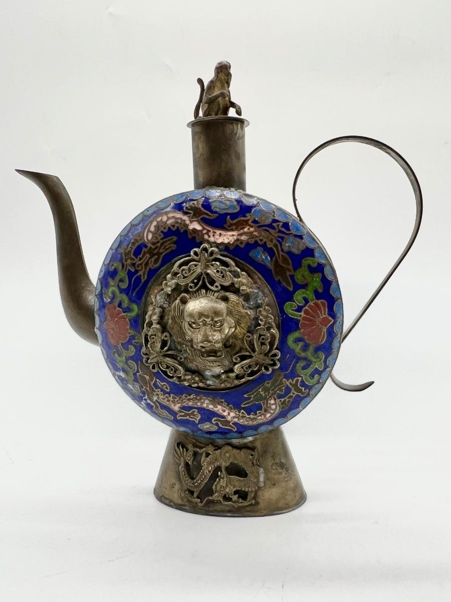 Decorative Tea pot. Featuring a lion, dragon and monkey on the lid. Measures 5 inches tall and 4 1/2 inches wide.