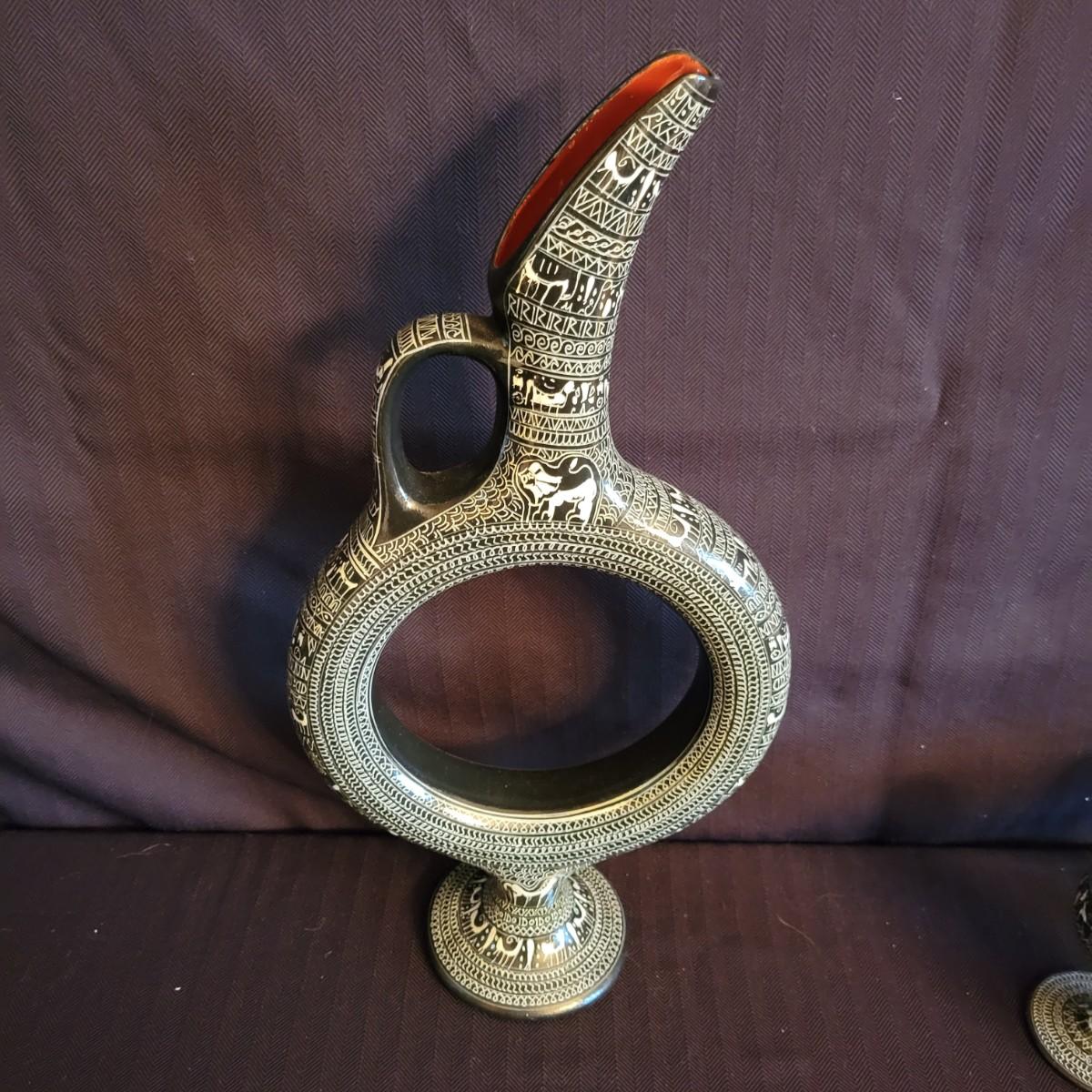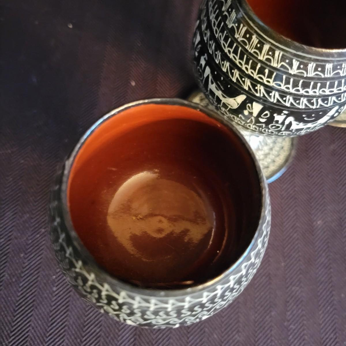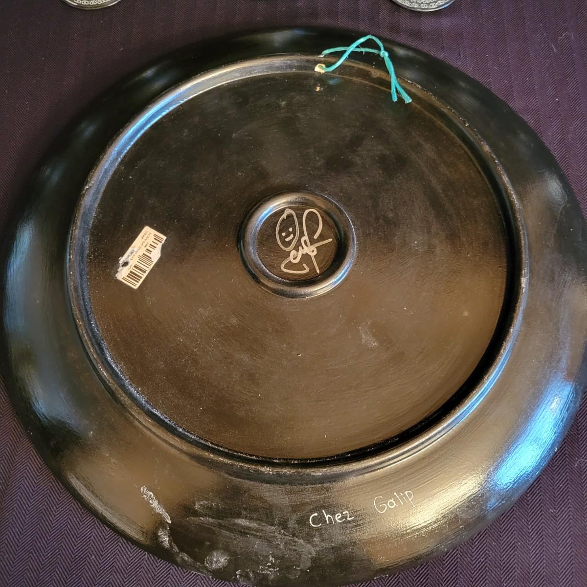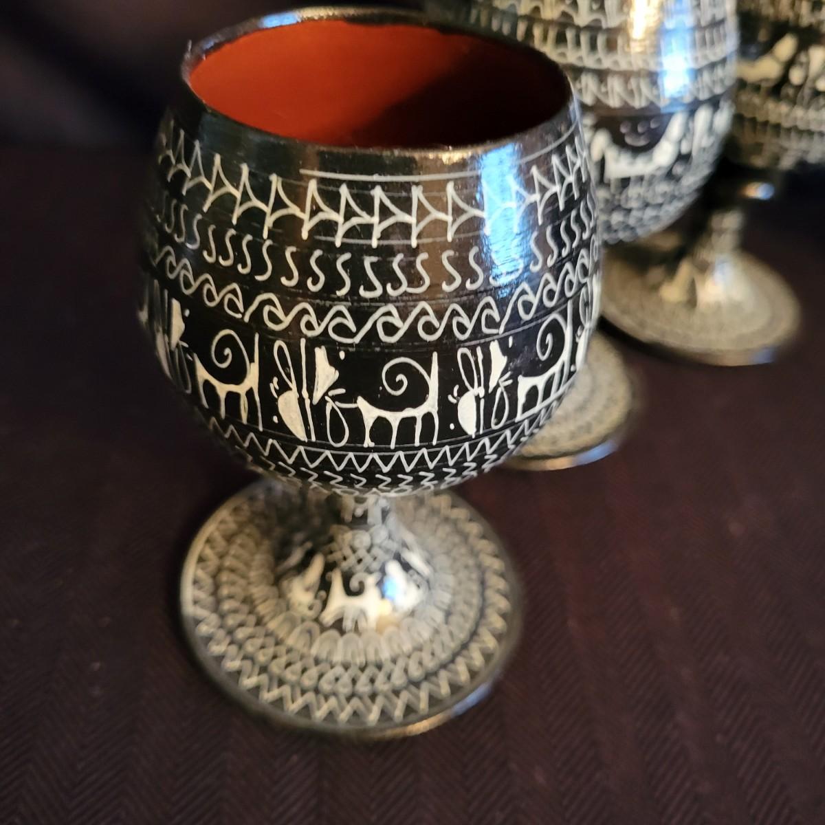 A collection of hand crafted ceramic cups, plate and decanter made by Chez Galip. Included are six cups, a large plate that can be hung and a wine decanter. The decanter measures approximately 8.5" x 4" x 17"H. Shipping available
