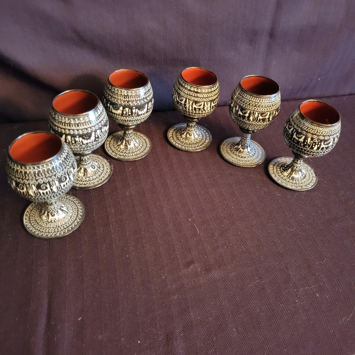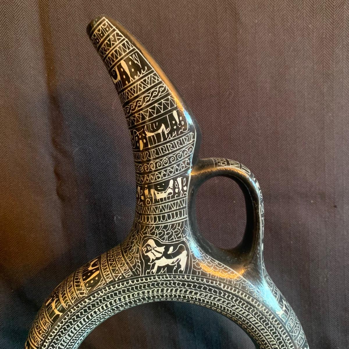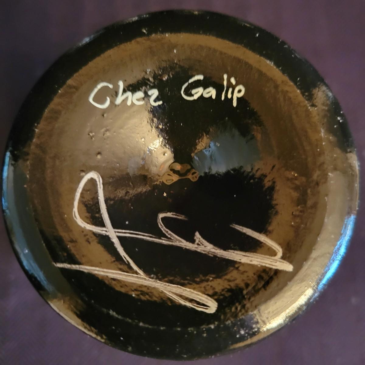 A collection of hand crafted ceramic cups, plate and decanter made by Chez Galip. Included are six cups, a large plate that can be hung and a wine decanter. The decanter measures approximately 8.5" x 4" x 17"H. Shipping available
