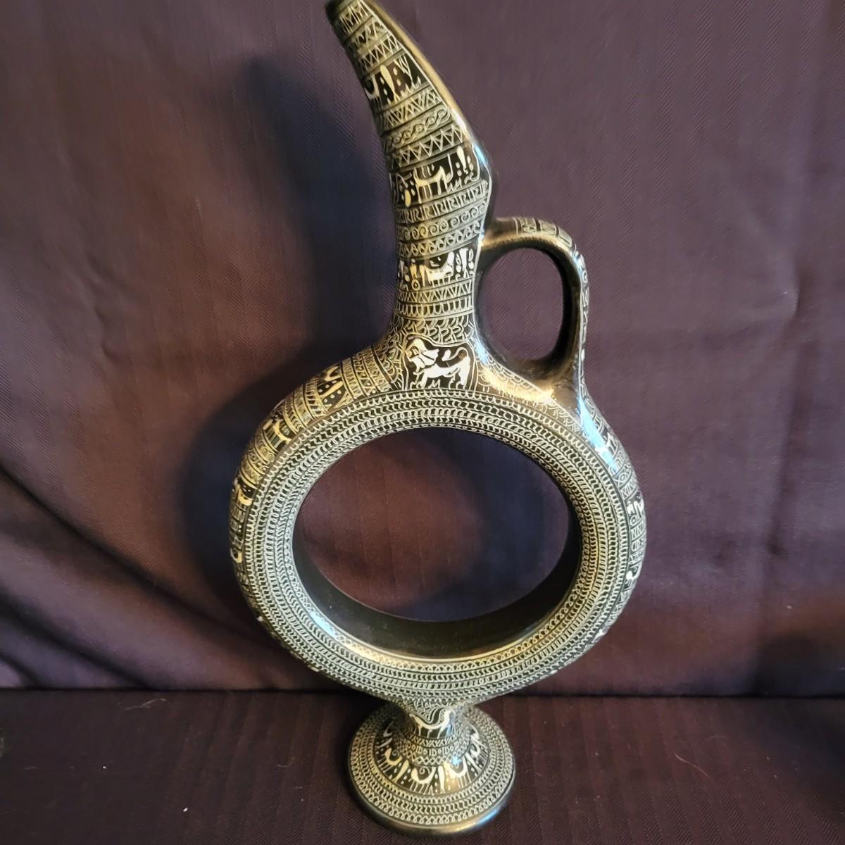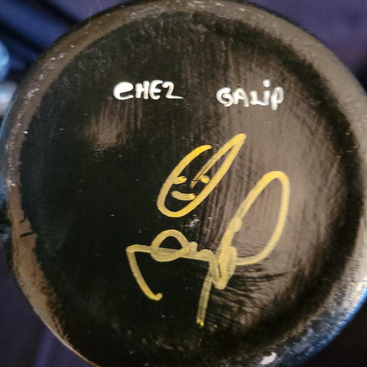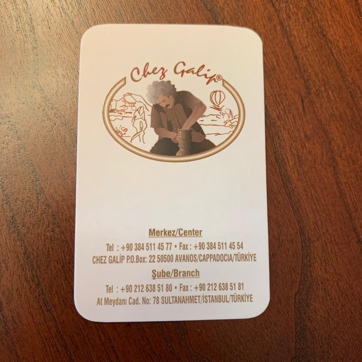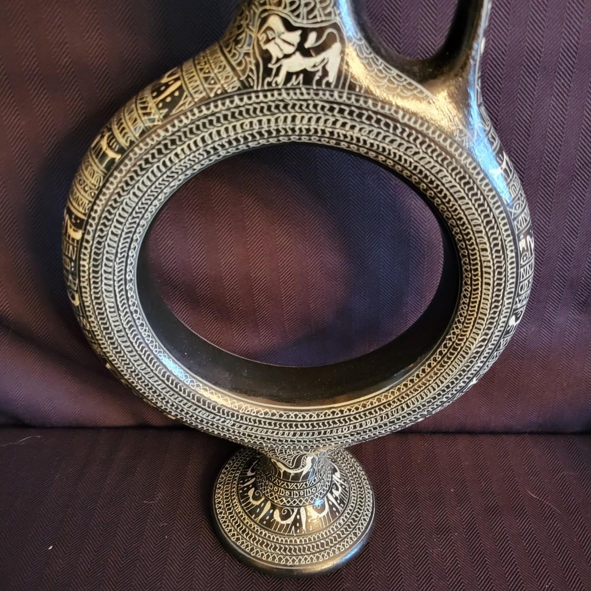 A collection of hand crafted ceramic cups, plate and decanter made by Chez Galip. Included are six cups, a large plate that can be hung and a wine decanter. The decanter measures approximately 8.5" x 4" x 17"H. Shipping available