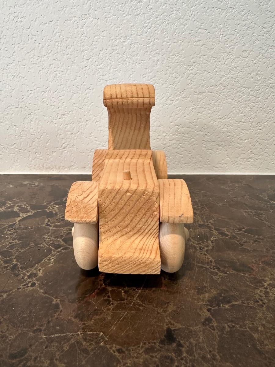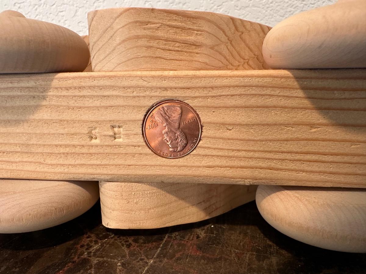 HAND CRAFTED WOODEN TOYS WITH AN EMBEDDED PENNY FOR THE YEAR THEY WERE MADE