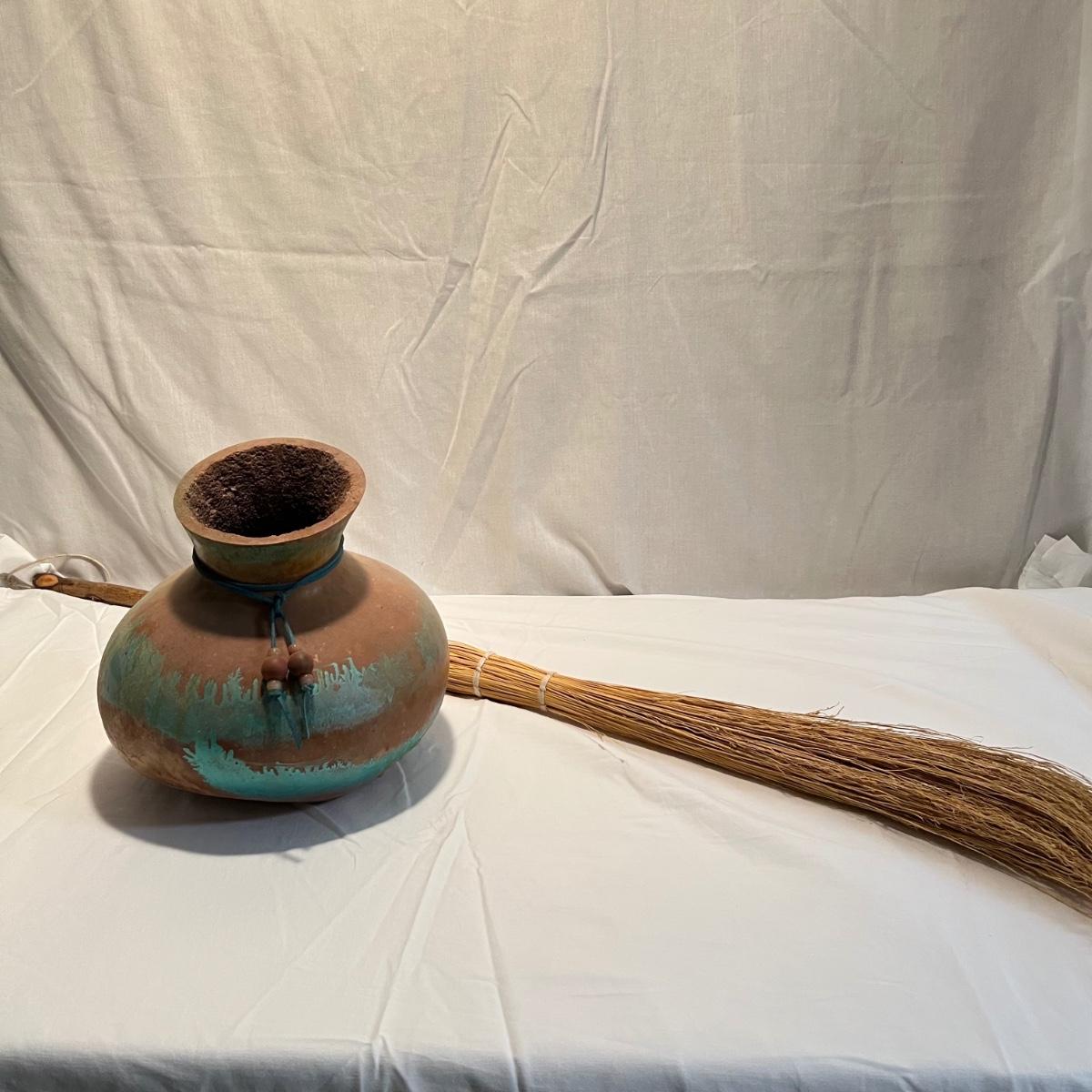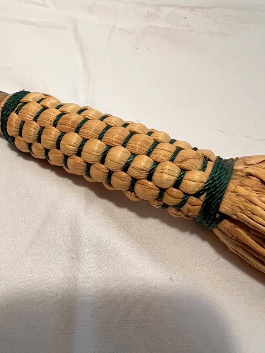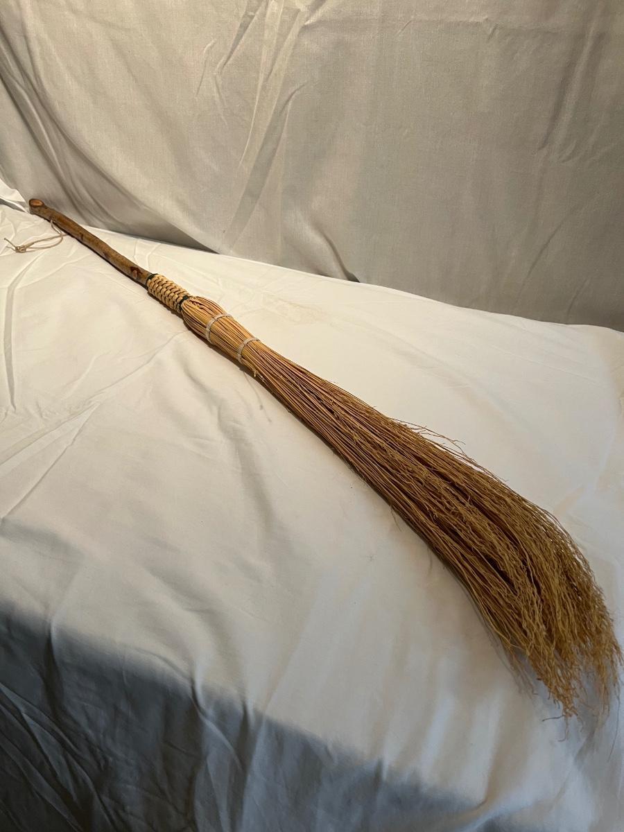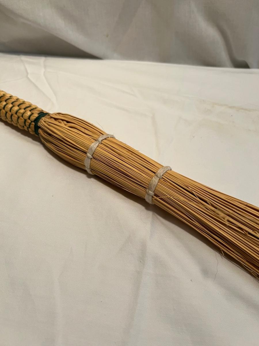 Both these items appear to be handcrafted. The gourd has been carved into a vase and has an attractive teal paint and lace design around the collar. It is pen signed, see photo. The straw broom has a thin rope to hang it to display. Gourd measures 13”D x 11”H. Broom is 45” long.