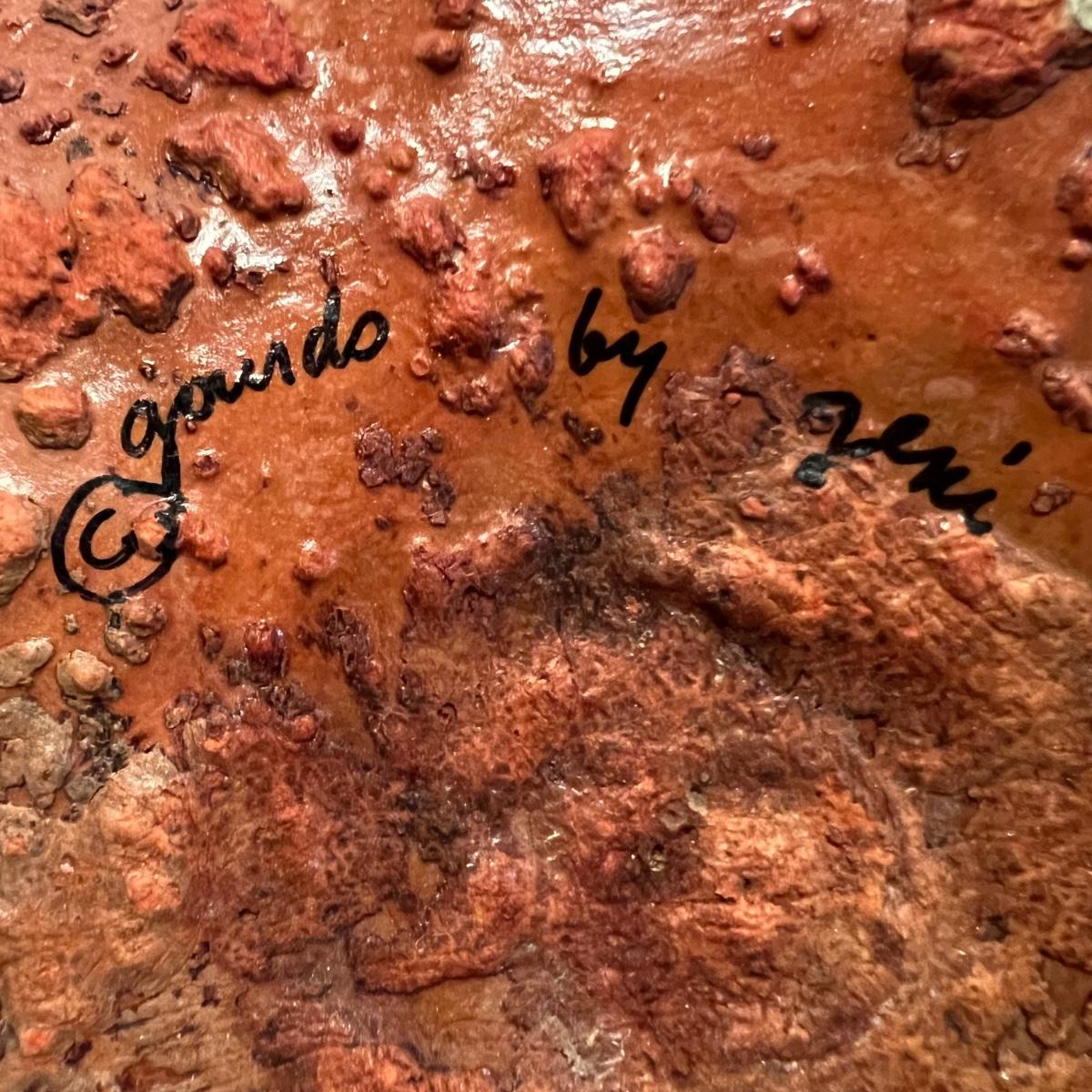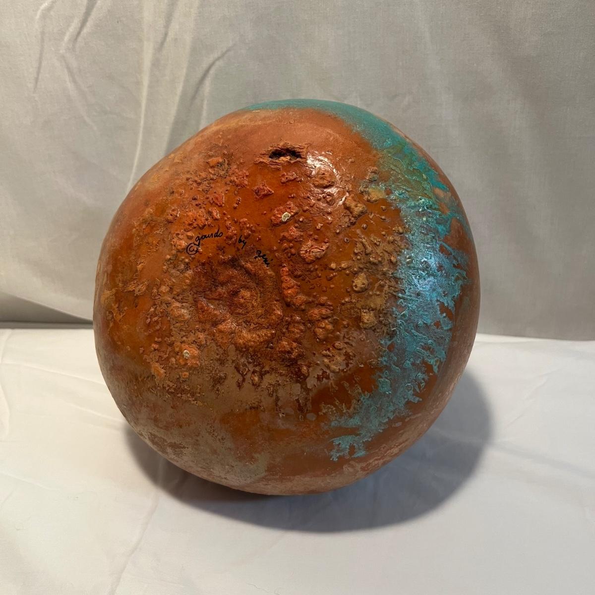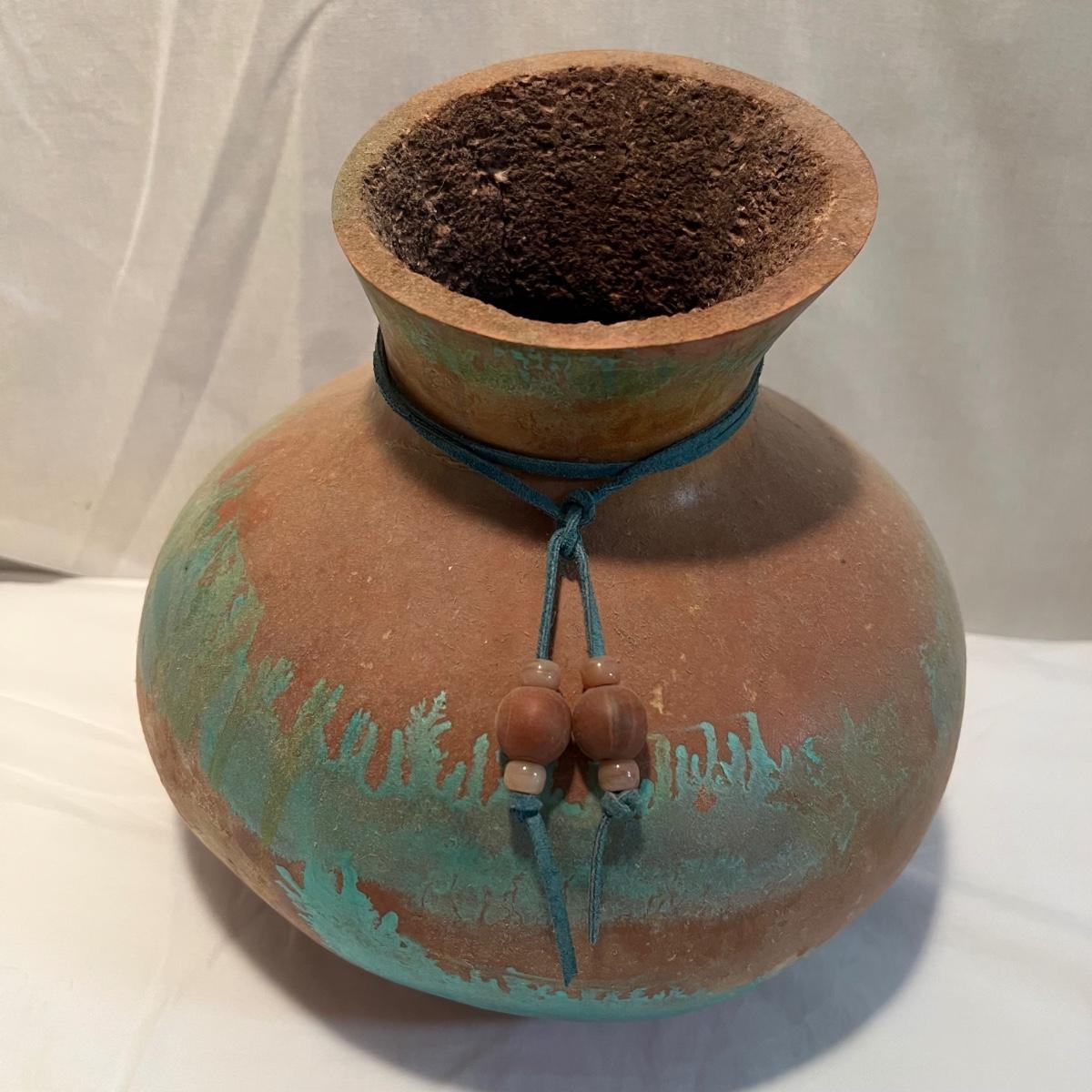 Both these items appear to be handcrafted. The gourd has been carved into a vase and has an attractive teal paint and lace design around the collar. It is pen signed, see photo. The straw broom has a thin rope to hang it to display. Gourd measures 13”D x 11”H. Broom is 45” long.