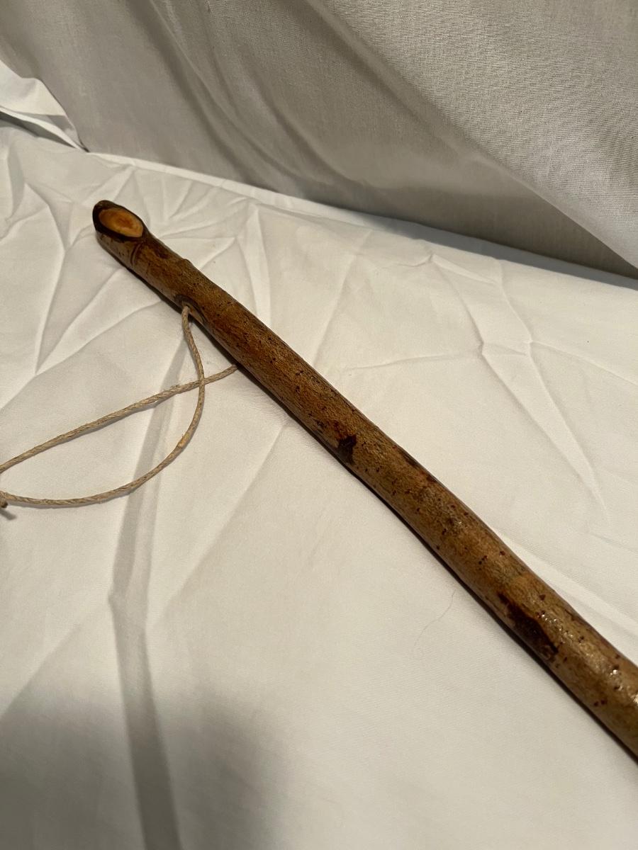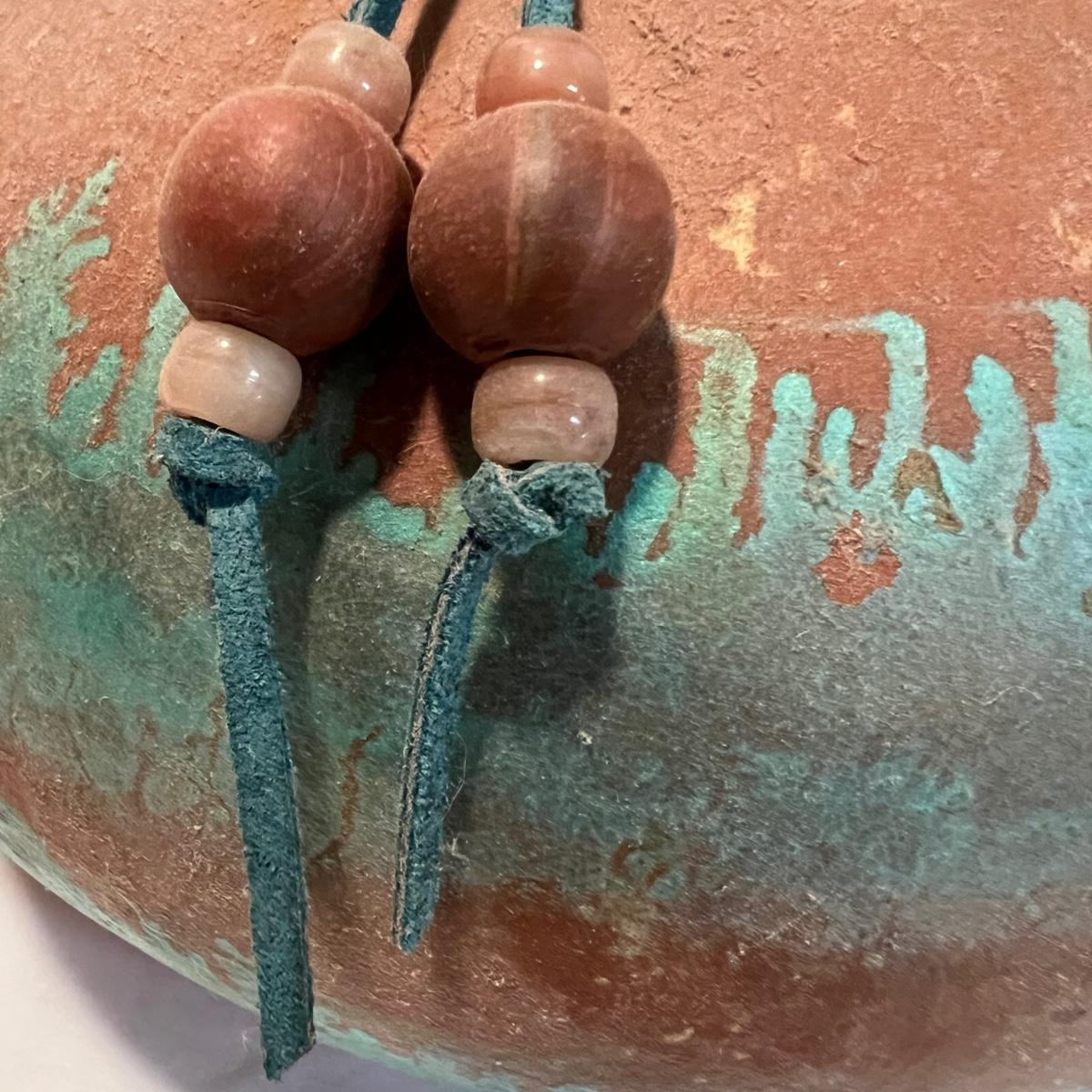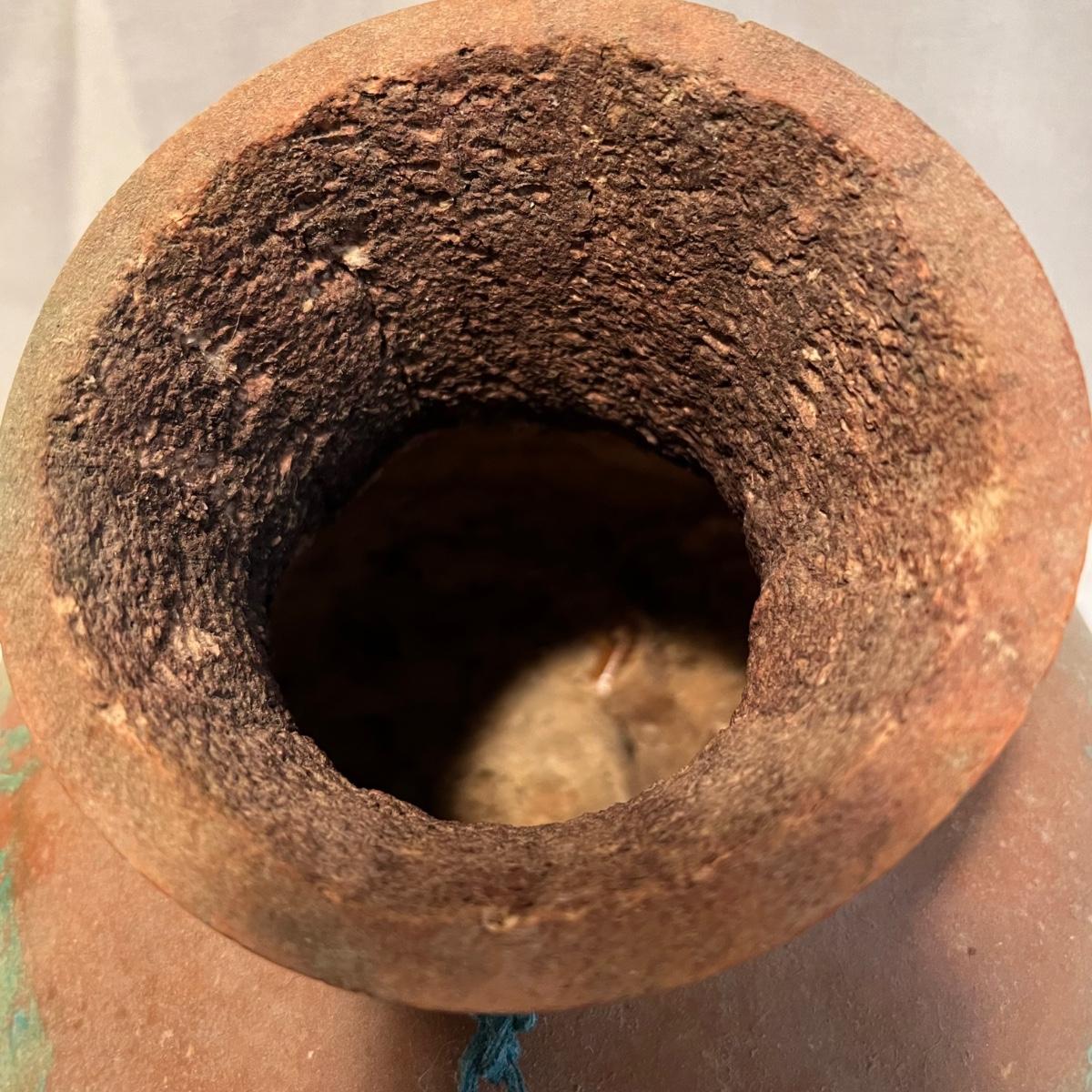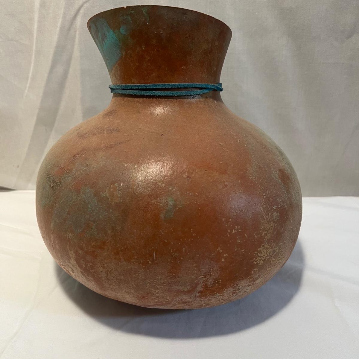Both these items appear to be handcrafted. The gourd has been carved into a vase and has an attractive teal paint and lace design around the collar. It is pen signed, see photo. The straw broom has a thin rope to hang it to display. Gourd measures 13”D x 11”H. Broom is 45” long.