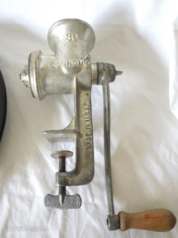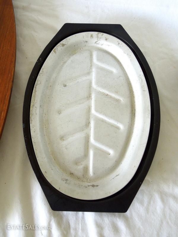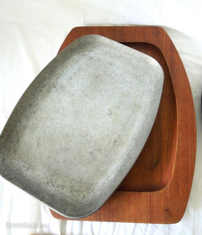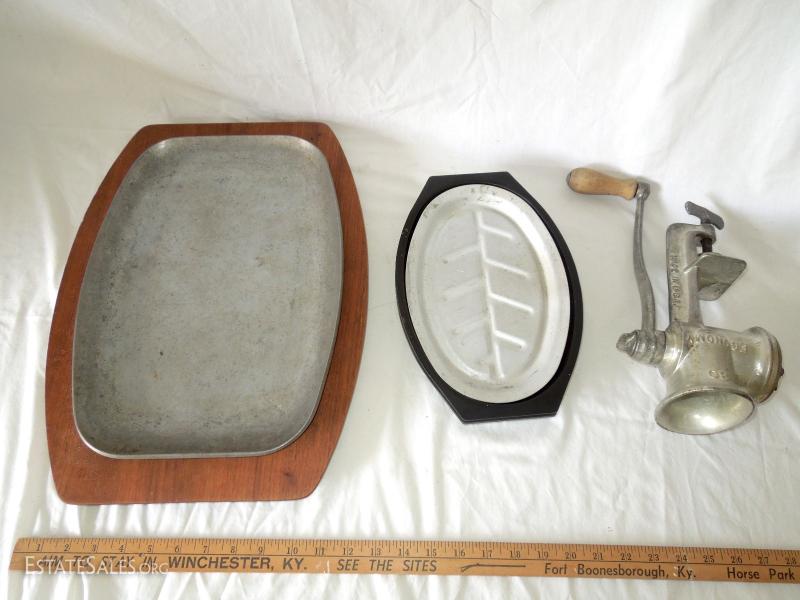 Wood and pewter steak platter 18" marked Gladmark. Nordic ware steak plate, 10" long Economy brand meat grinder with wooden handle. Clean. Meat grinder is slightly sticky.