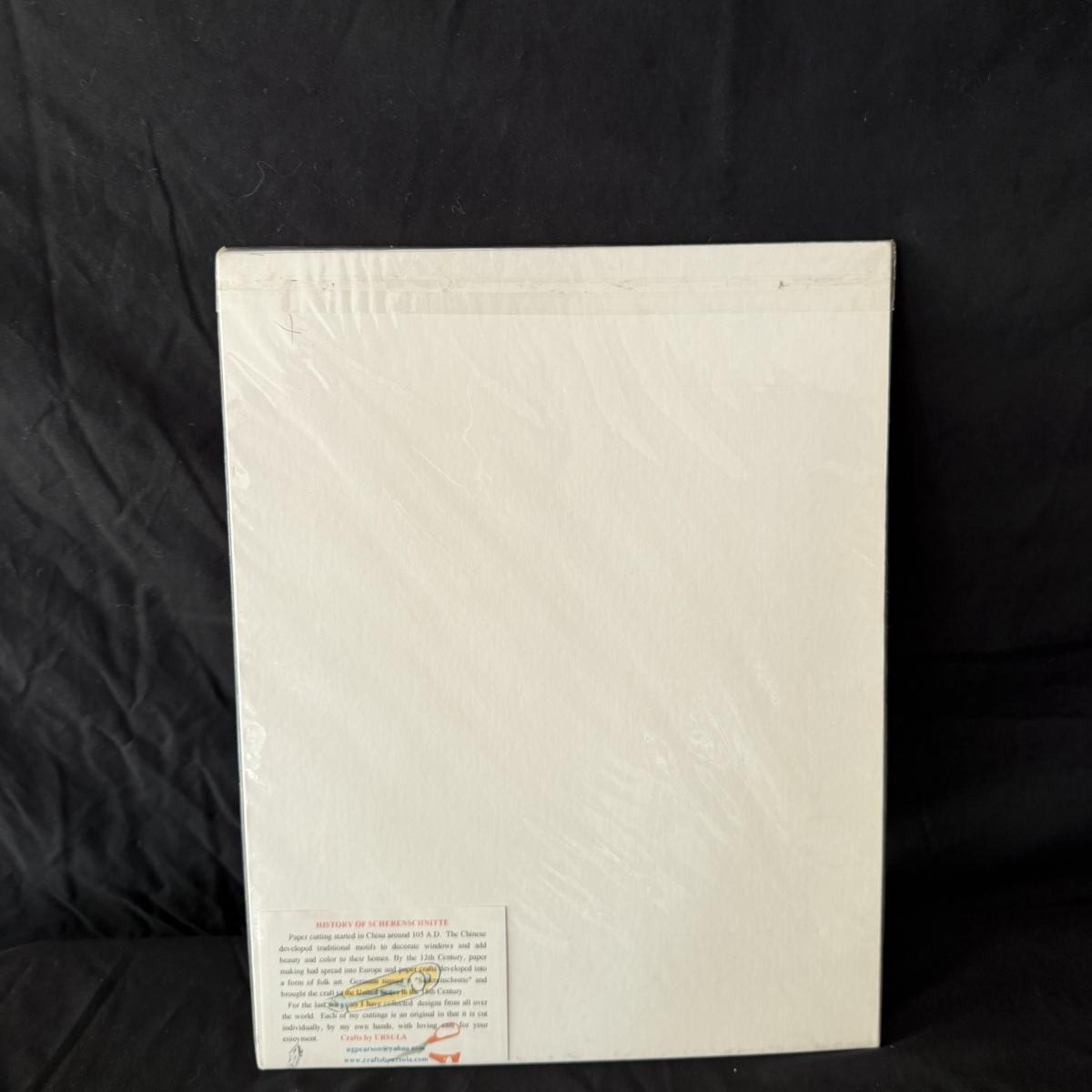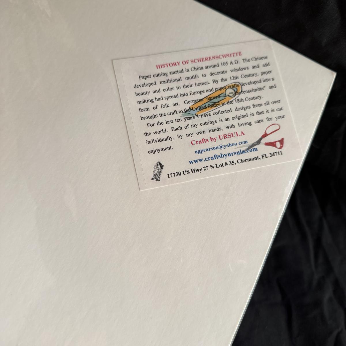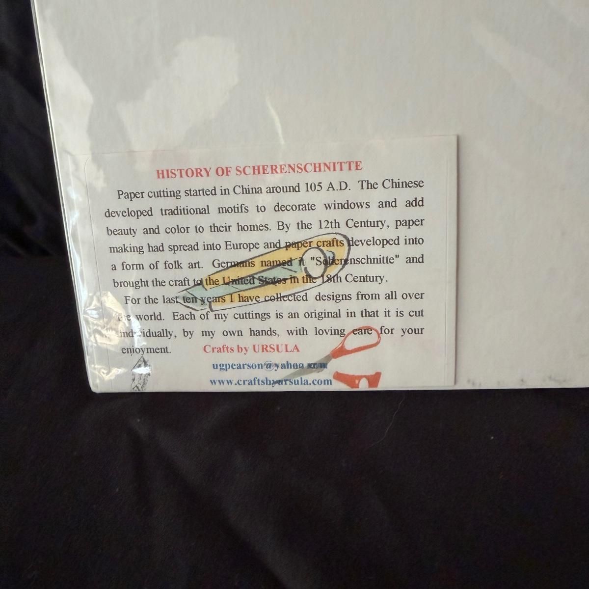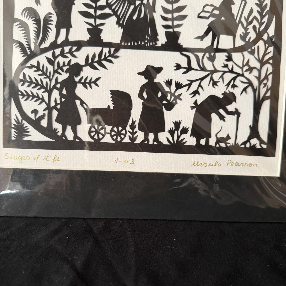 Lot includes two pieces of hand cut paper art signed by Ursula Pearson. Also includes a plastic frame that measures 13” x 16”H.