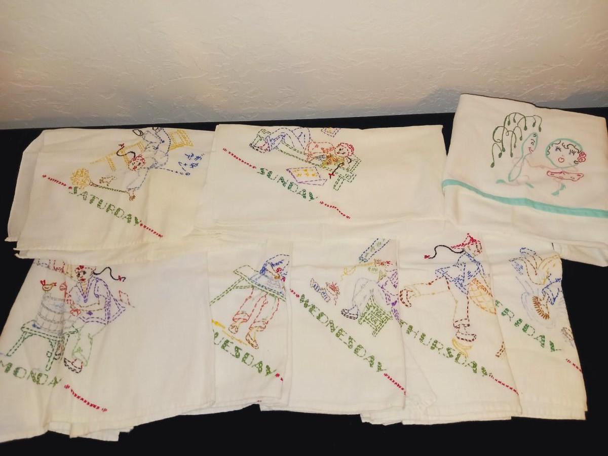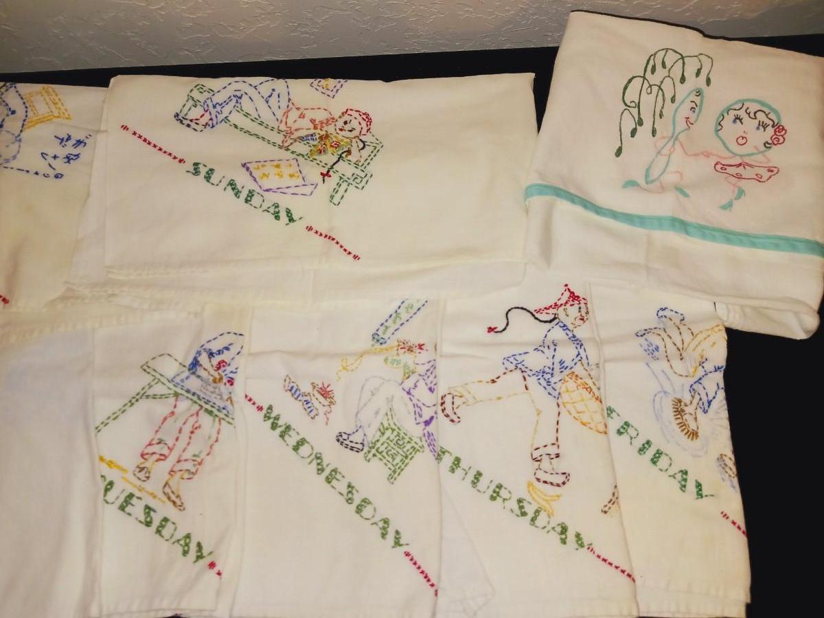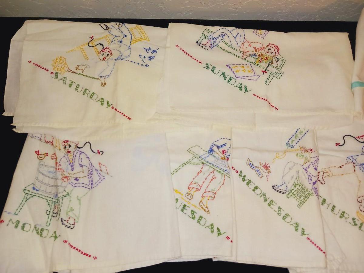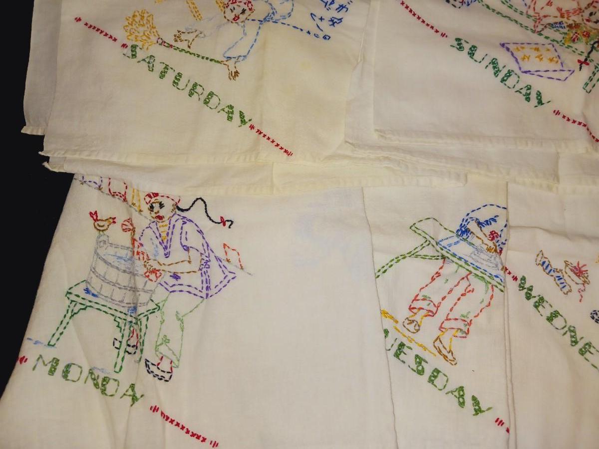 HAND EMBROIDERED FLOUR SACK DAYS OF THE WEEK DISH TOWELS