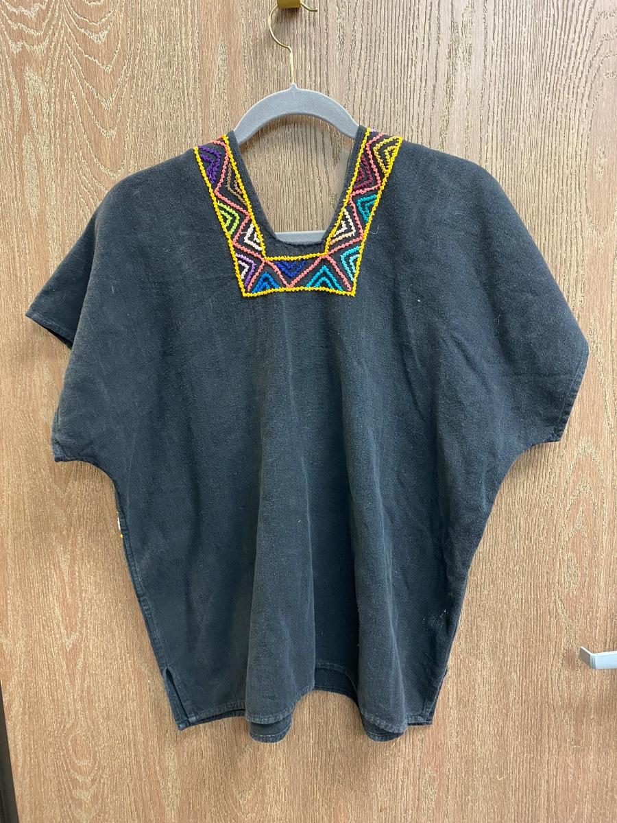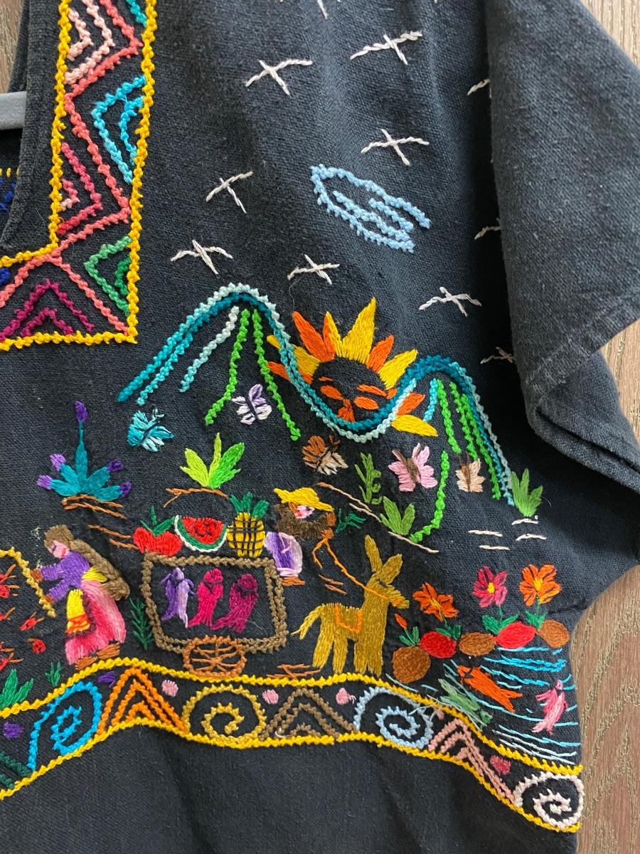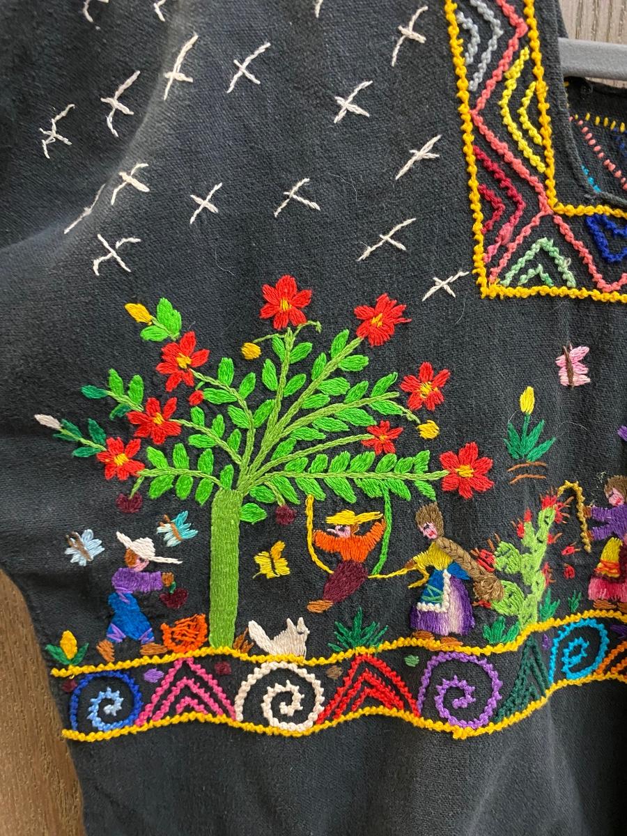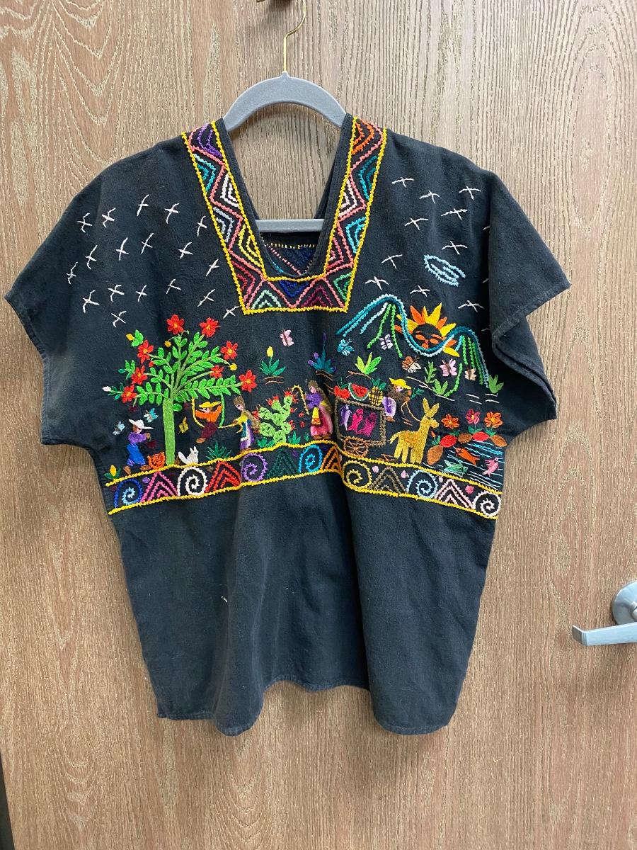 Hand embroidered blouse from Mexico. Depicts people living life. Some fade to the material but the embroidery work is in good vintage condition. Maybe a size medium.