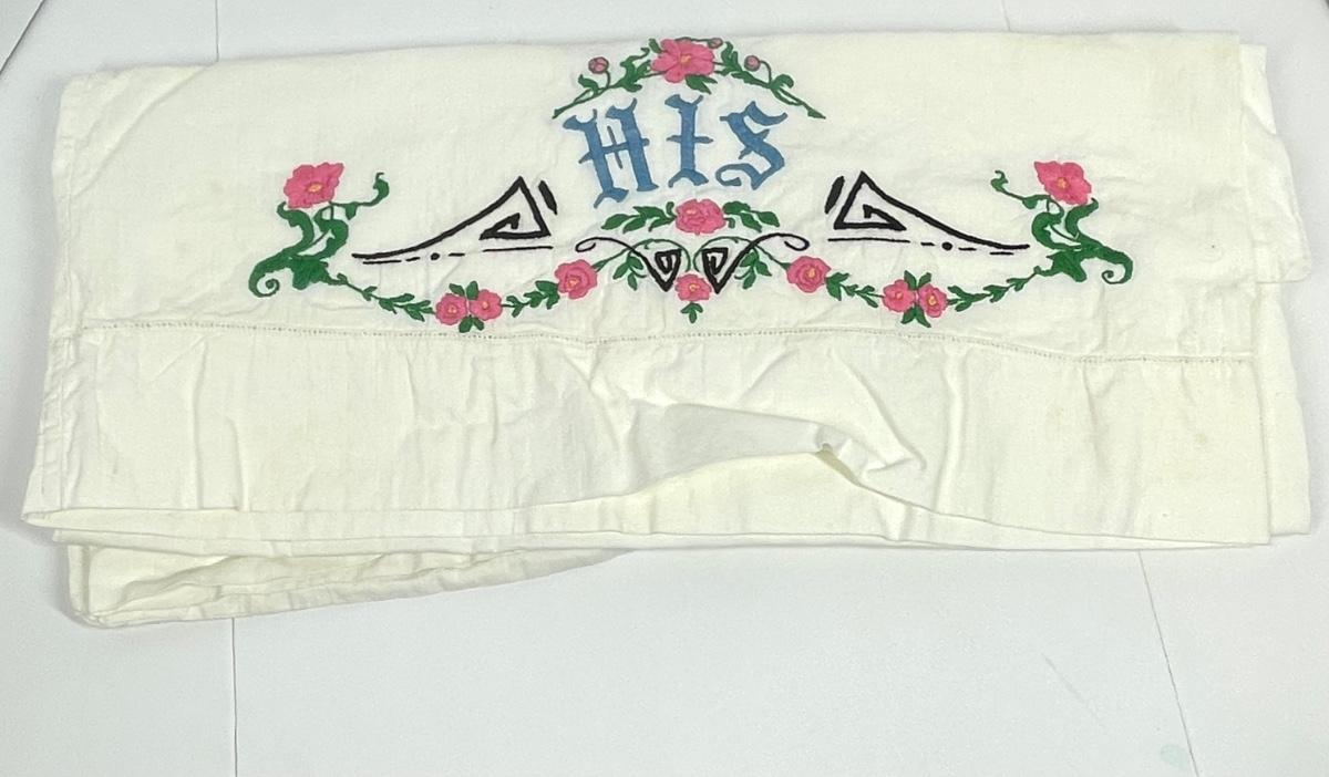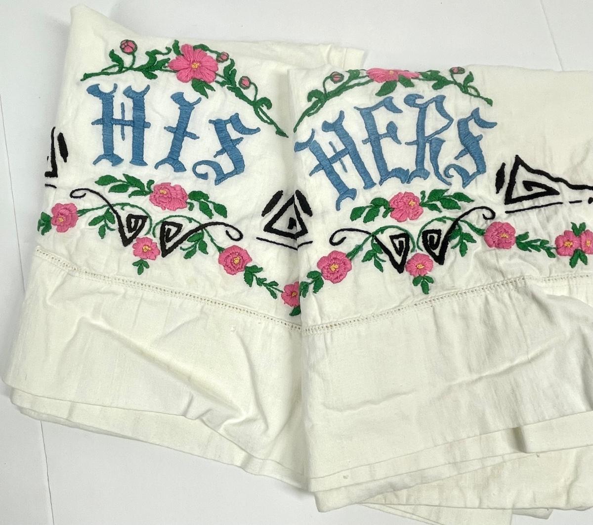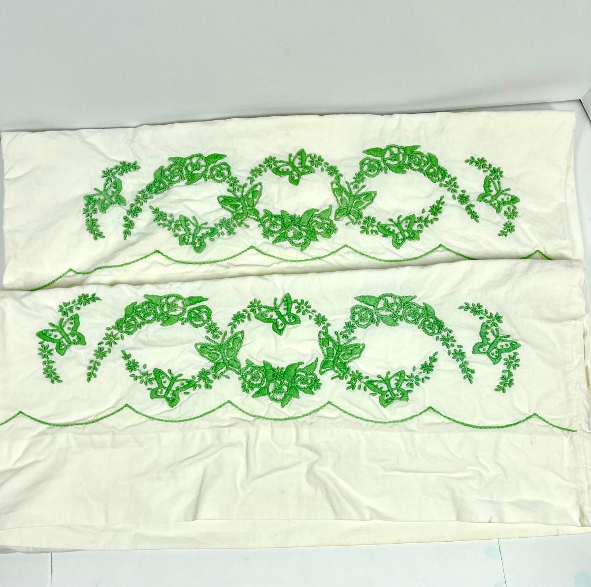 These are just darling! Two sets of pillowcases with marvelous handiwork!! These have some yellowing and show age. Someone may be able to remedy the yellowing. The embroidered parts are in nice condition!