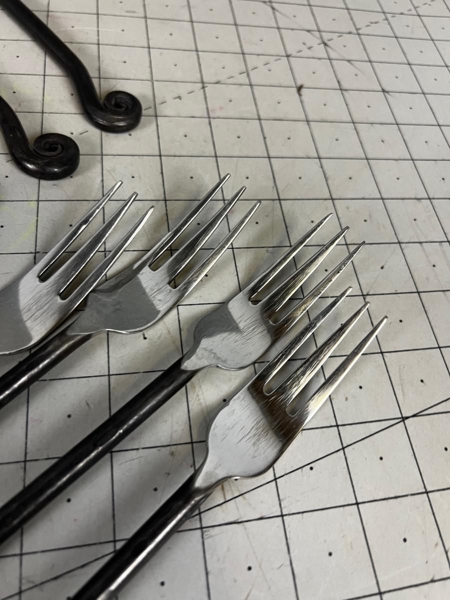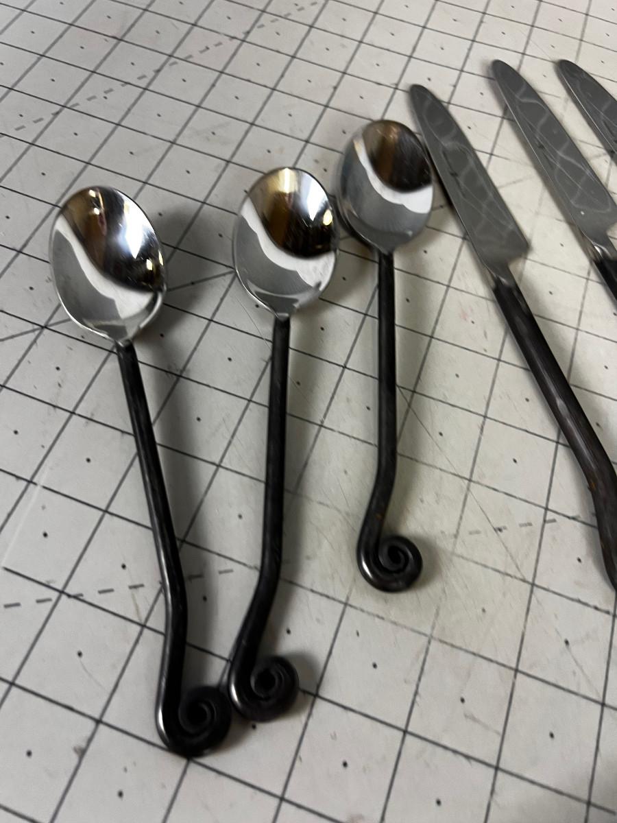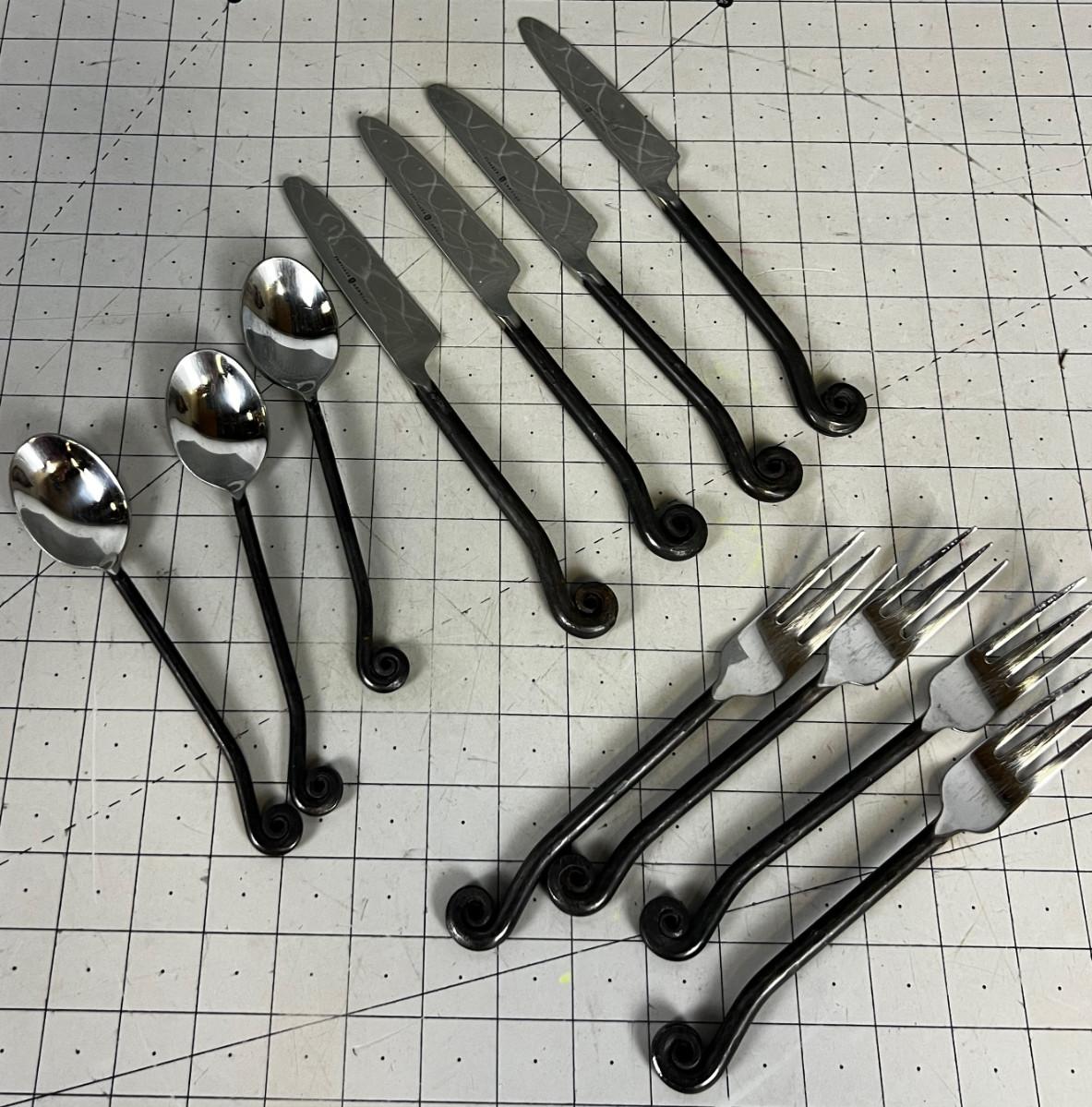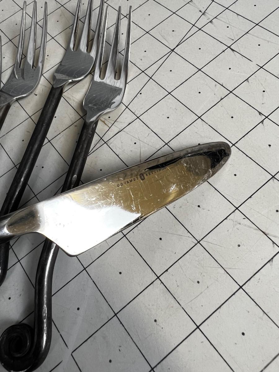 Hand Crafted 4 Forks 4 Knives and 3 Spoons. Labeled Gourmet Sittings.