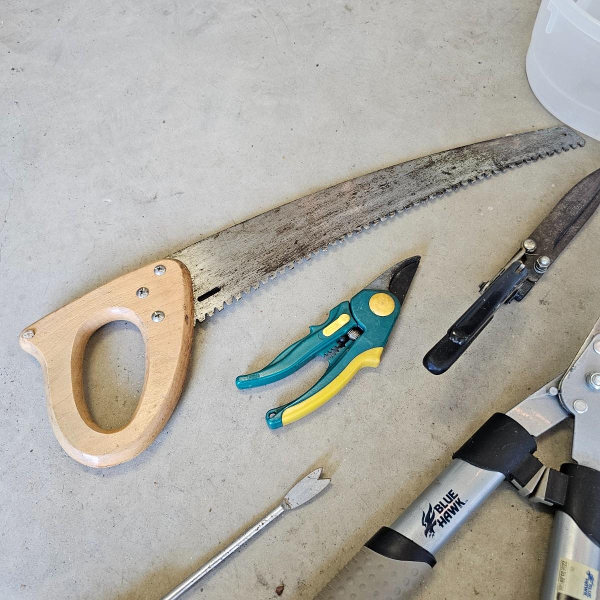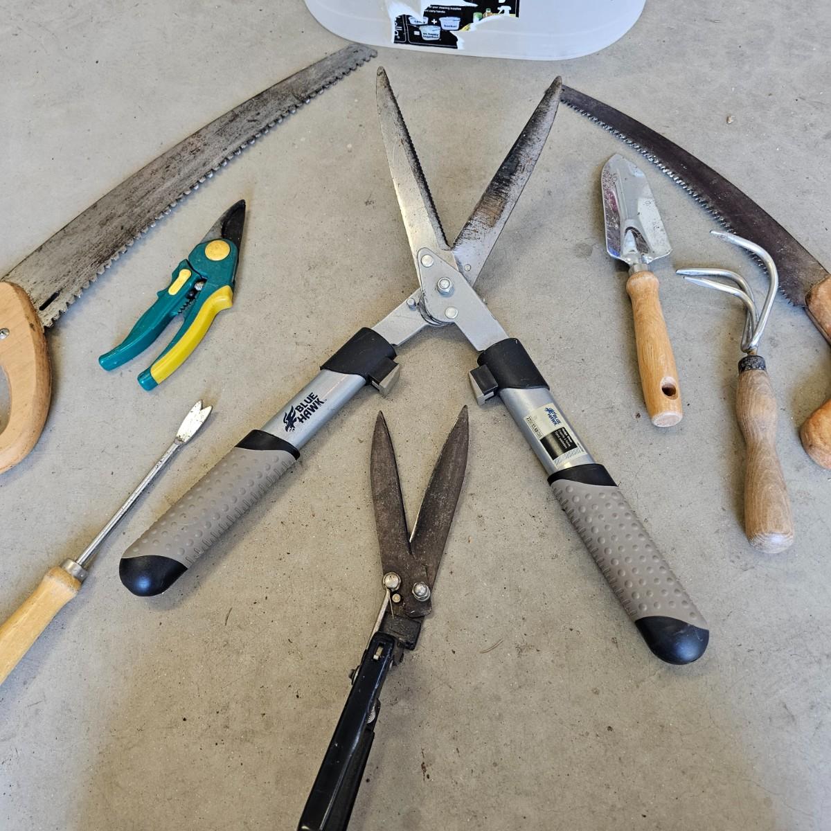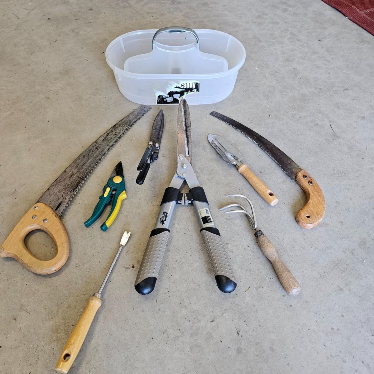 Two saws, rake, trowel, clippers, digger, pruner and a pair of Blue Hawk 8" loppers. Carry caddy included. See photos for details. Shipping available.