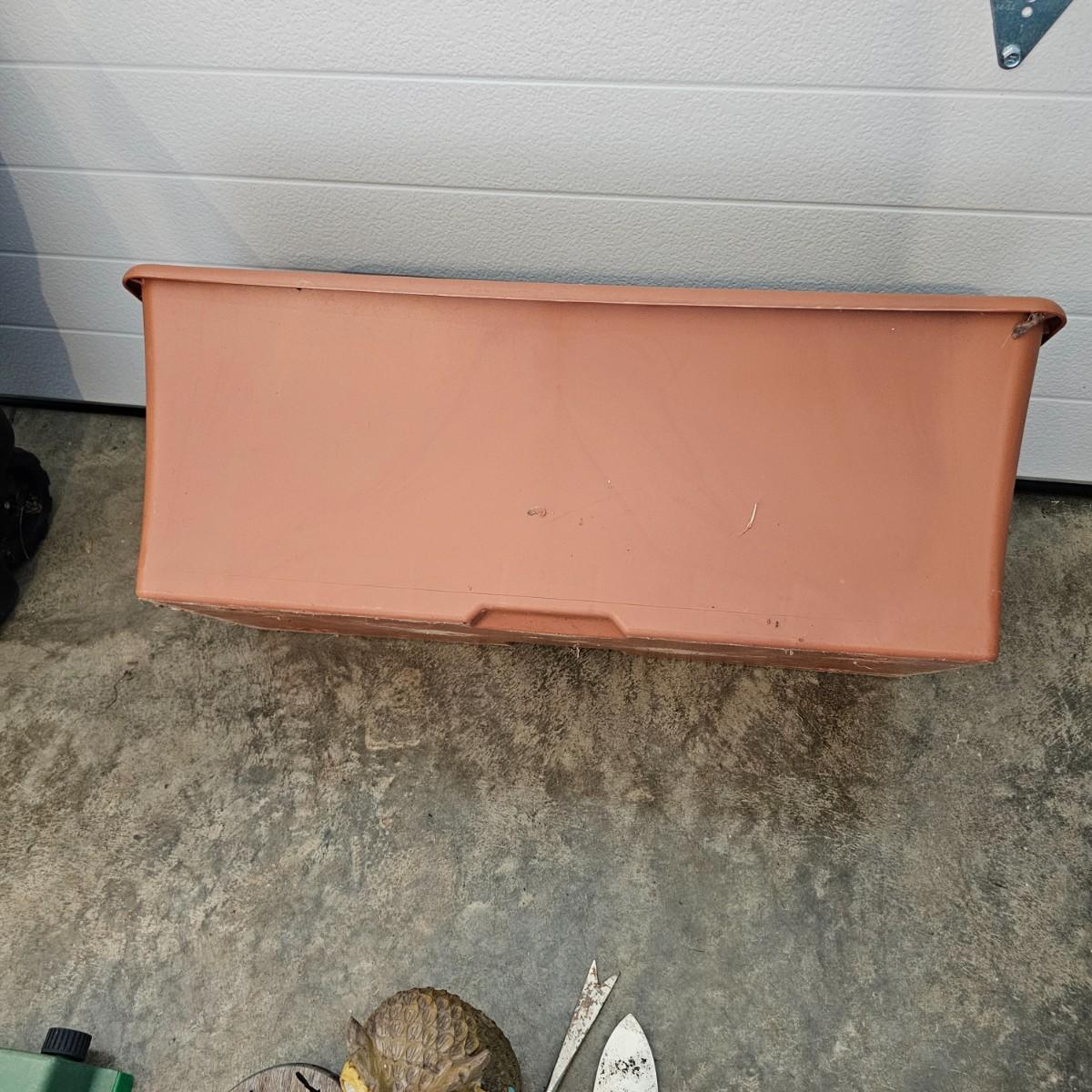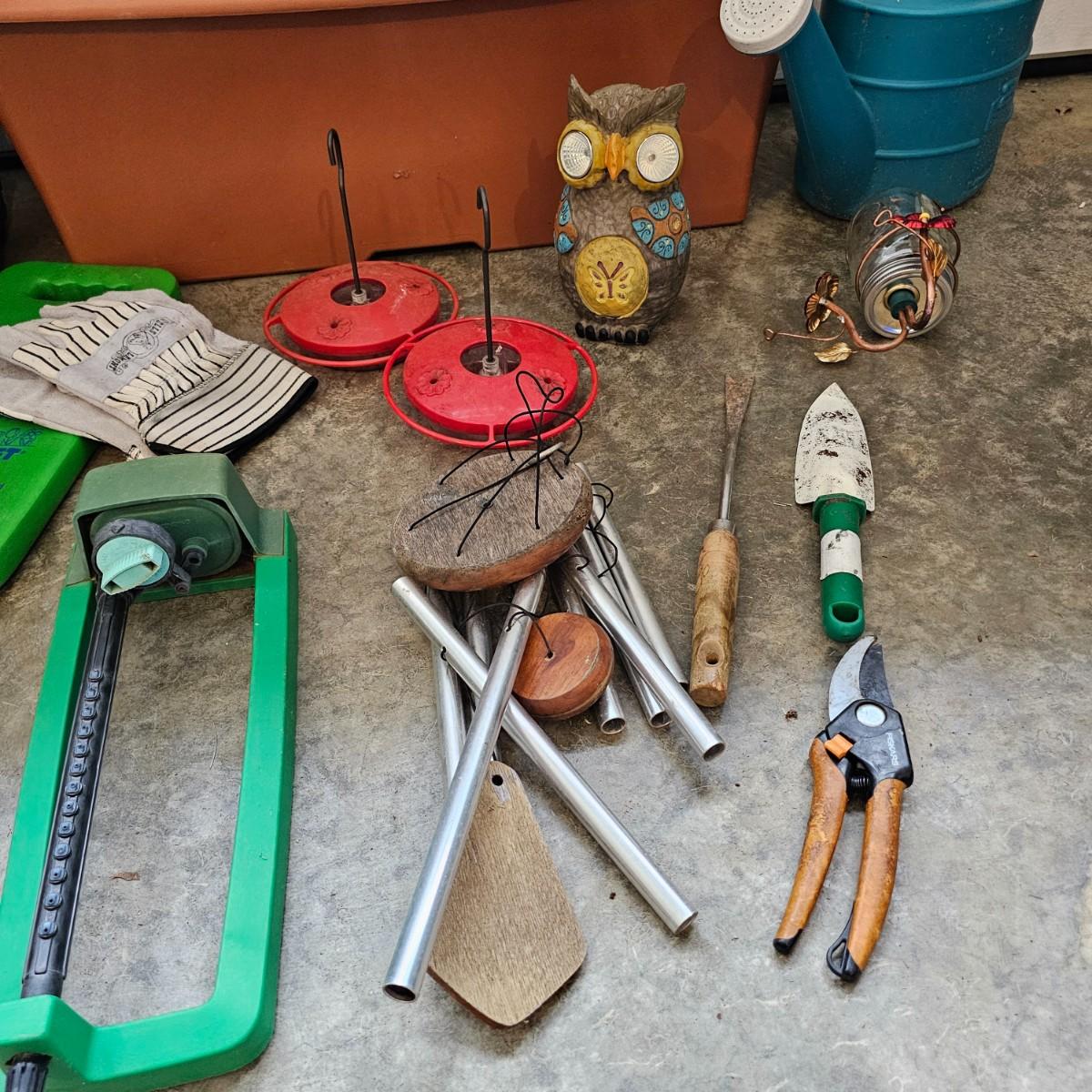 A selection of items for the garden and more. Clippers, trowel, one gallon pump sprayer, watering can, more. Different types of humming bird feeders, a planting system and a carryall. Brown rectangular planter is 29" W x 14"D x 10"H. Rolling cart is 20.5"W x 23"D x 35"H. Most items used. See photos for details. Local pickup only.