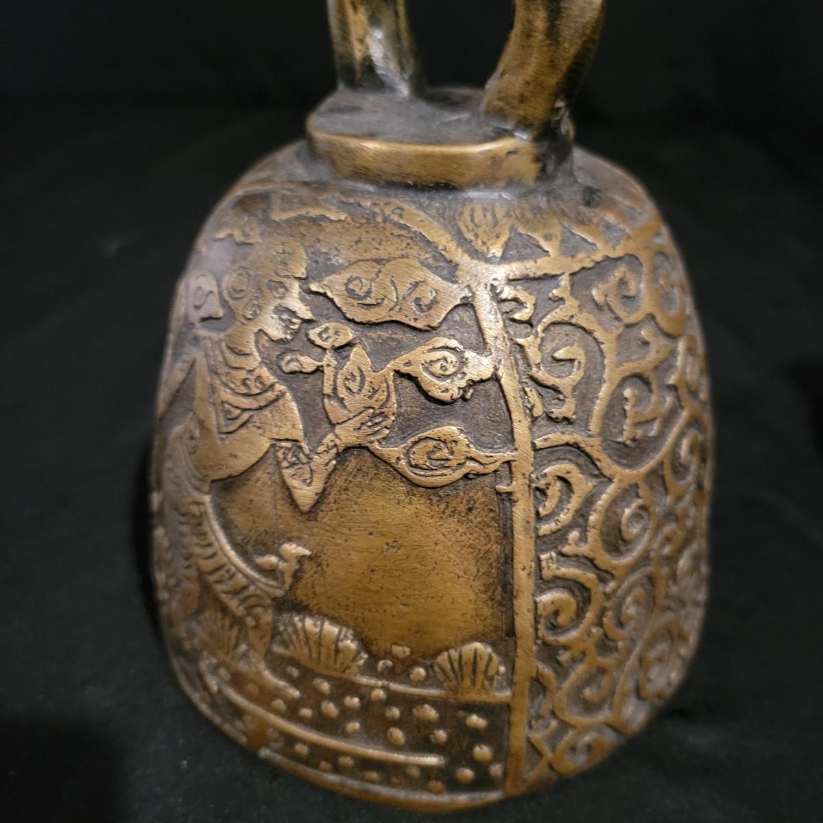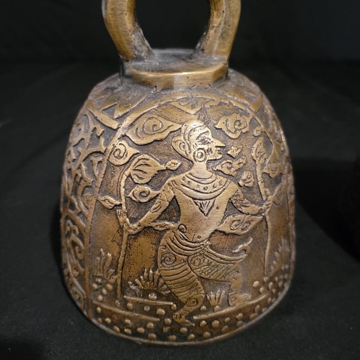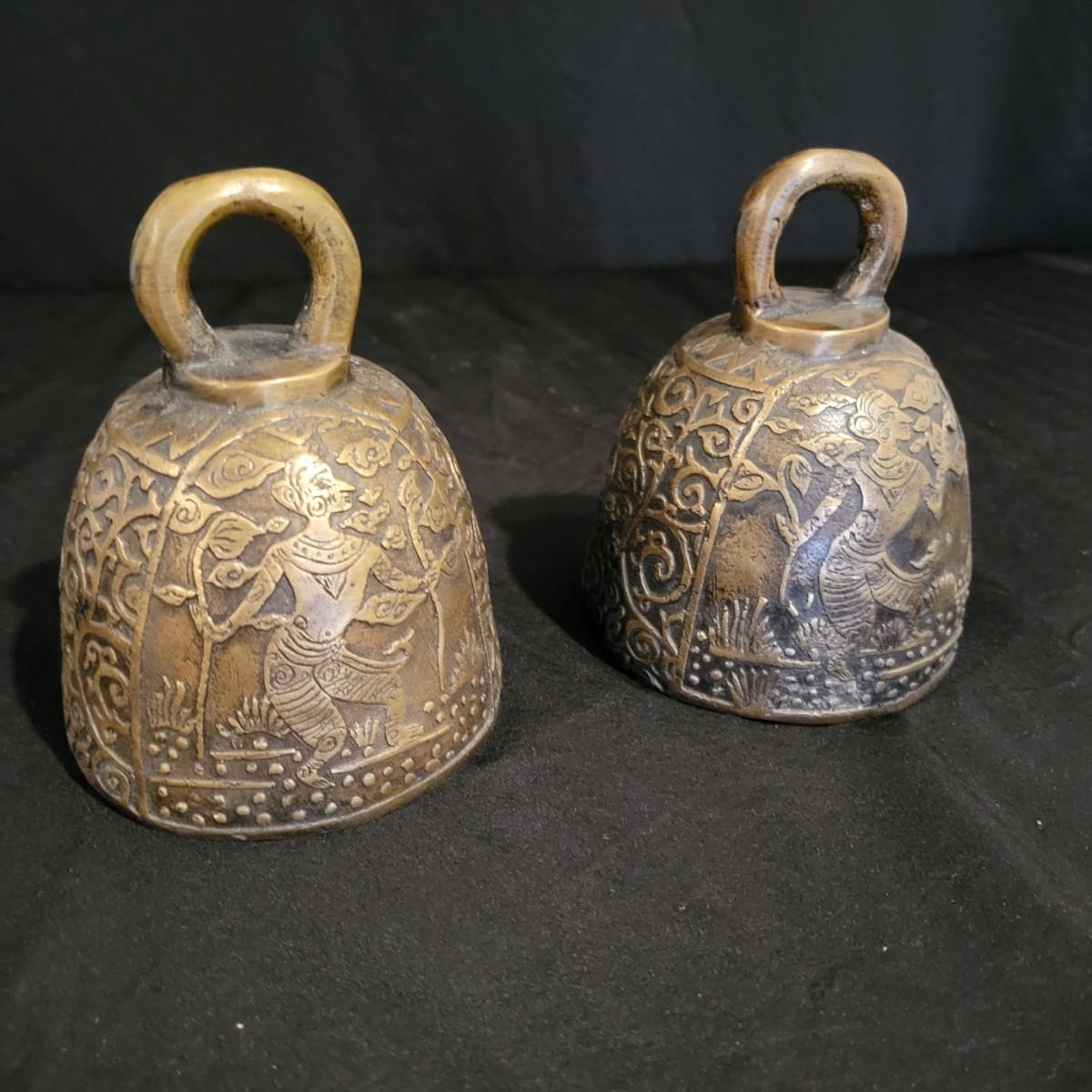 A pair hand held bells that are cast and appear to have Hindu themes. They measure approximately 4.5"D x 5.5"H. Shipping available