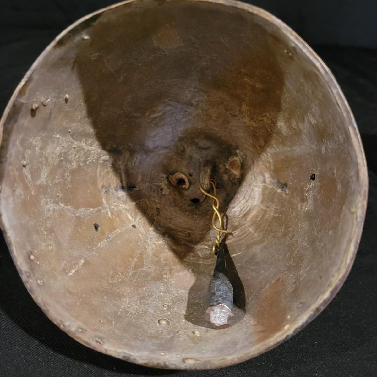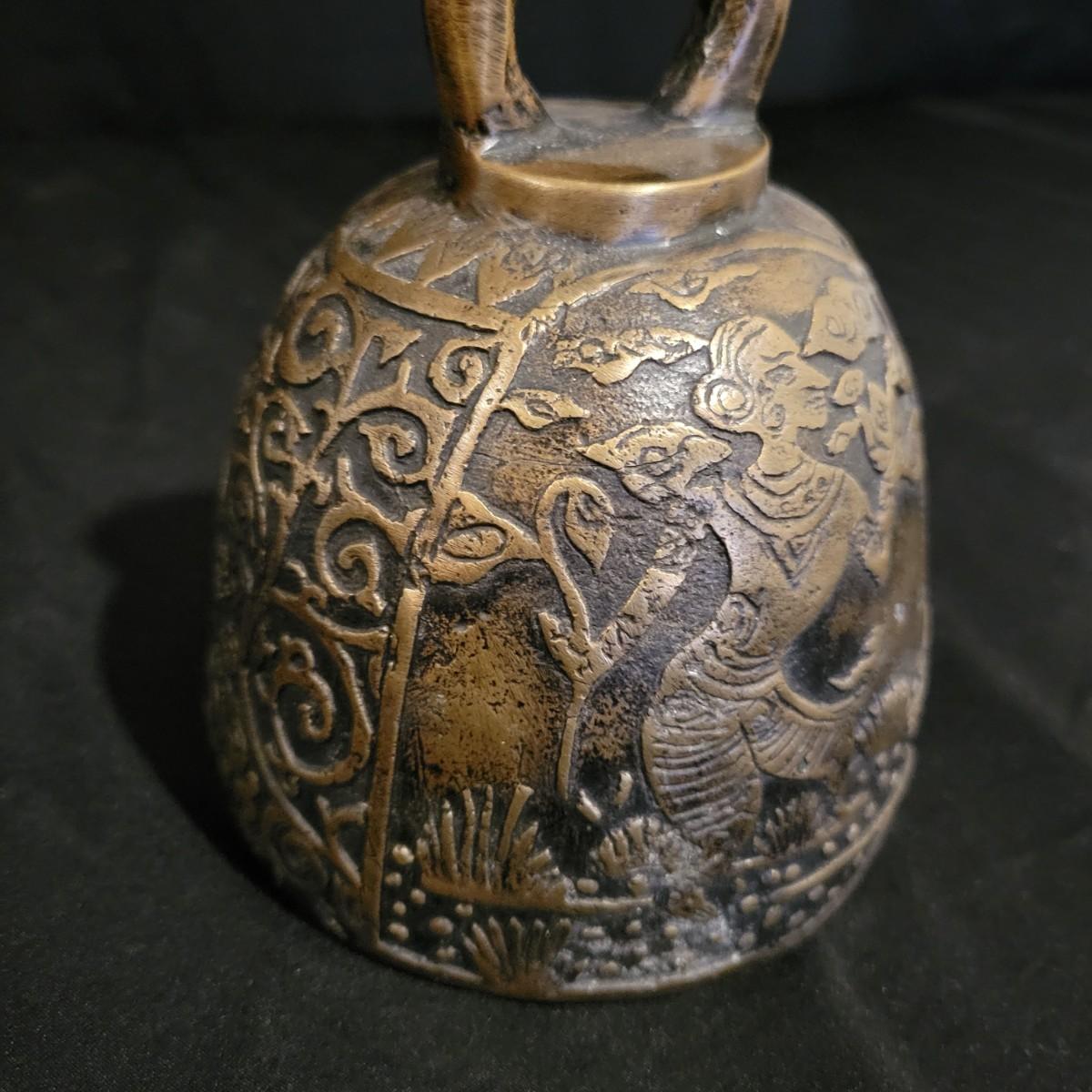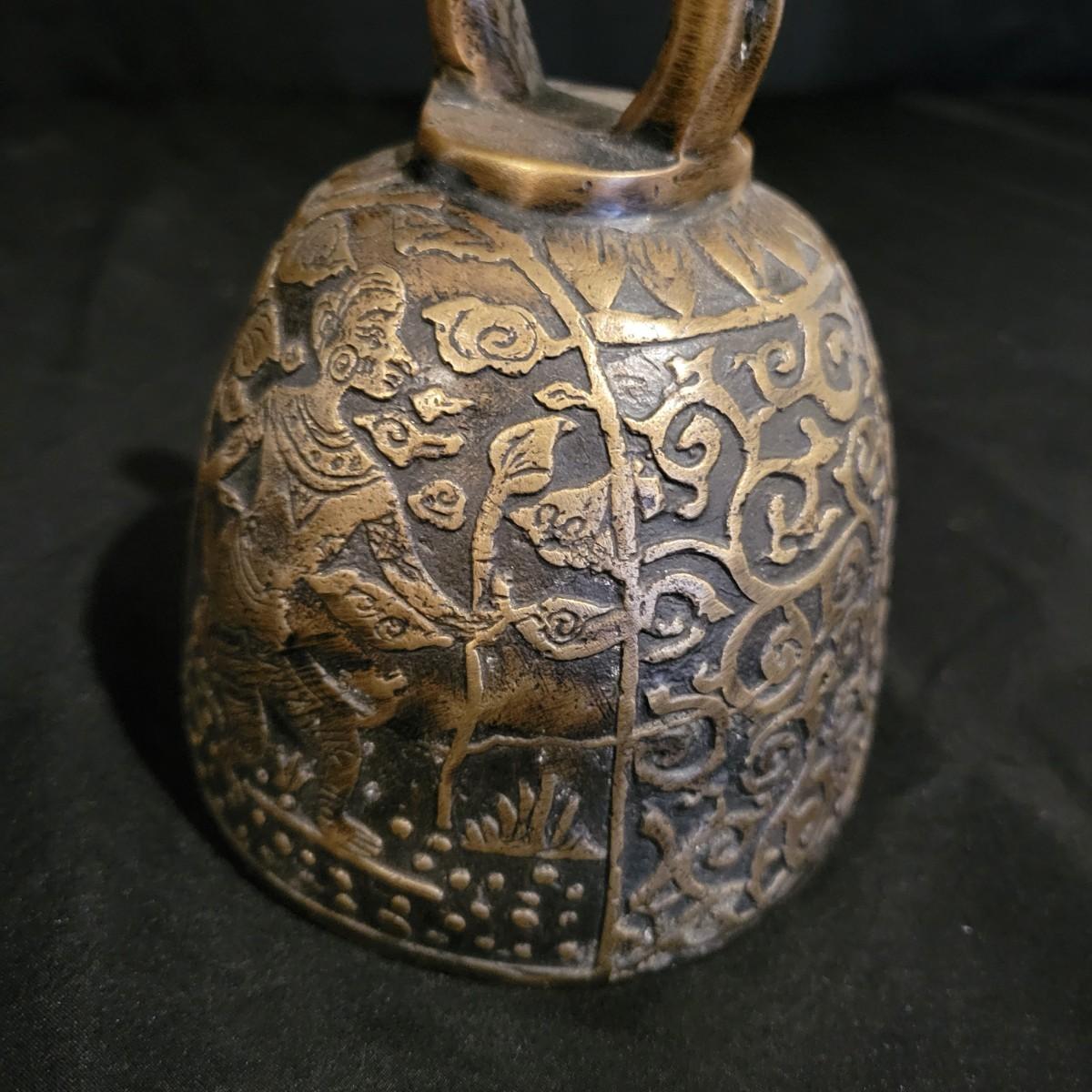 A pair hand held bells that are cast and appear to have Hindu themes. They measure approximately 4.5"D x 5.5"H. Shipping available