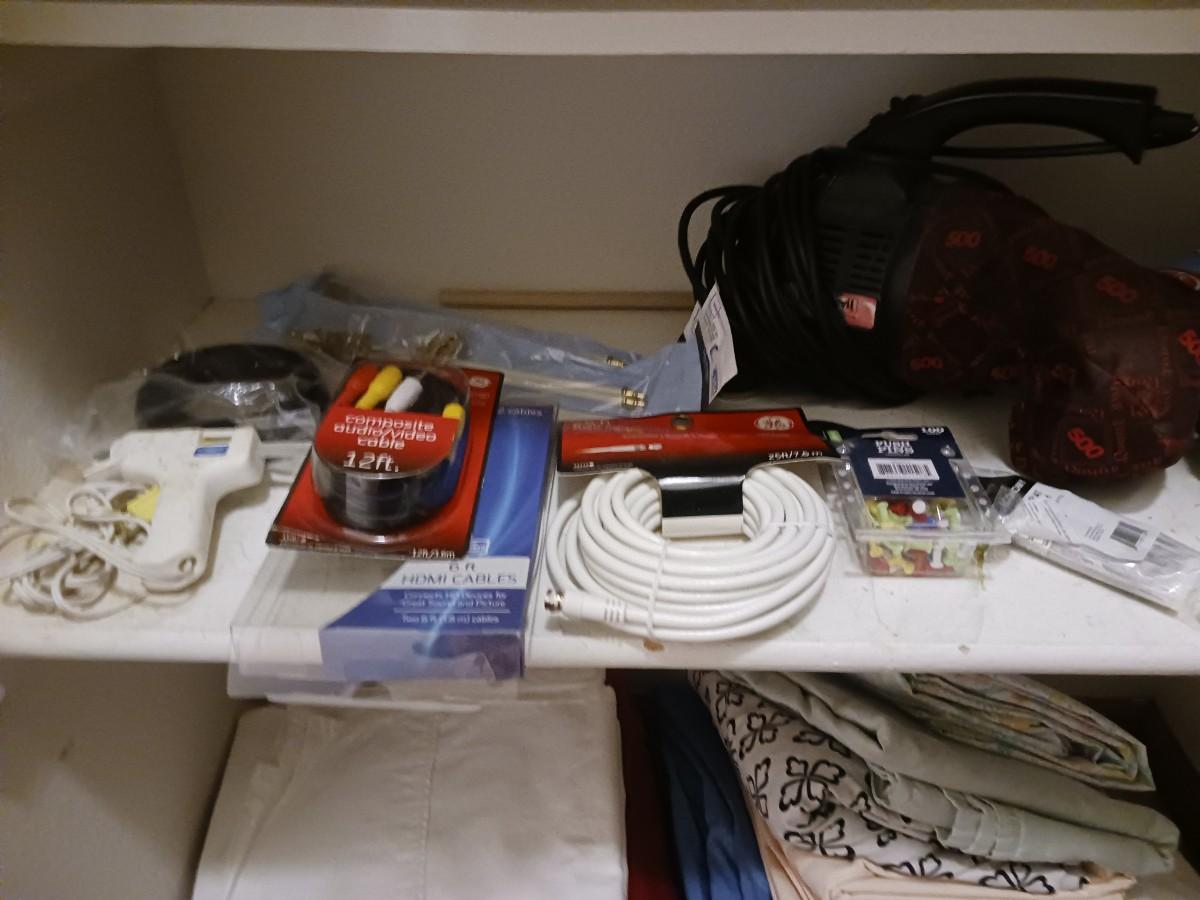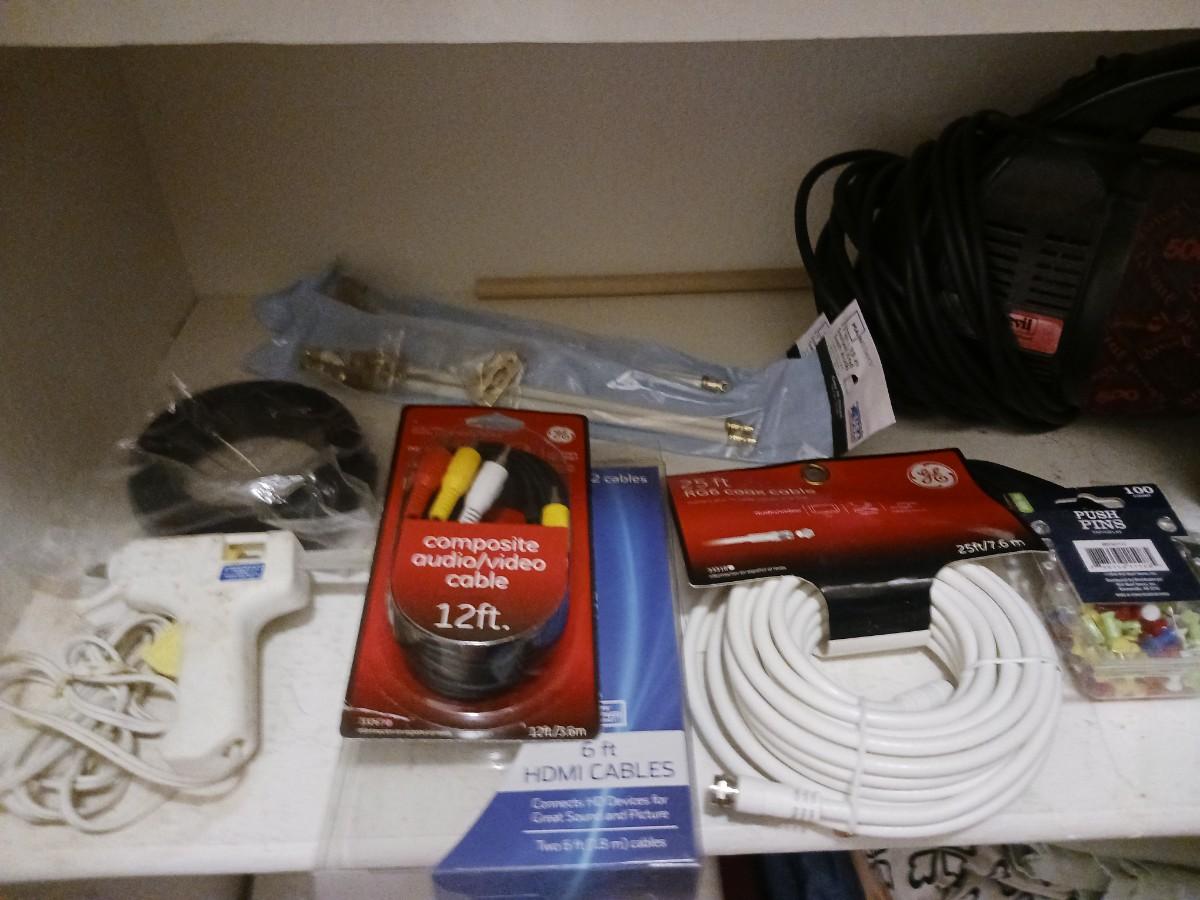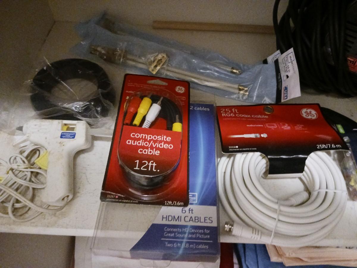 HAND HELD DIRT DEVIL VACUUM, HOT GLUE GUN, AUDIO VIDEO CABLES AND MORE!