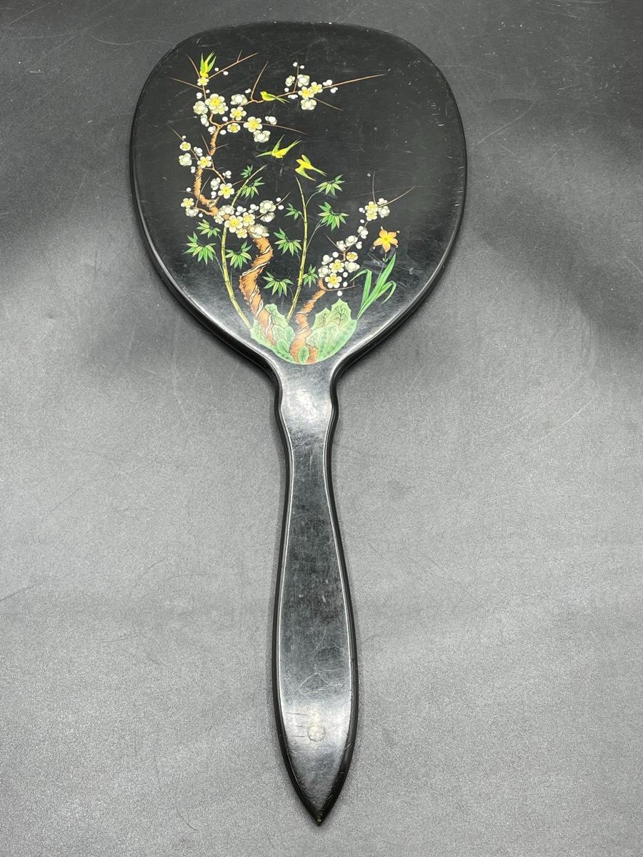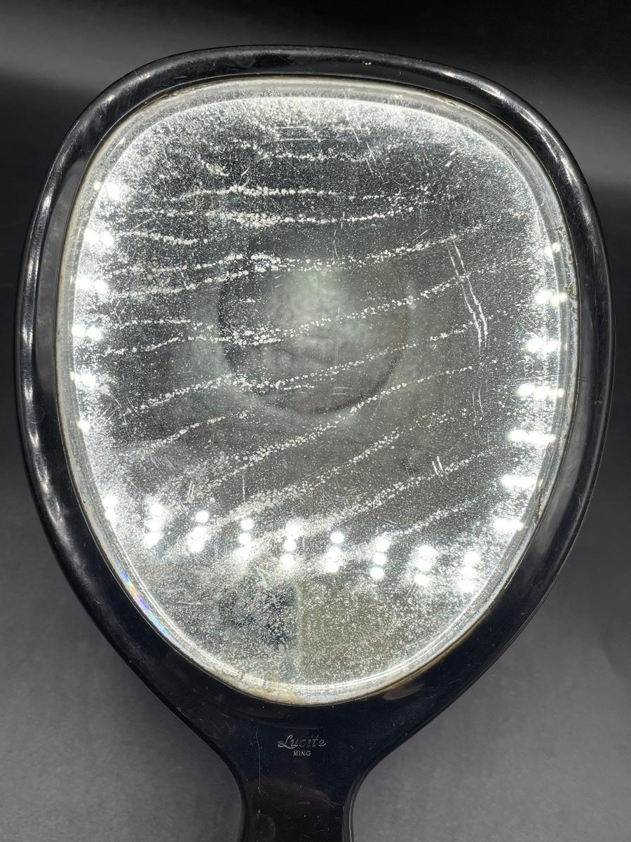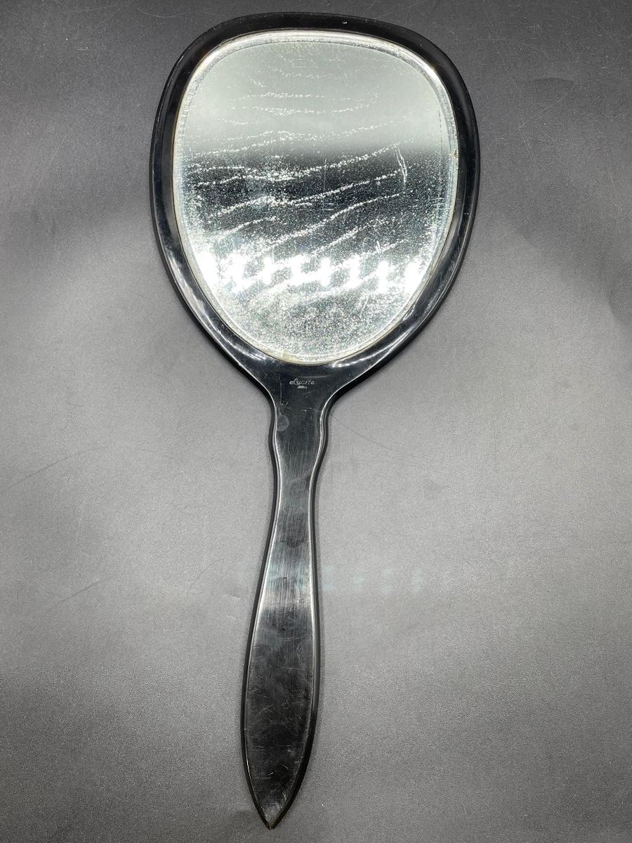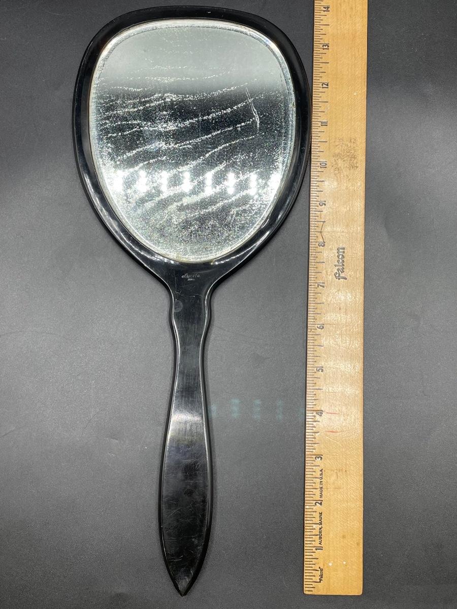 Mirror is in a used condition. It has noticeable scratches on the glass and is a little hard to see yourself. Although there is a lot of scratches, it is still good to use. The mirror is approximately 14” tall.