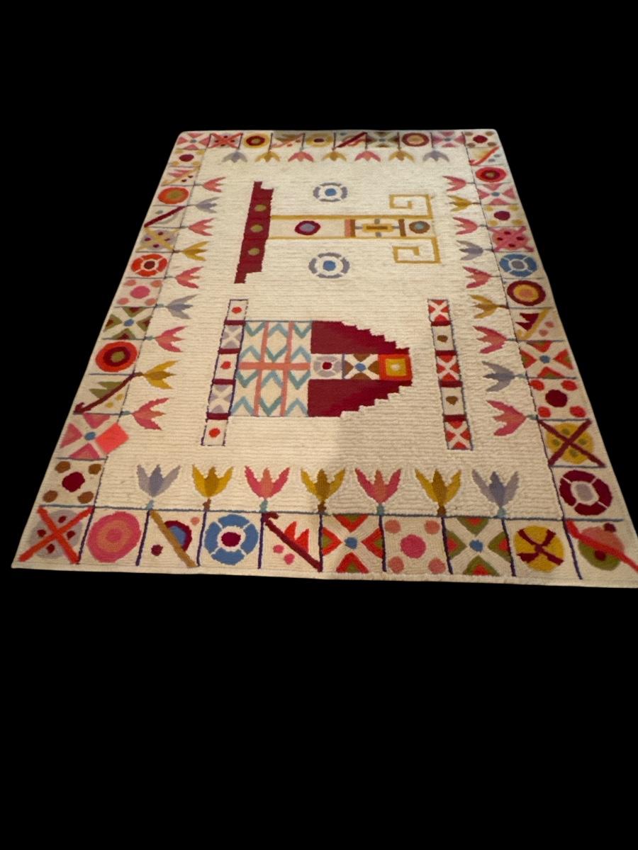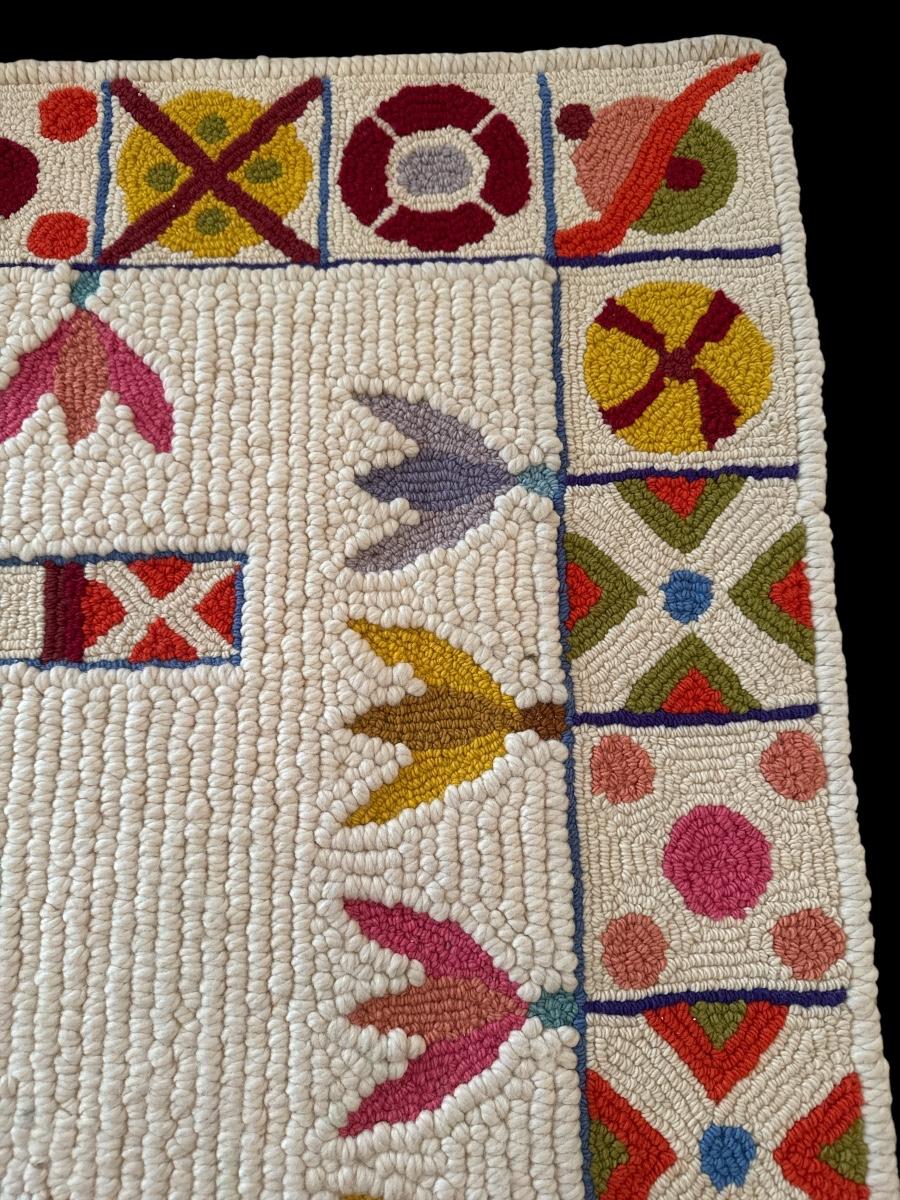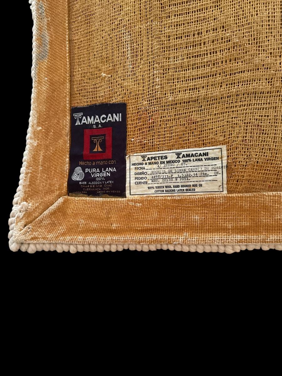 Vibrant and whimsical hand-hooked wool rug by Tamacani, S.A., crafted in Mexico using 100% virgin wool with a cotton and latex-sealed backing. Features bold geometric and floral motifs in rich reds, pinks, yellows, blues, and greens on a cream background. Labeled “Modelo de Posito” with date marked 1999. Excellent craftsmanship and condition—perfect as a statement piece or colorful accent.