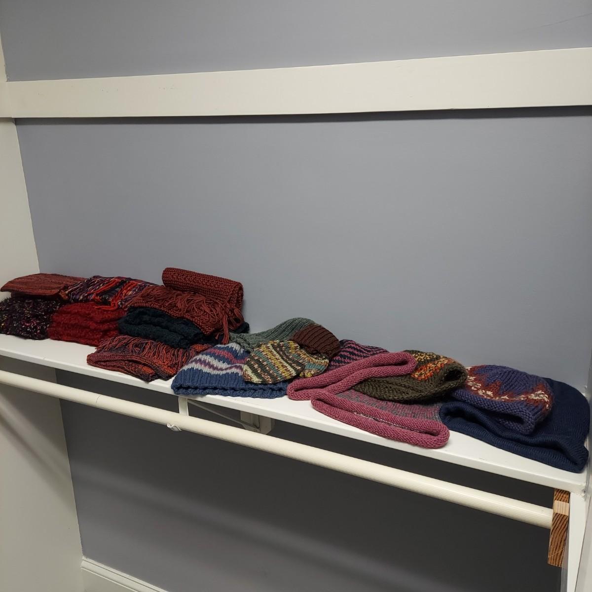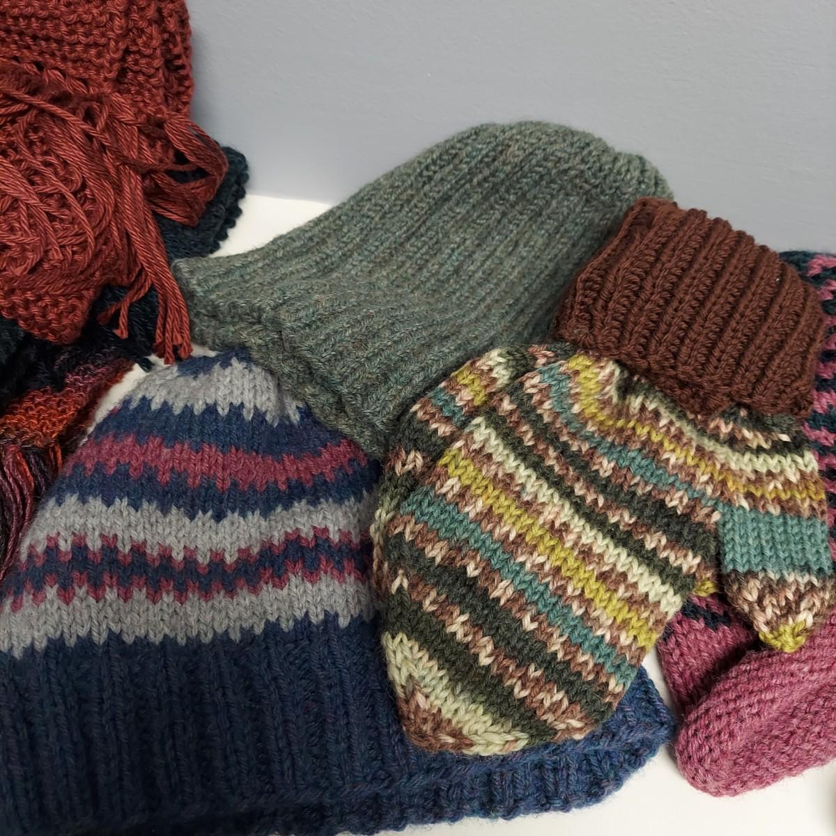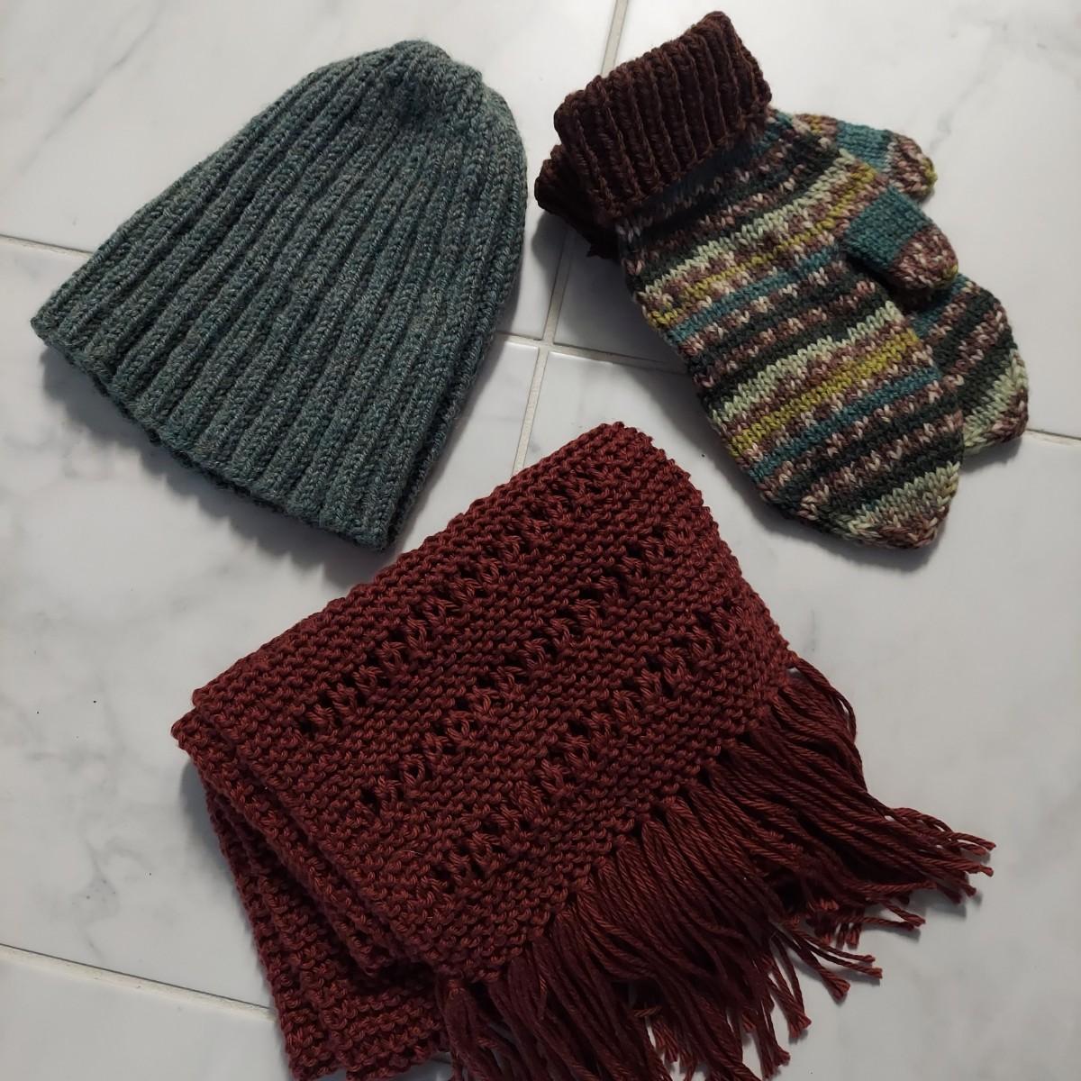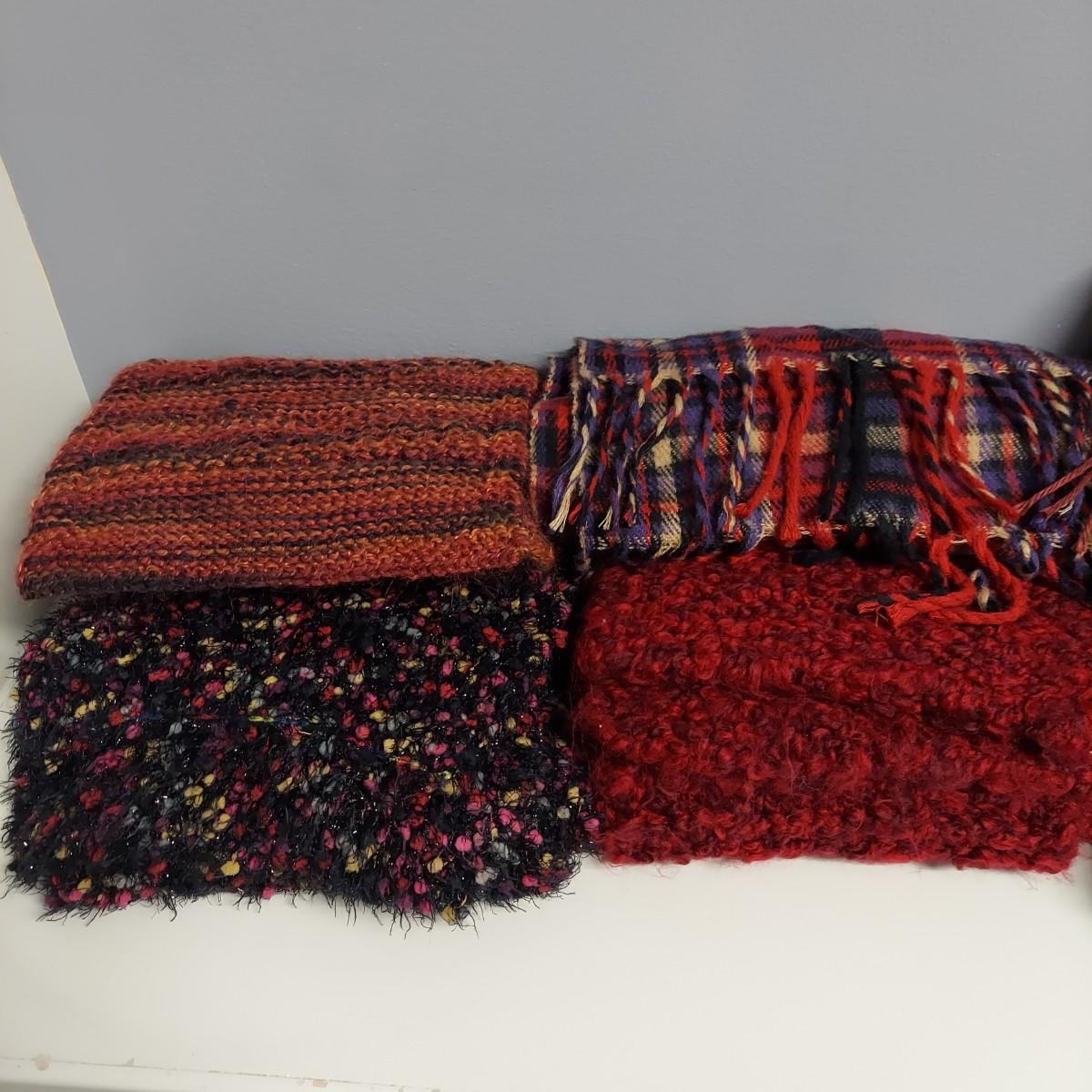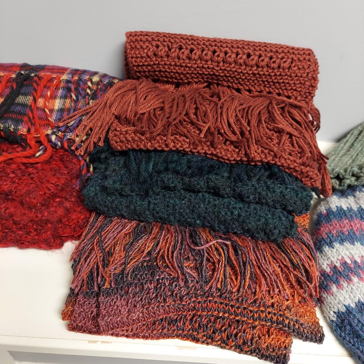 Lot includes seven scarves, six hats and one pair of mittens. Two scarves and one hat have tags. Otherwise, most items appear to be handmade knits. The shortest orange stripe scarf is 48” long. The longest green scarf is 68” long. Please see photos for details. Shipping available.