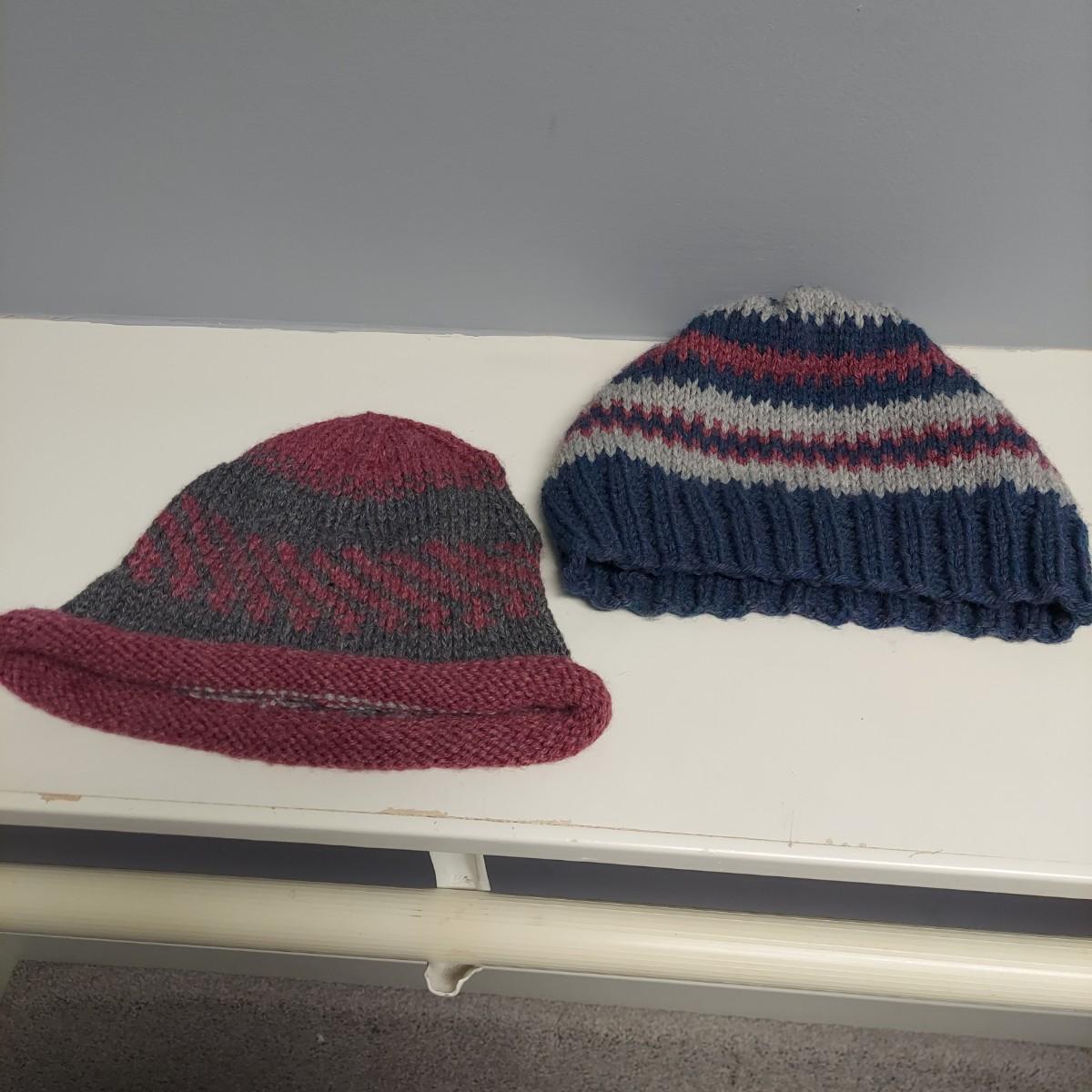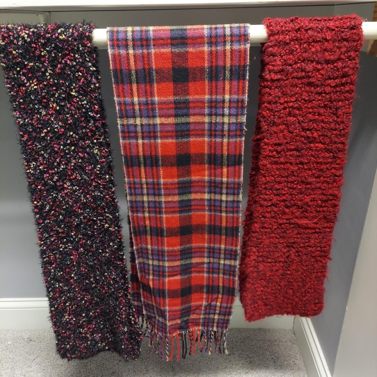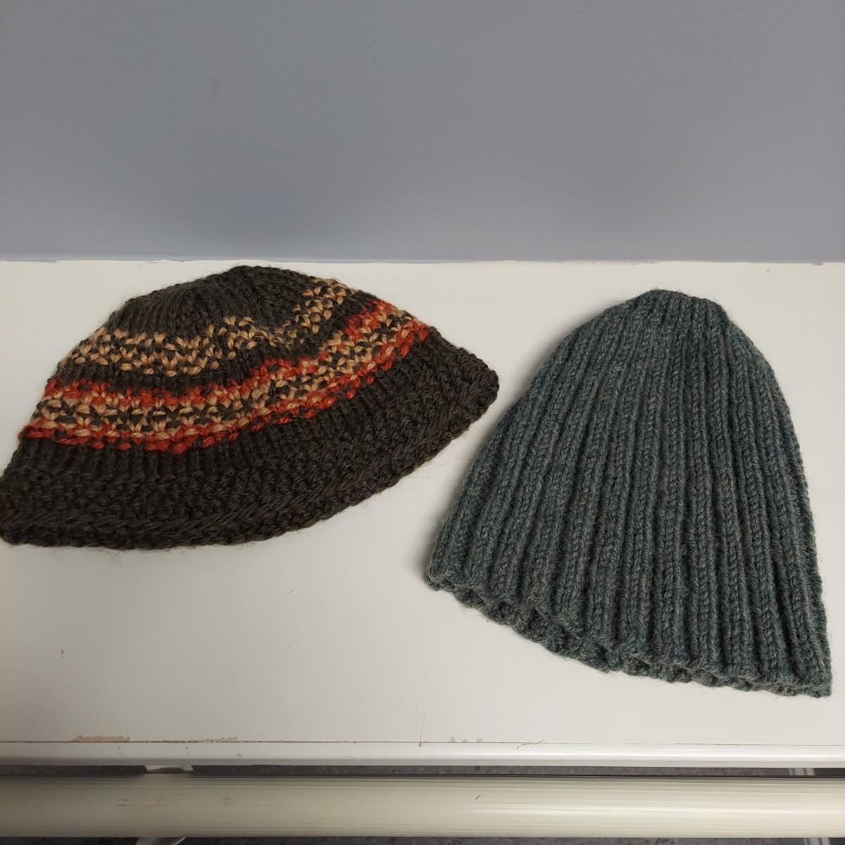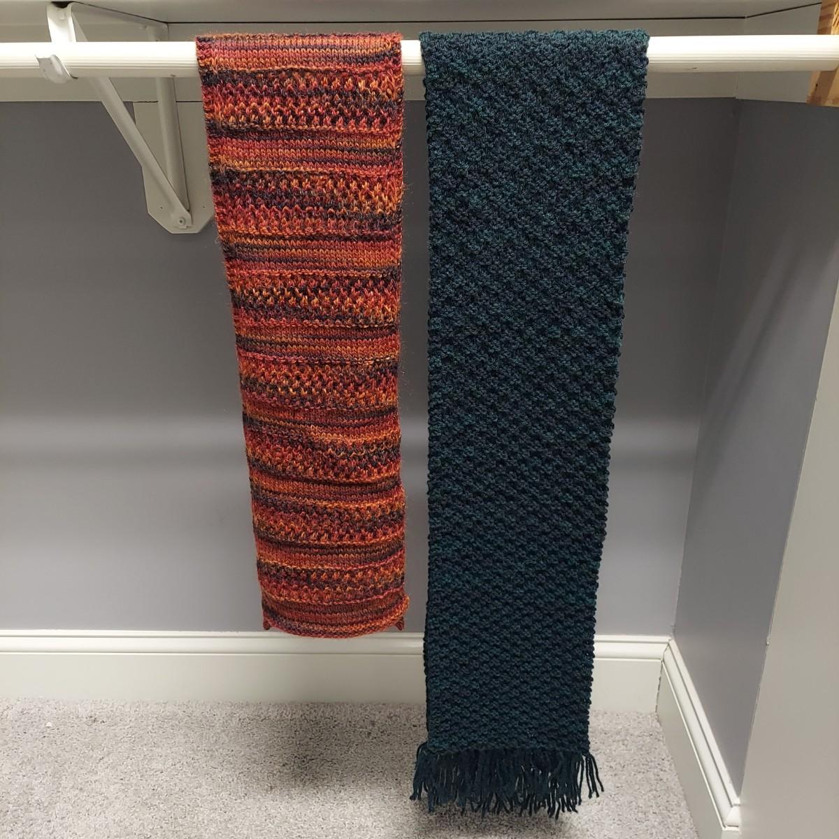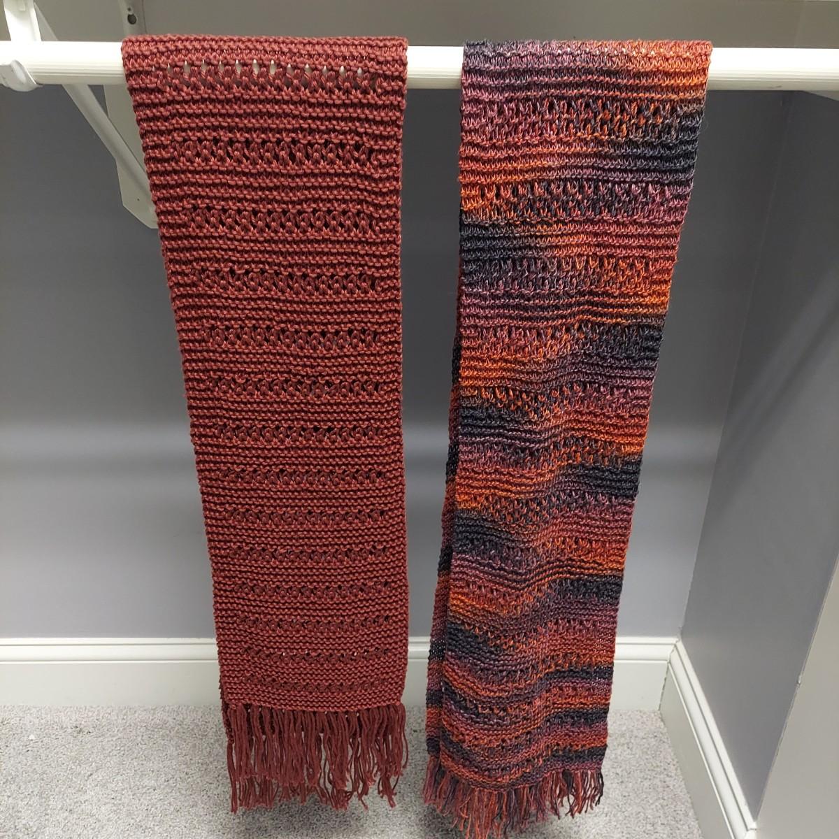Lot includes seven scarves, six hats and one pair of mittens. Two scarves and one hat have tags. Otherwise, most items appear to be handmade knits. The shortest orange stripe scarf is 48” long. The longest green scarf is 68” long. Please see photos for details. Shipping available.