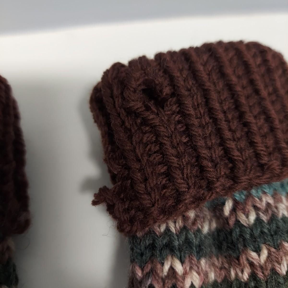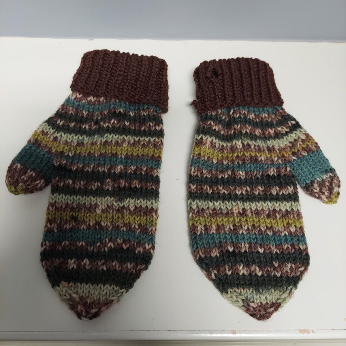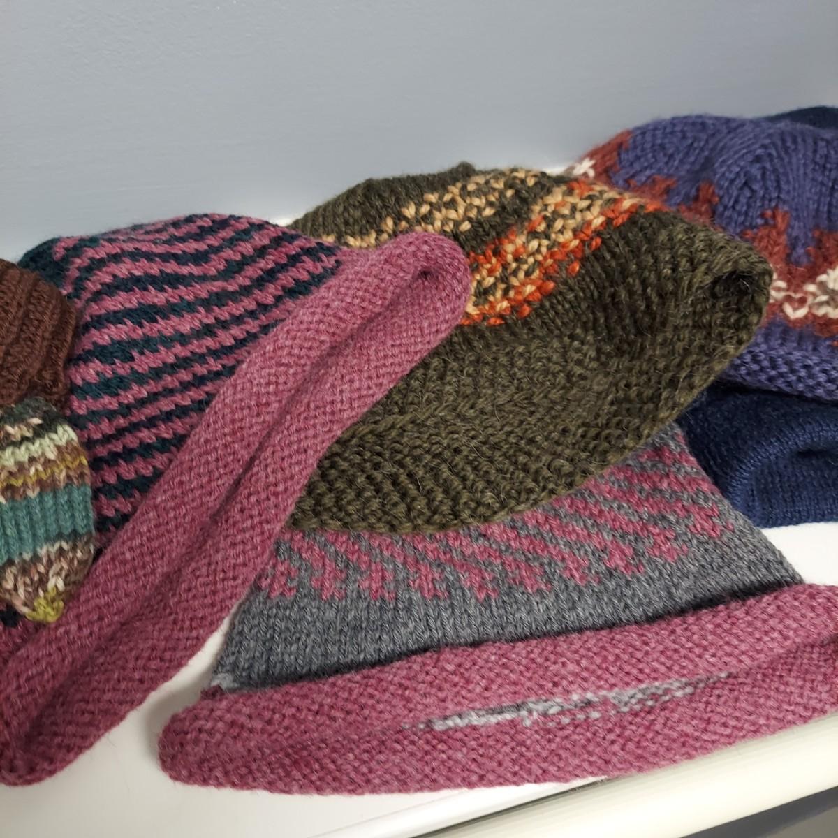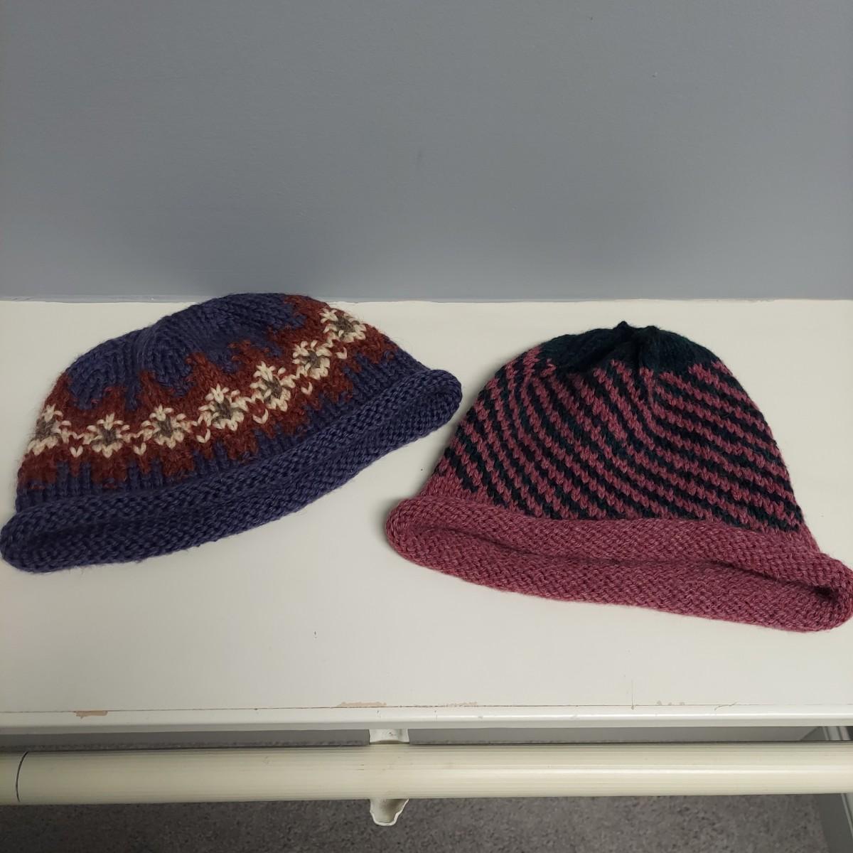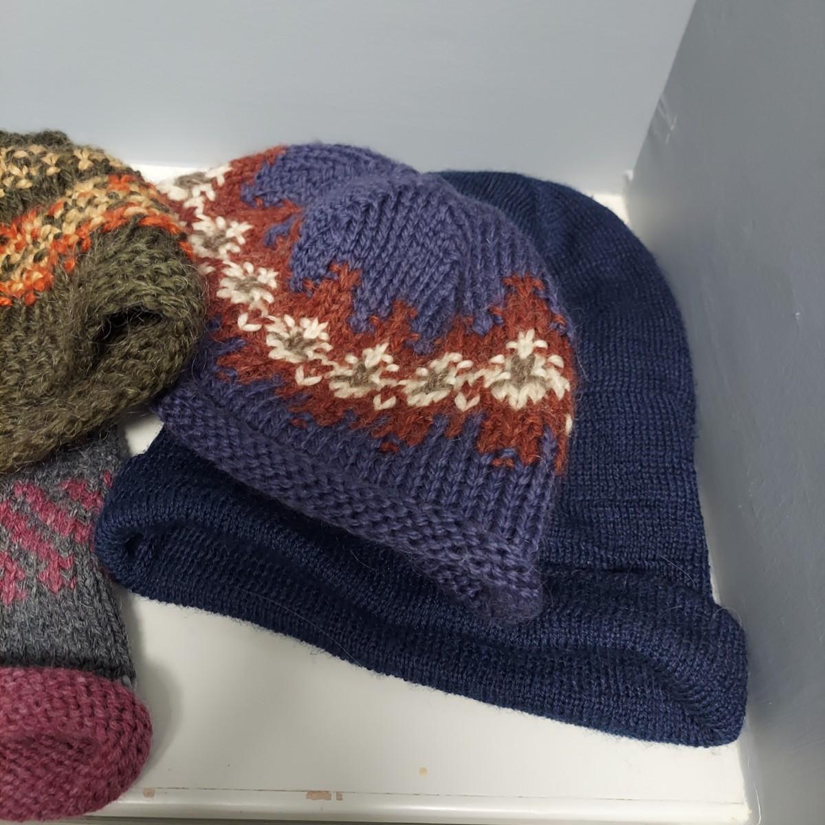 Lot includes seven scarves, six hats and one pair of mittens. Two scarves and one hat have tags. Otherwise, most items appear to be handmade knits. The shortest orange stripe scarf is 48” long. The longest green scarf is 68” long. Please see photos for details. Shipping available.