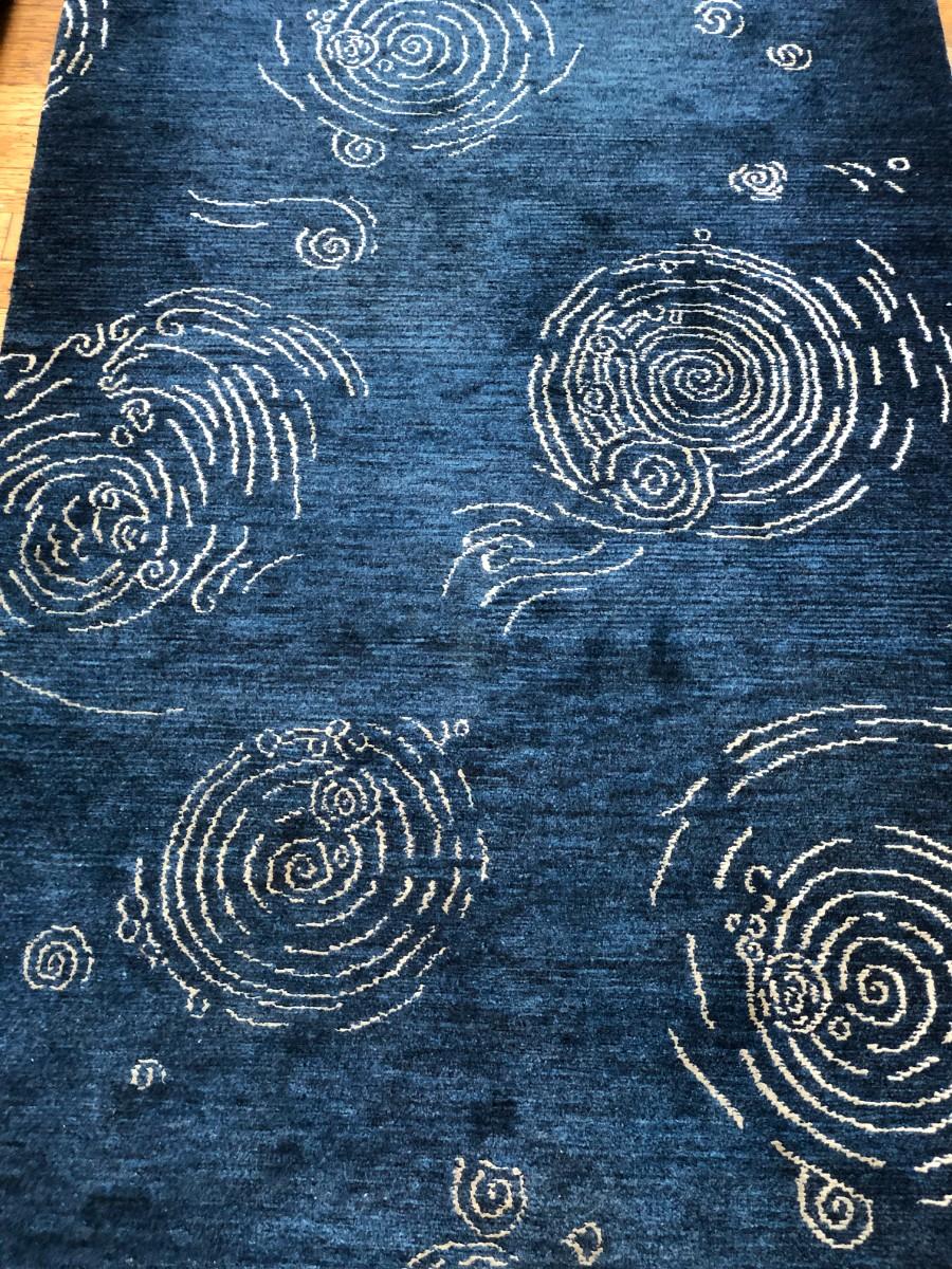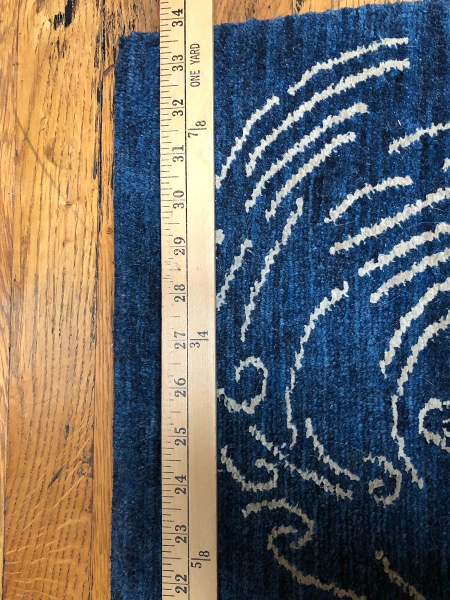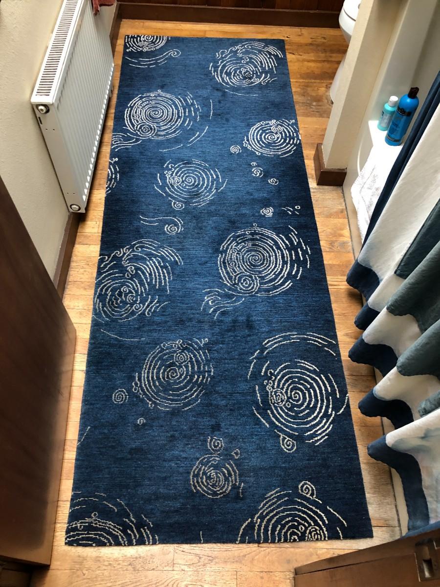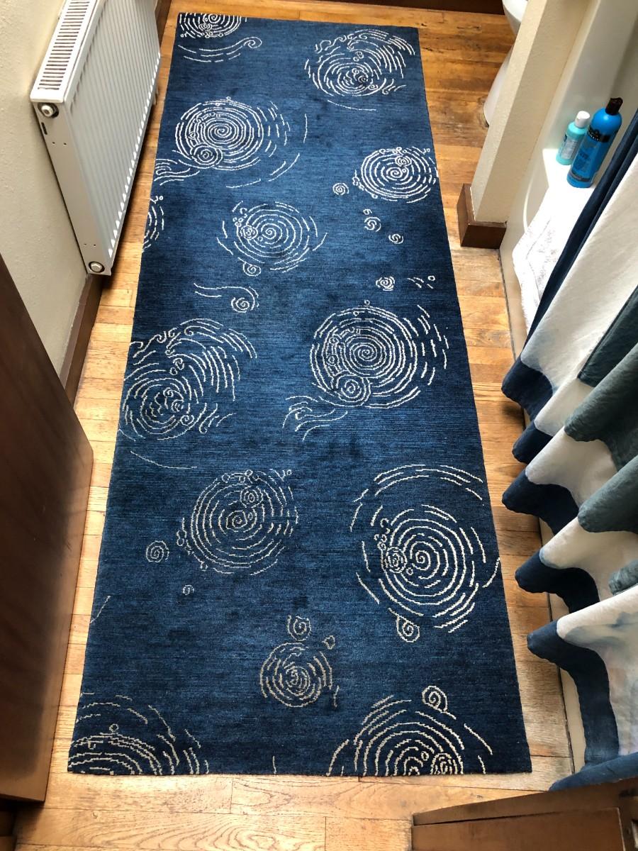 Hand Knotted Blue with White Spiral Made in Nepal Runner Rug. Beautiful blue color. In good condition.