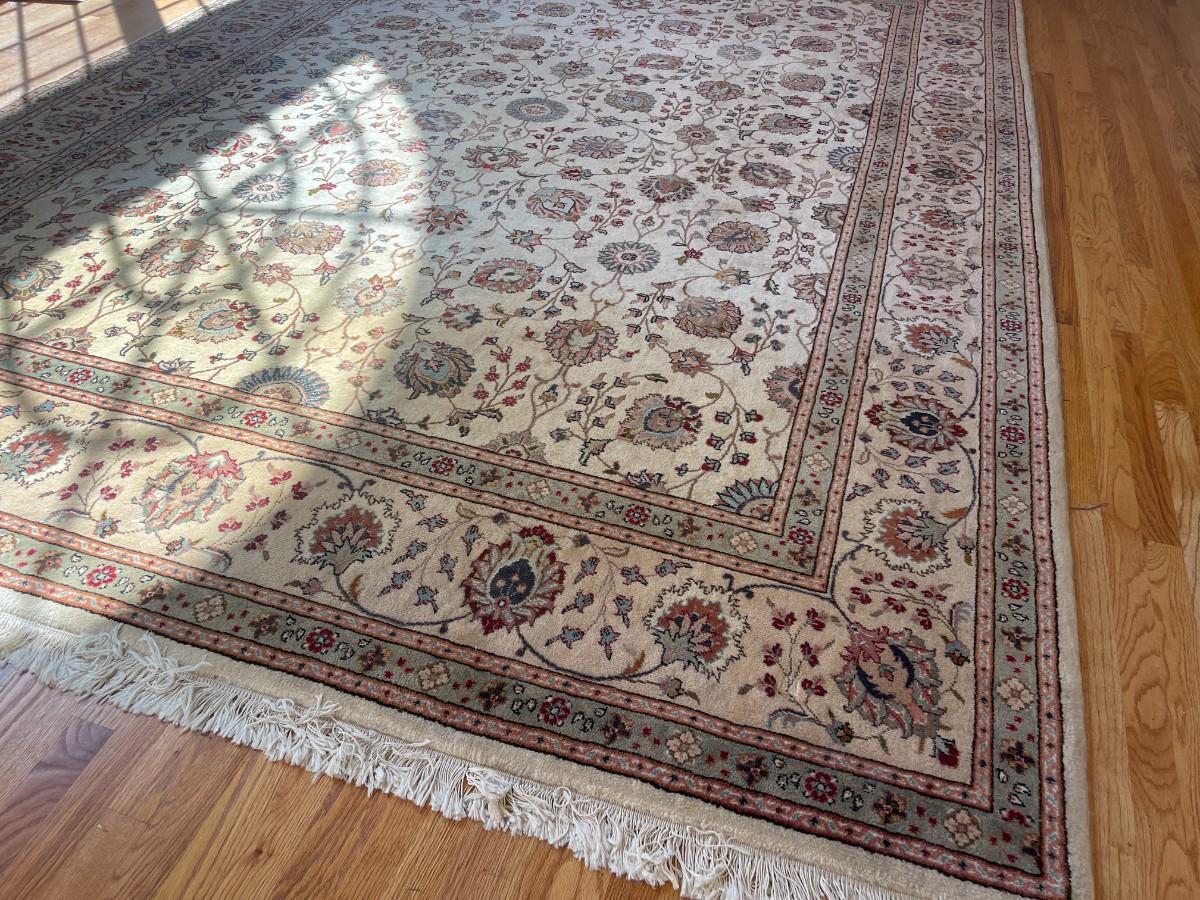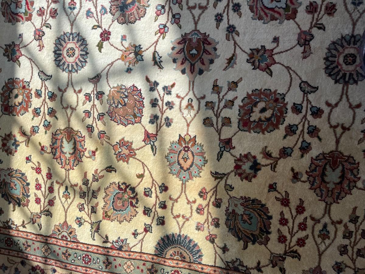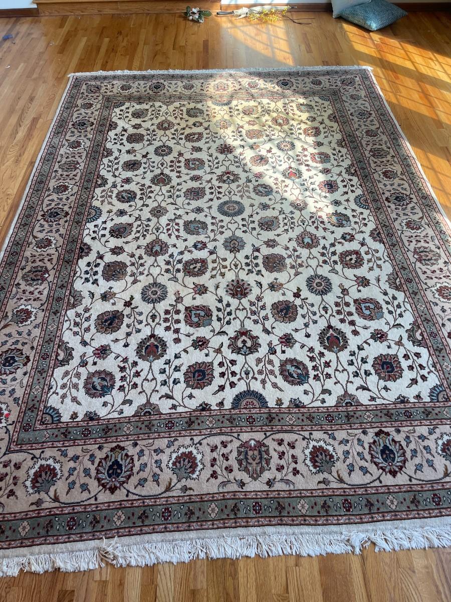 Hand knotted Kashan wool rug. Please note that there is sun fade throughout the rug and a darker spot where the sofa sat on the rug. It is still in very good condition but there is a noticeable color variation. Rug is 12'1" x 8'10" . 100% wool pile on cotton foundation.