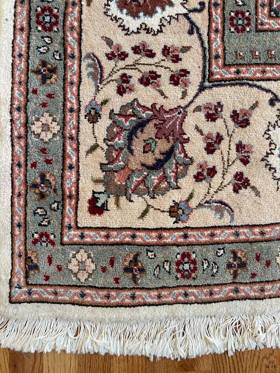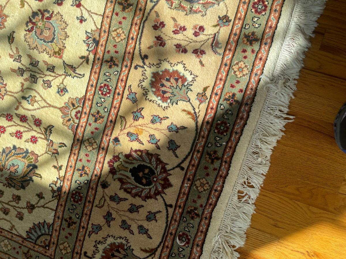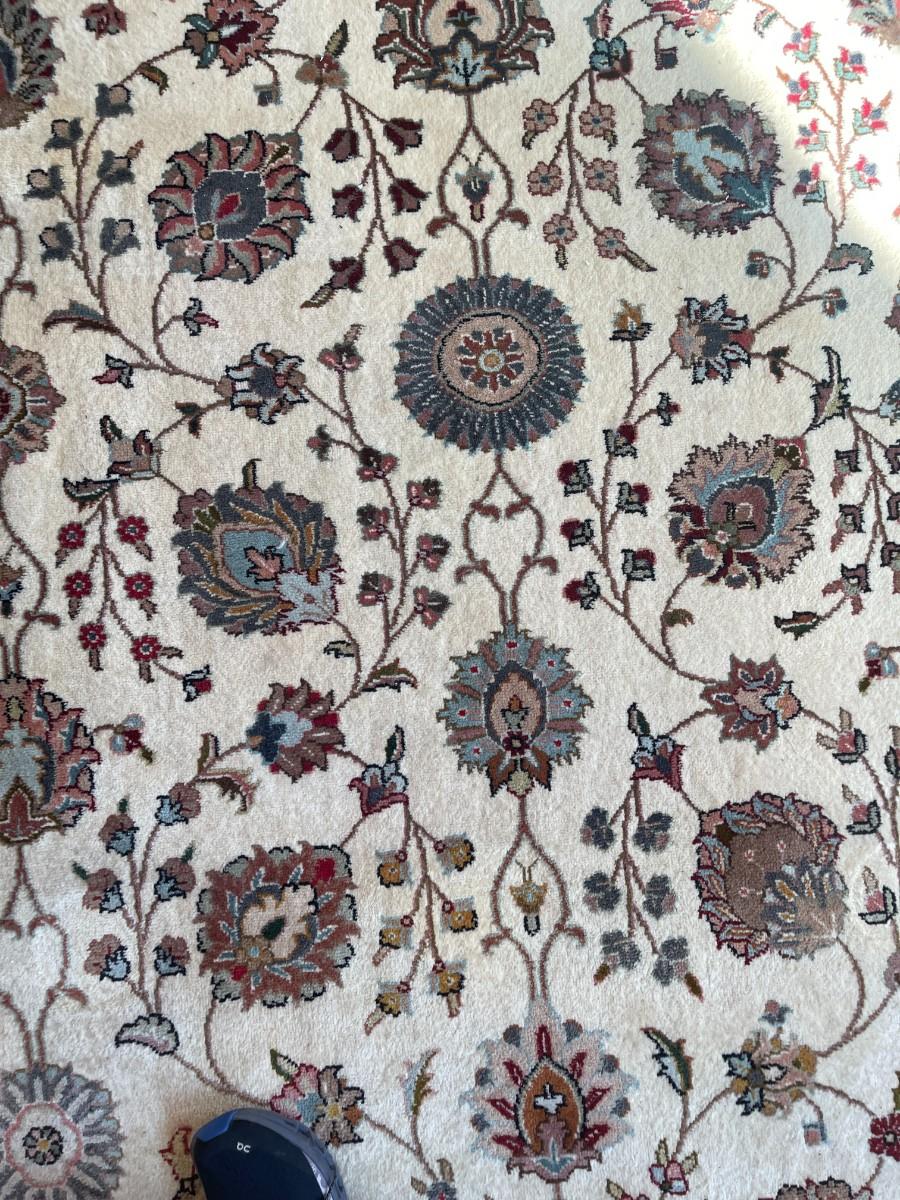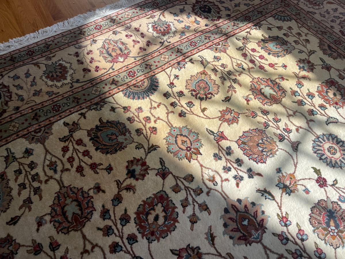 Hand knotted Kashan wool rug. Please note that there is sun fade throughout the rug and a darker spot where the sofa sat on the rug. It is still in very good condition but there is a noticeable color variation. Rug is 12'1" x 8'10" . 100% wool pile on cotton foundation.