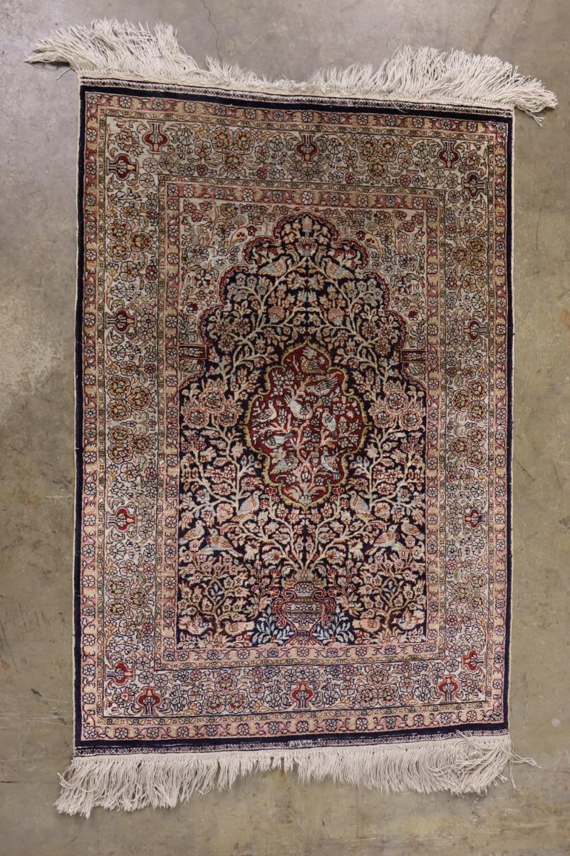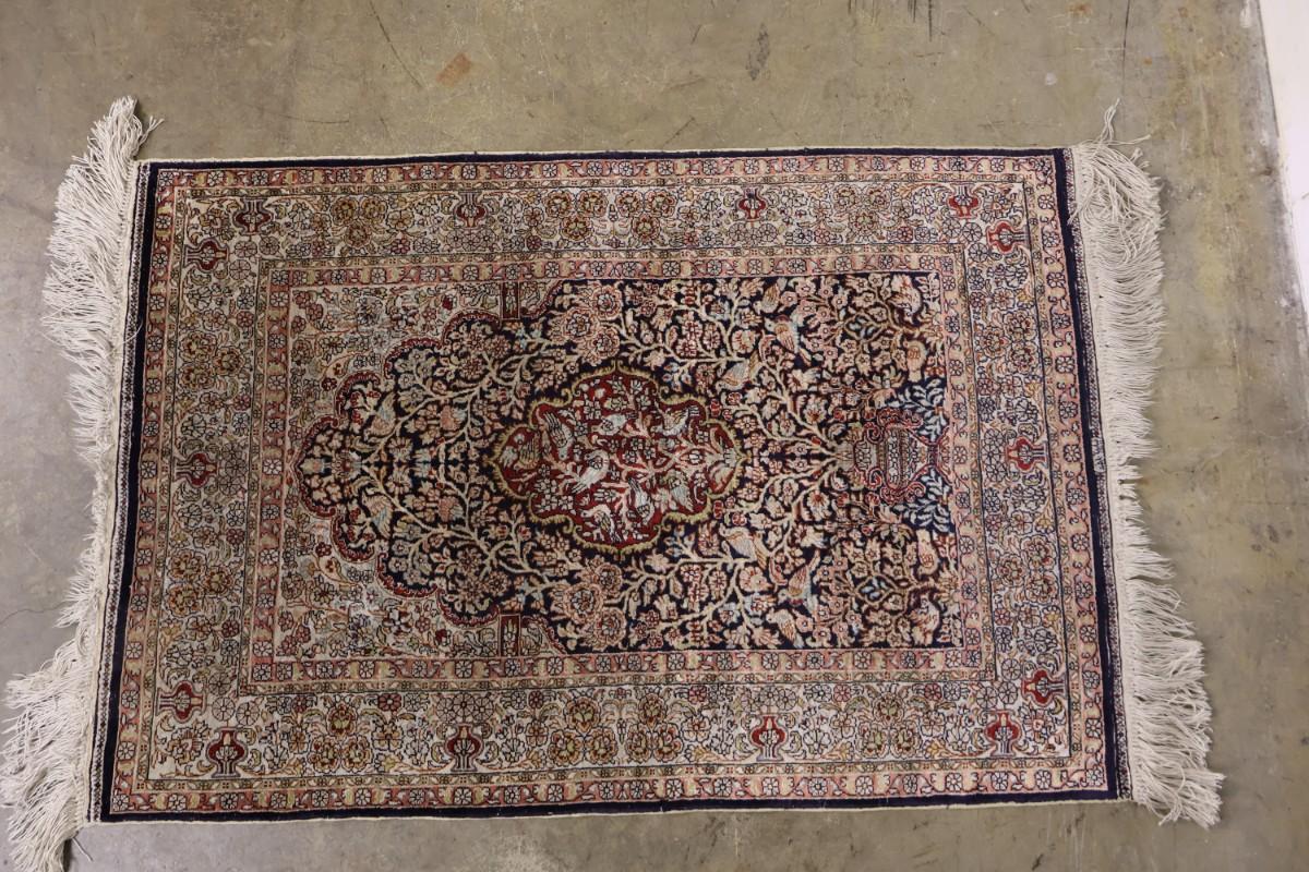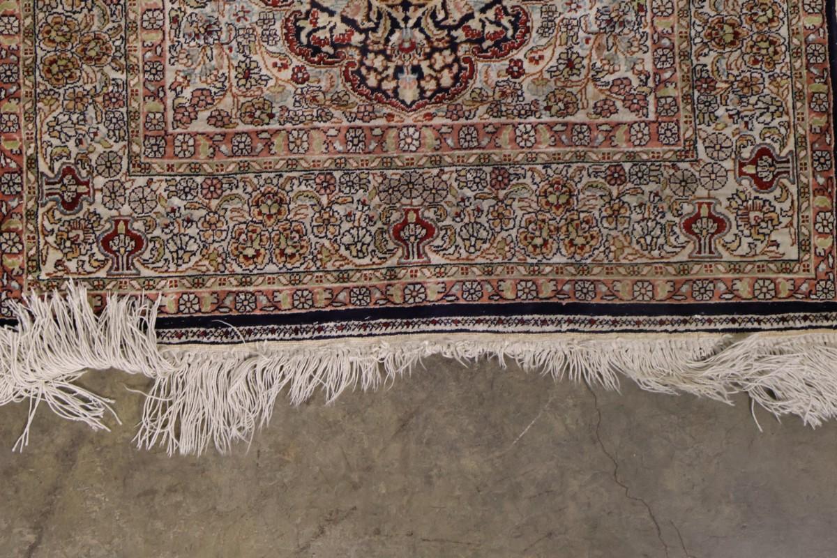 Hand knotted silk area rug, Tabriz design and signed by maker. Rug pile in excellent condition, fringe shows damage. 36" x 24 1/2".