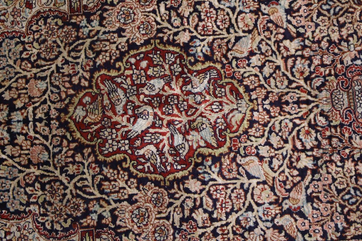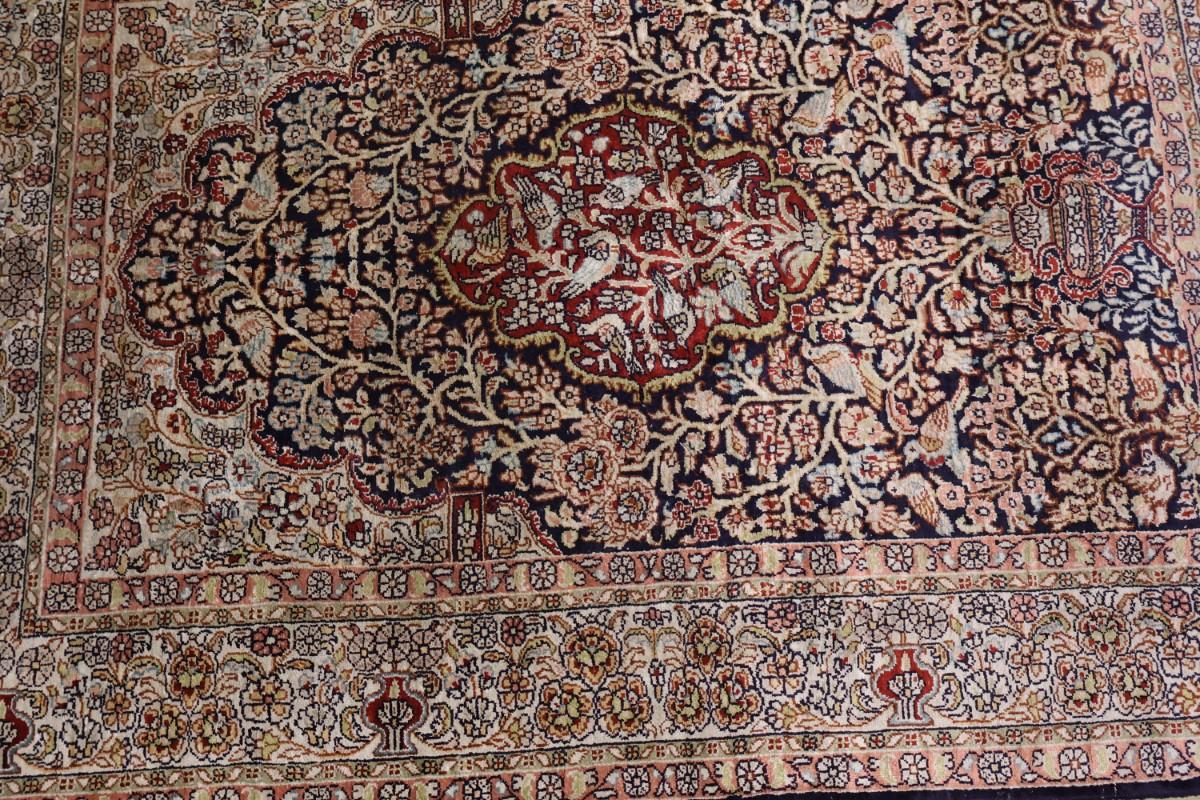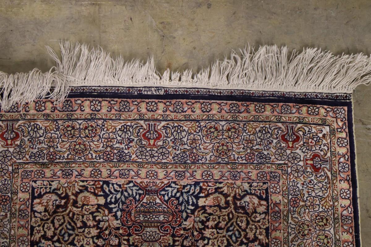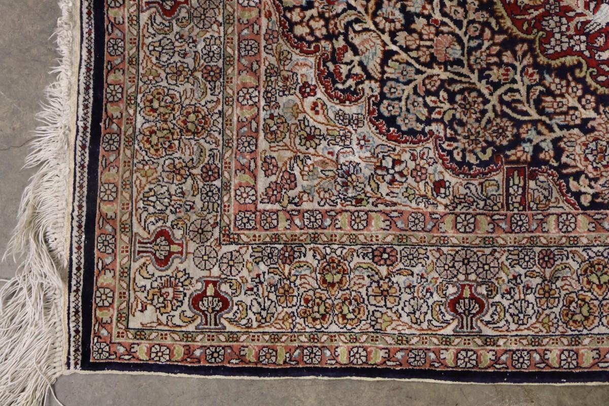 Hand knotted silk area rug, Tabriz design and signed by maker. Rug pile in excellent condition, fringe shows damage. 36" x 24 1/2".
