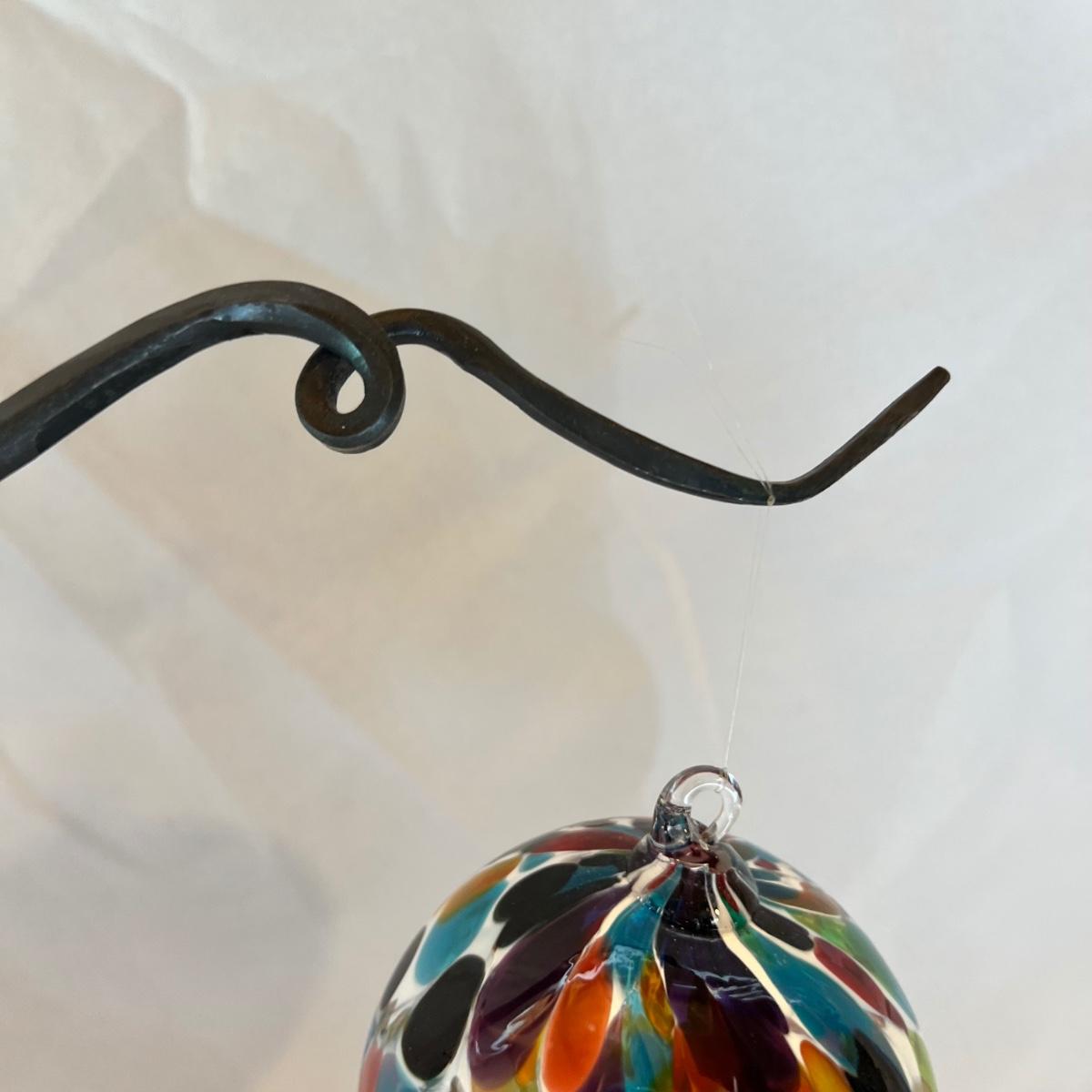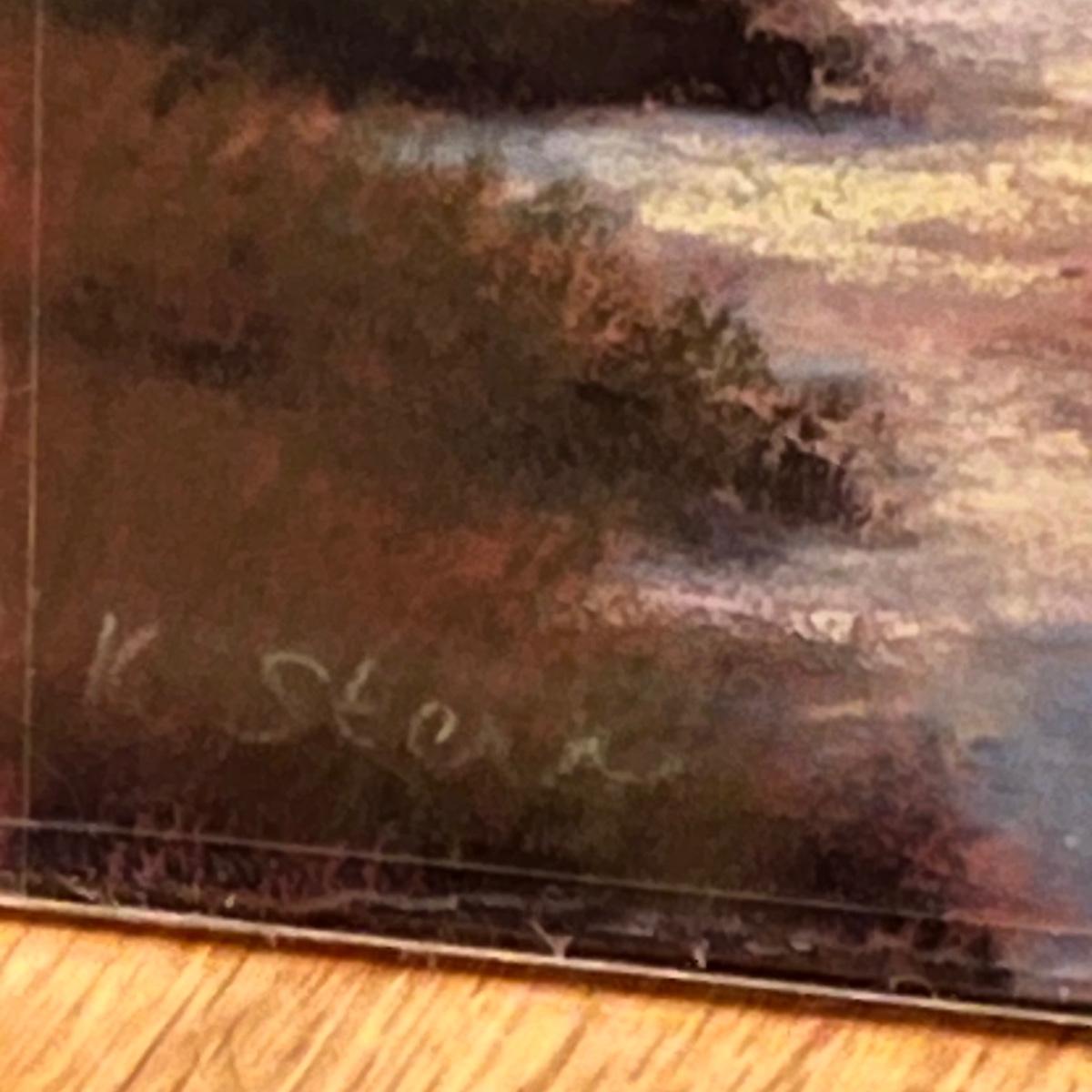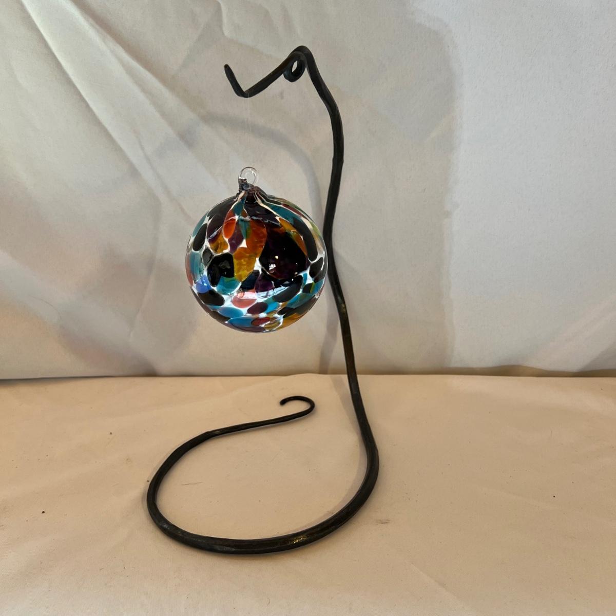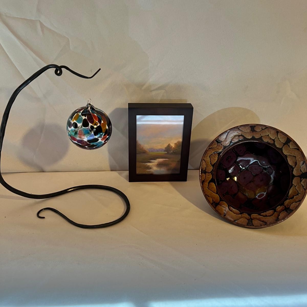 Three pieces of what appears to be hand made artwork. An iron crafted table top “hook” for a suspended blown glass sculpture. The overall piece is approximately 11” x 1” x 13”H. A pastel pond and landscape piece by K Stern measures 5” x 7”H unframed and