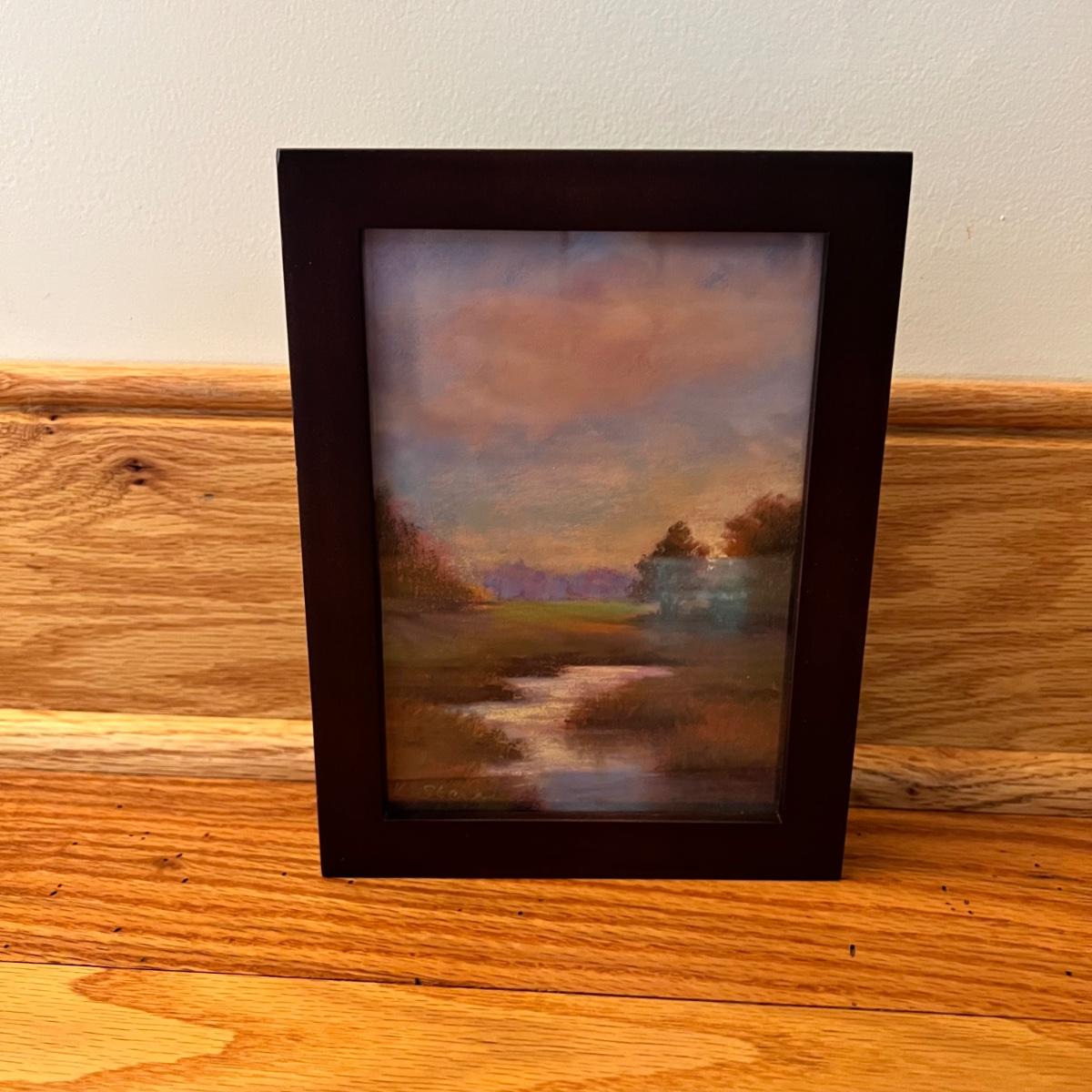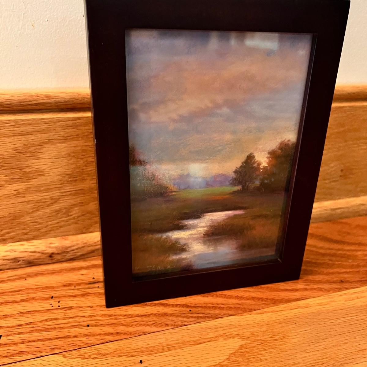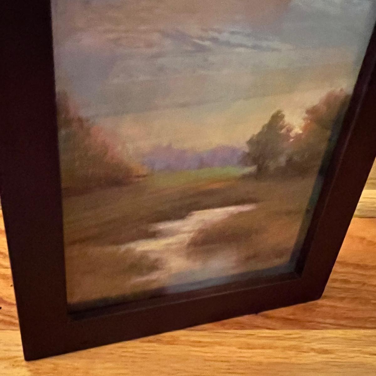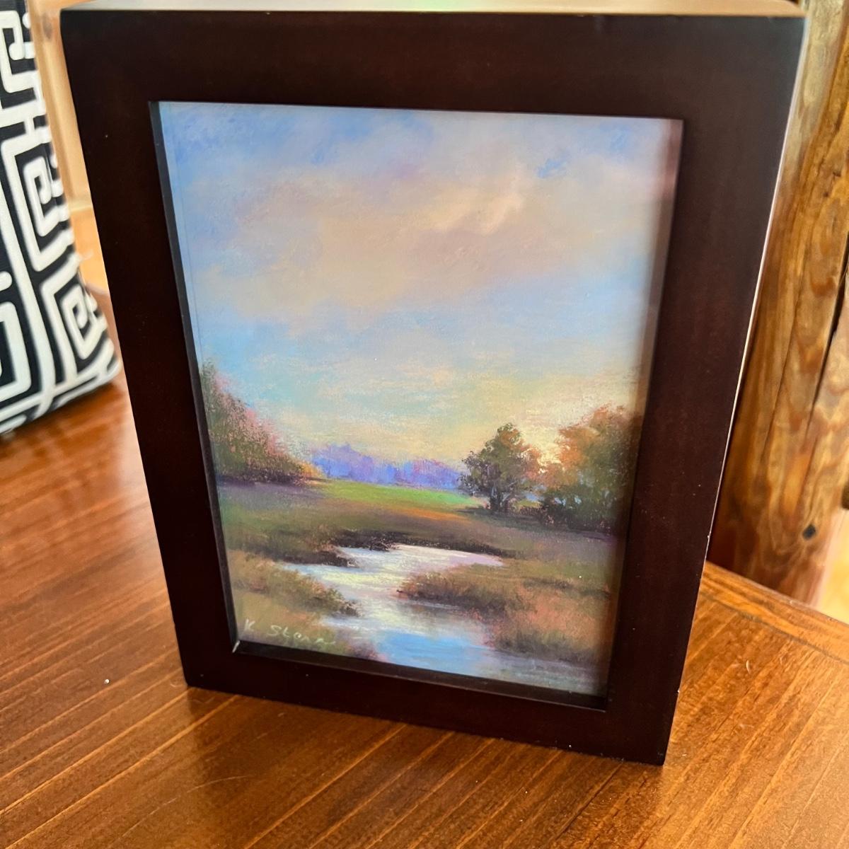 Three pieces of what appears to be hand made artwork. An iron crafted table top “hook” for a suspended blown glass sculpture. The overall piece is approximately 11” x 1” x 13”H. A pastel pond and landscape piece by K Stern measures 5” x 7”H unframed and