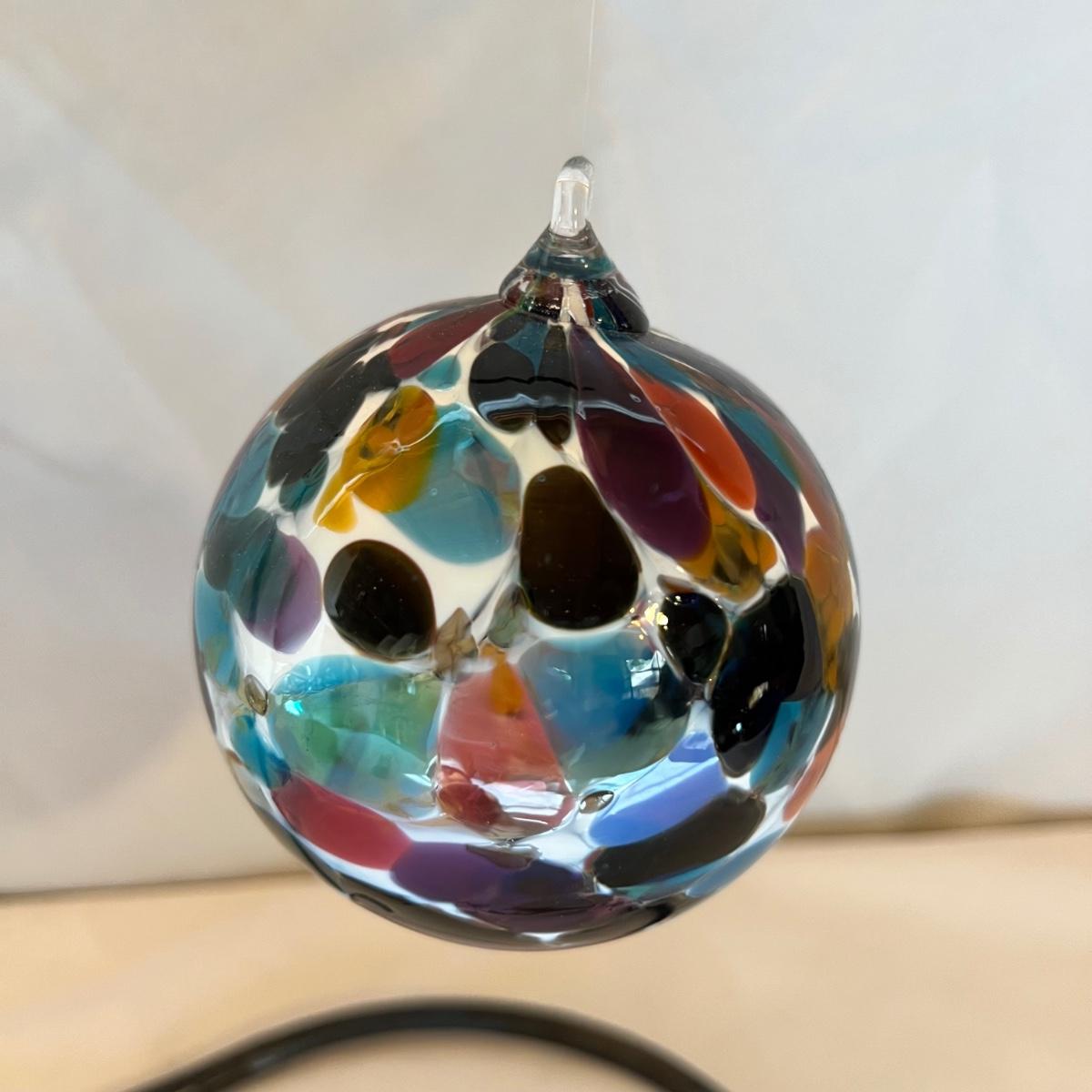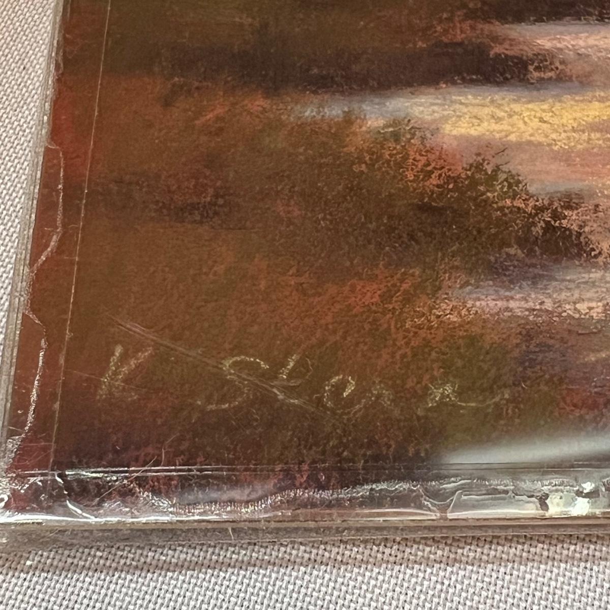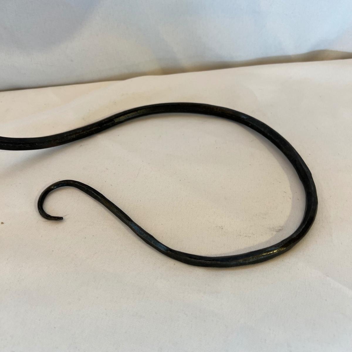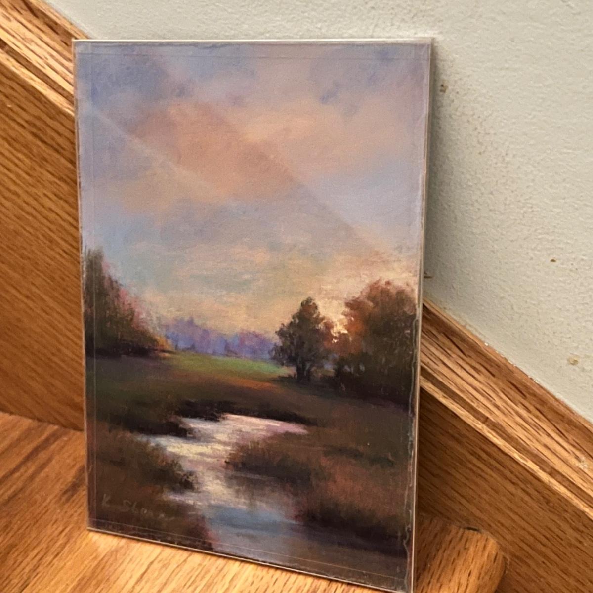 Three pieces of what appears to be hand made artwork. An iron crafted table top “hook” for a suspended blown glass sculpture. The overall piece is approximately 11” x 1” x 13”H. A pastel pond and landscape piece by K Stern measures 5” x 7”H unframed and