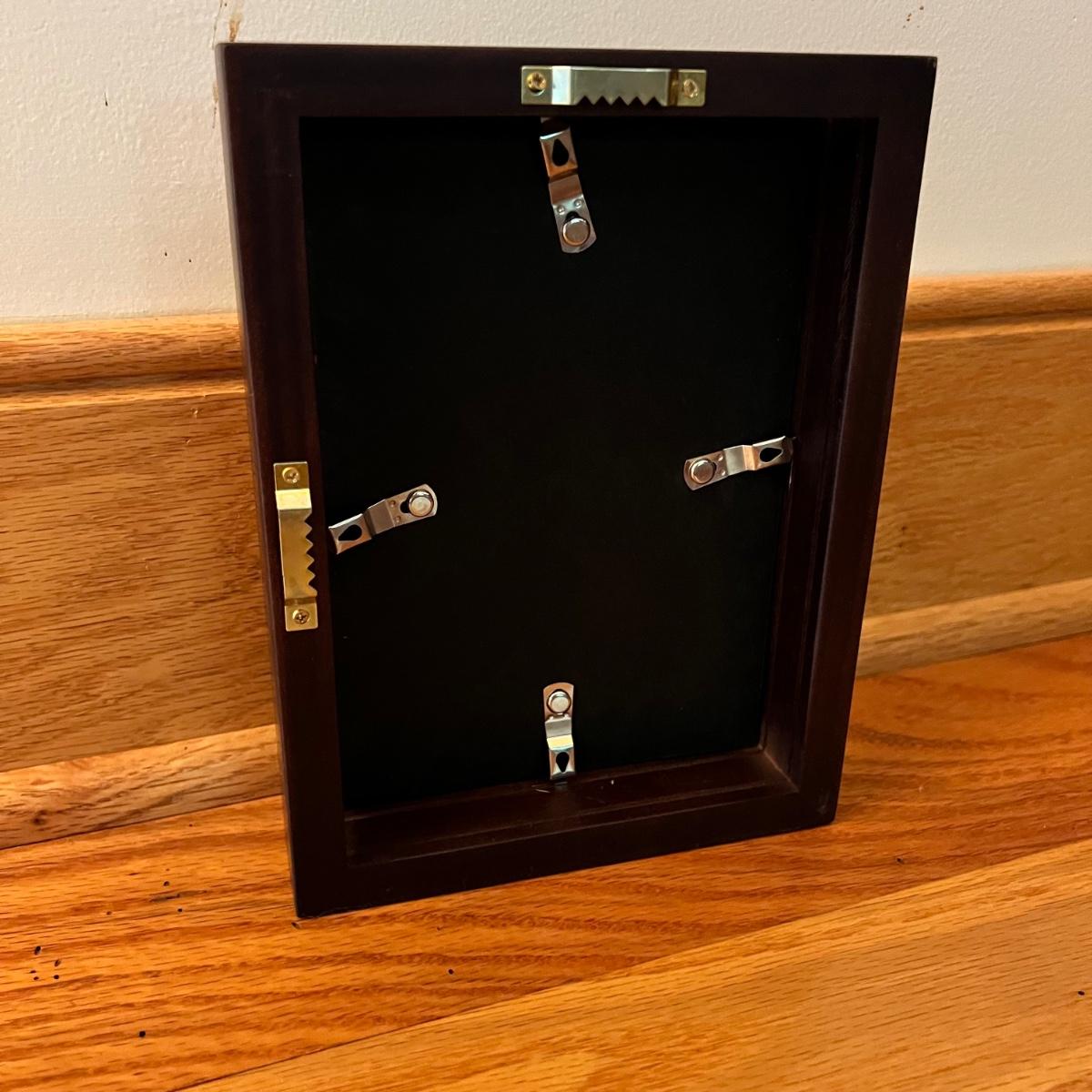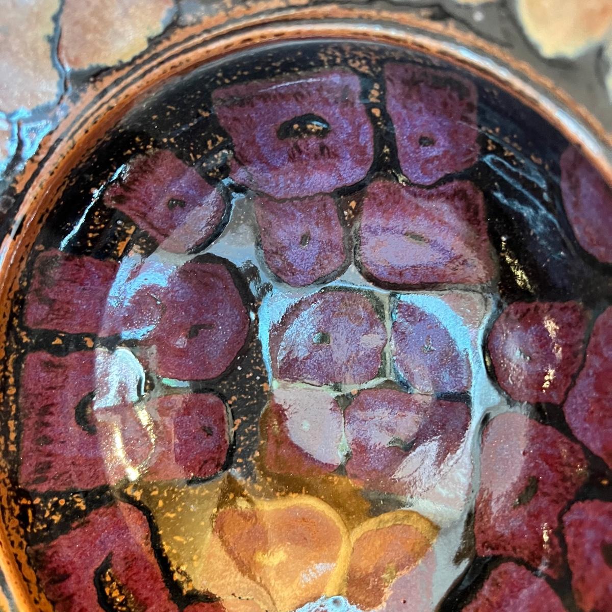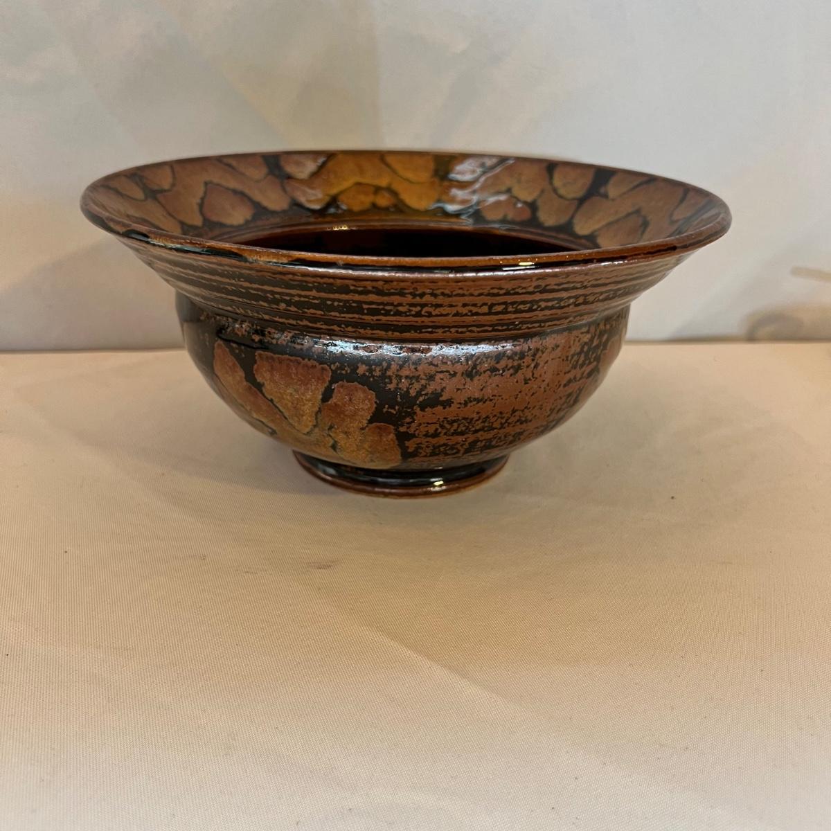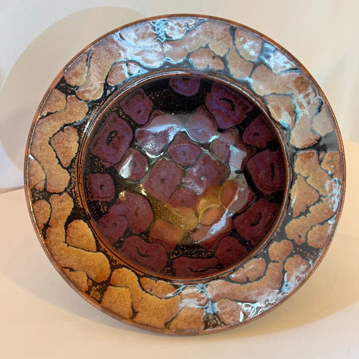 6.25” x 1.5” x 8.25”H. The frame appears to be wood and the pastel piece is wrapped in a plastic-like cover. The ceramic bowl measures 9”D x 4.25”H and is brown rimmed in color and purple and darker brown on the inside.