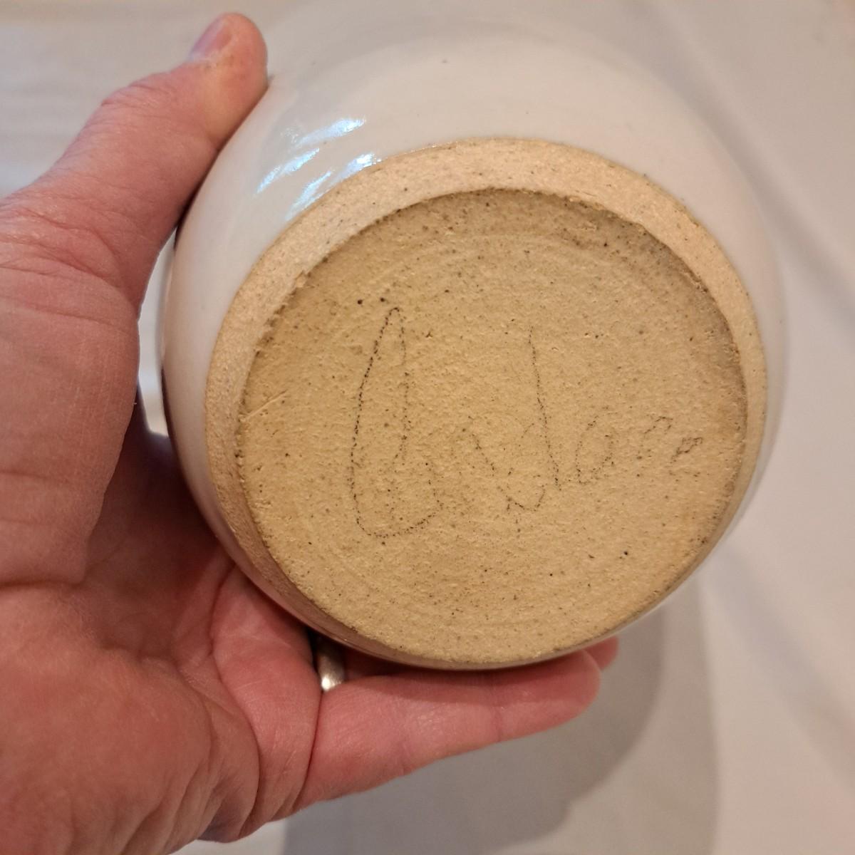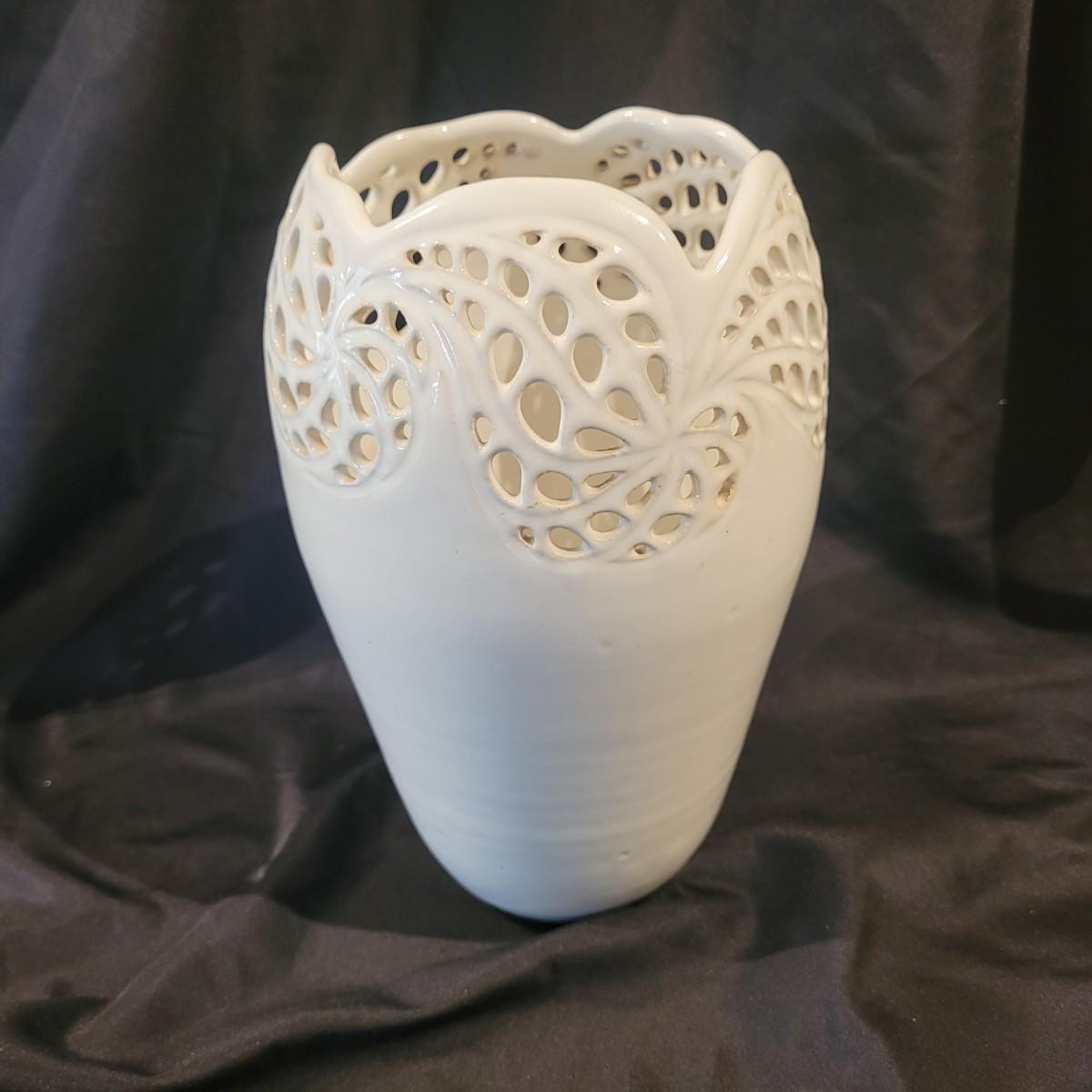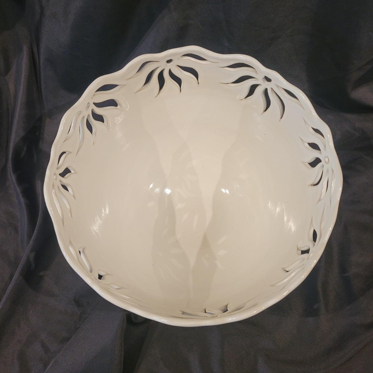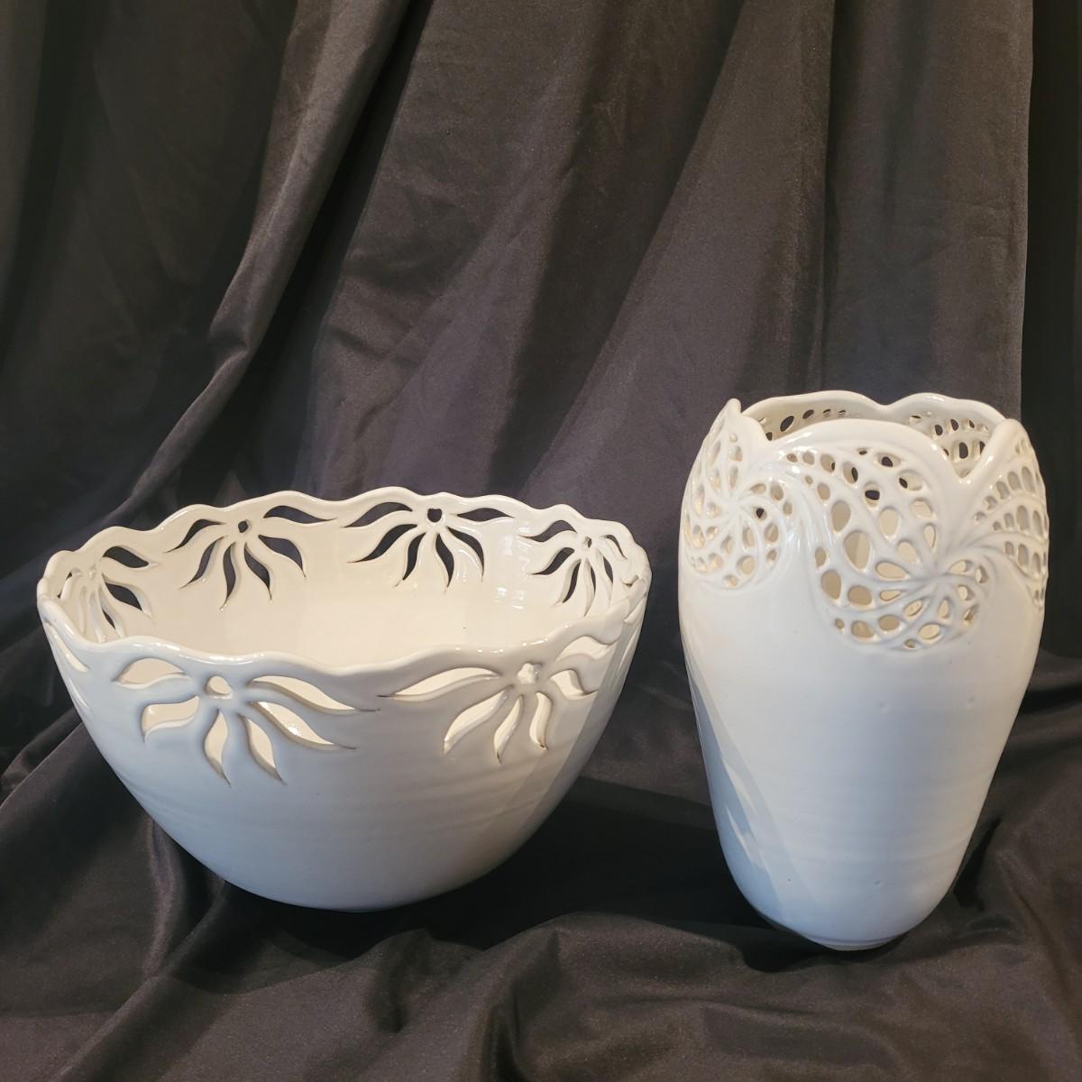 Two hand made ceramic pieces with floral patterns and bone white glaze. Both items have the name "Candace " on their bases. The bowl measures 11" x 11" x 7"H. The vase measures 6" x 6" x 10"H. The inner lower portion of the Vase has some crazing.
