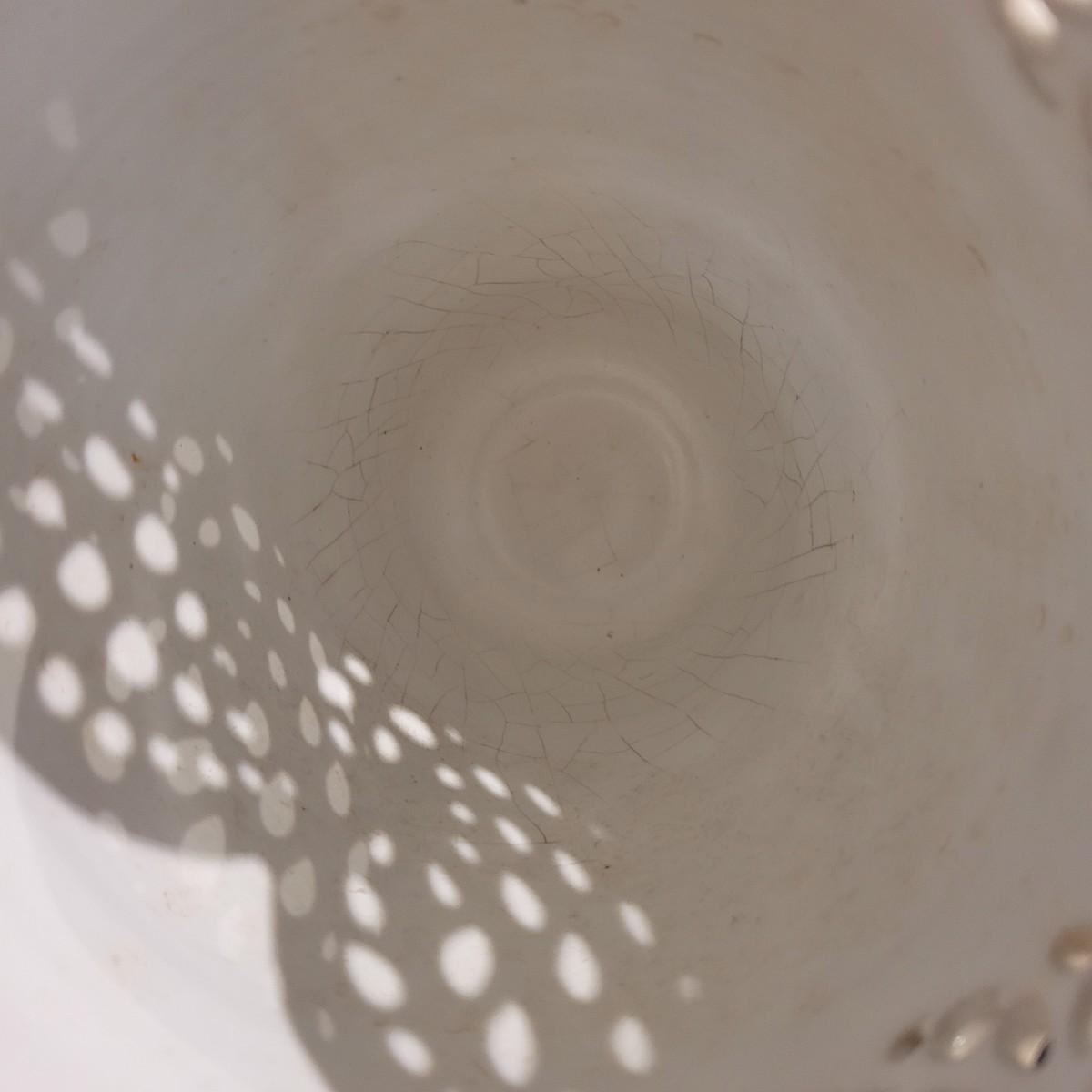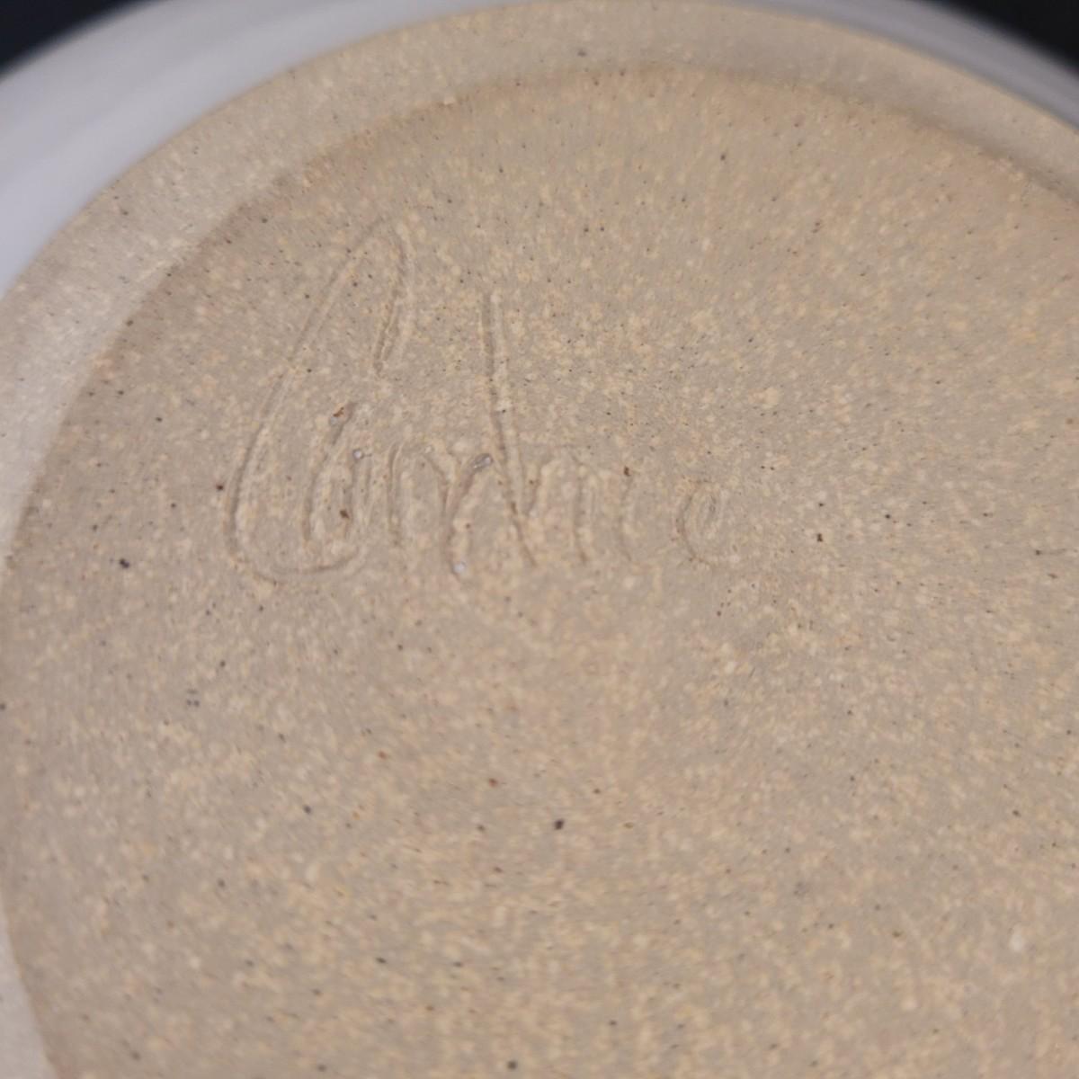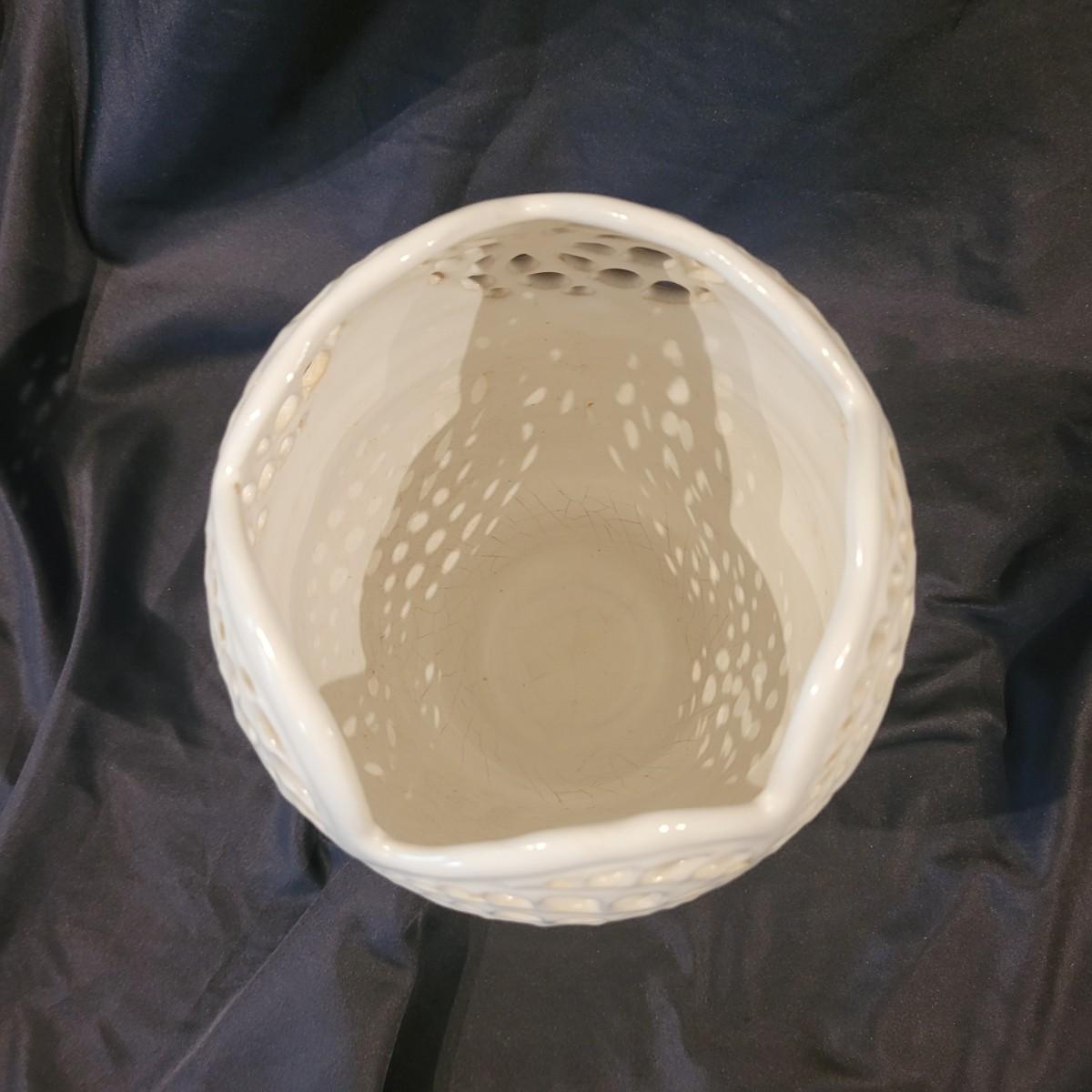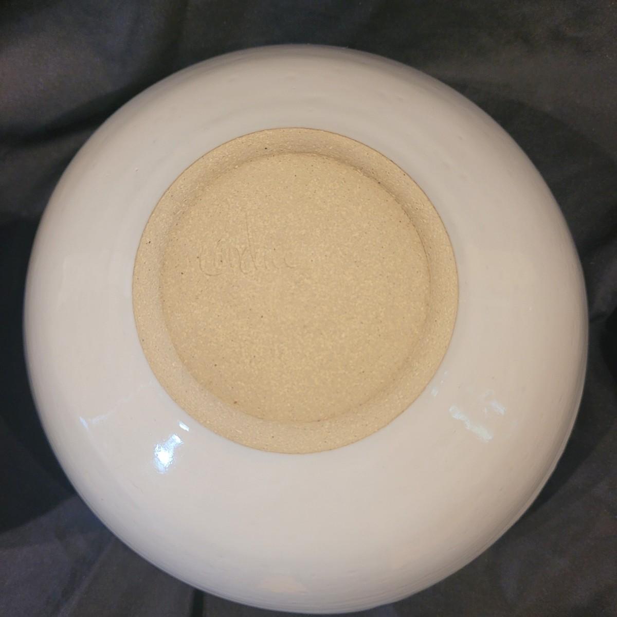 Two hand made ceramic pieces with floral patterns and bone white glaze. Both items have the name "Candace " on their bases. The bowl measures 11" x 11" x 7"H. The vase measures 6" x 6" x 10"H. The inner lower portion of the Vase has some crazing.