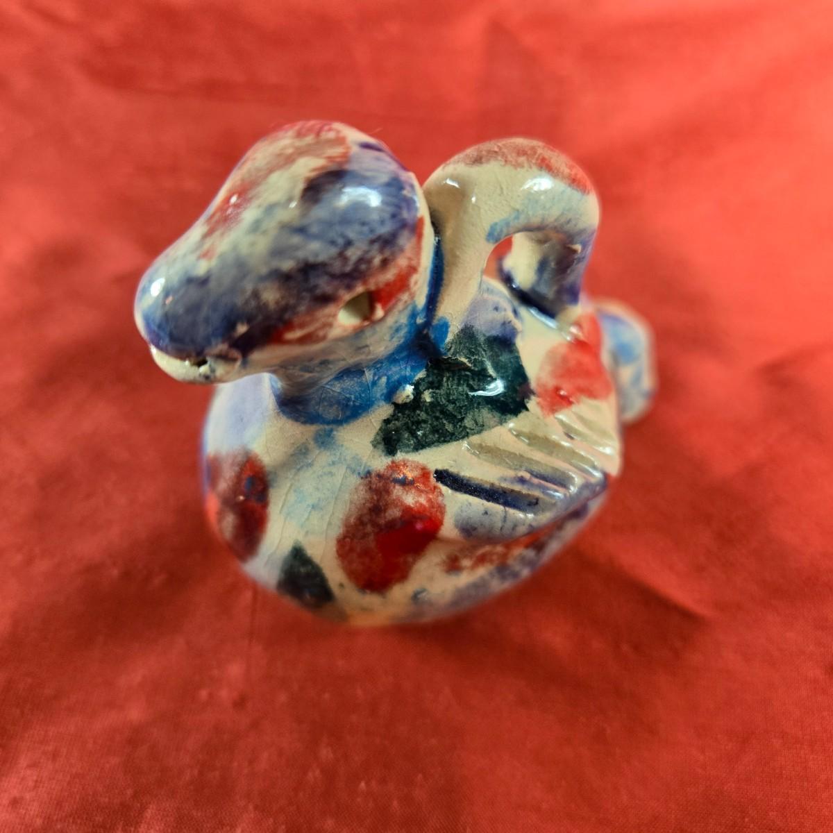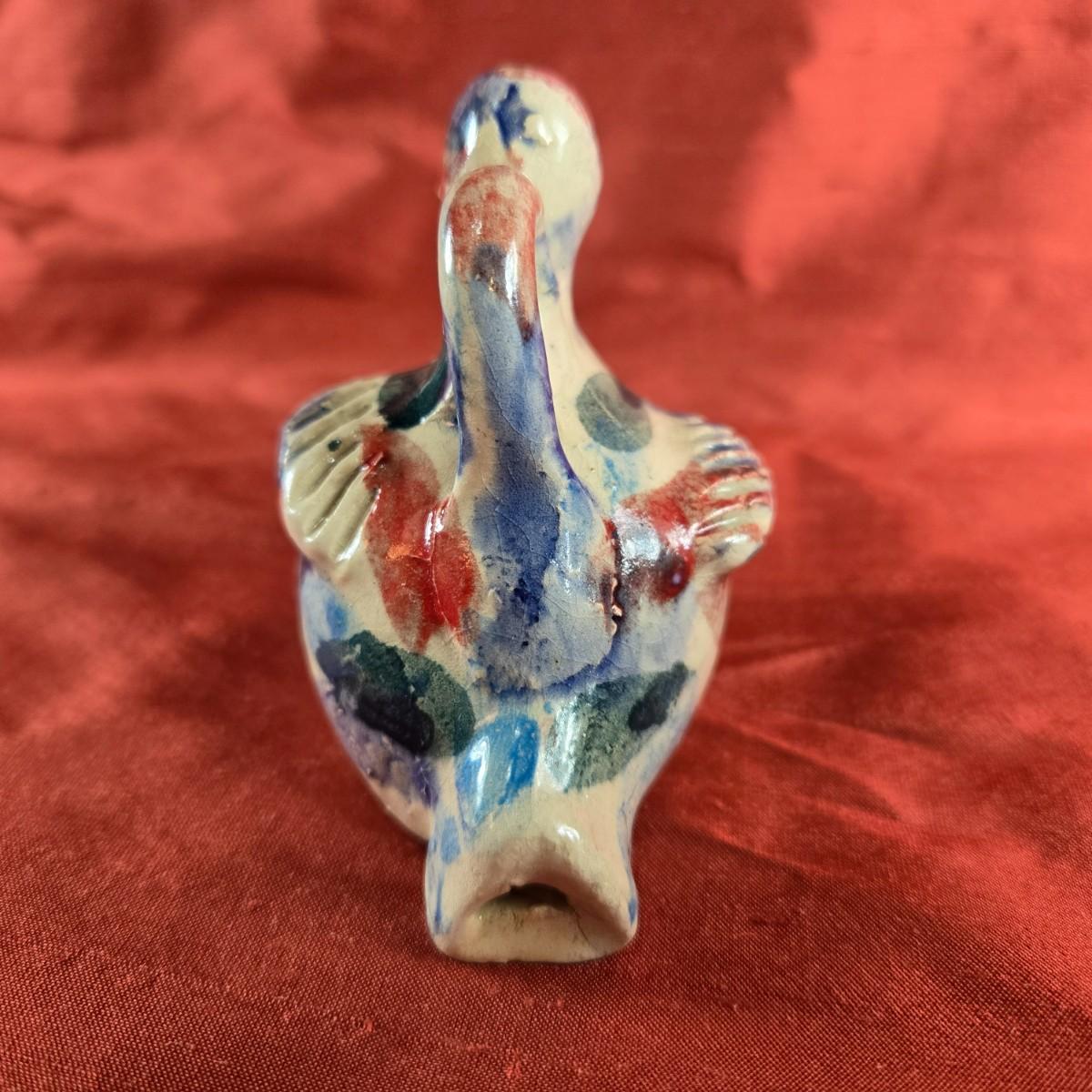 This auction lot is for a Hand Made Ceramic Whistle/Flute. This unique bird is actually a whistle/flute. When you blow in it you can whistle but if you utilize the small hole in the front - opening it and covering it up with your finger, you can actually change the sound or note. Works like a simple flute. No artist signature. Measures about 2-3/4-inches tall x 3-inches long.