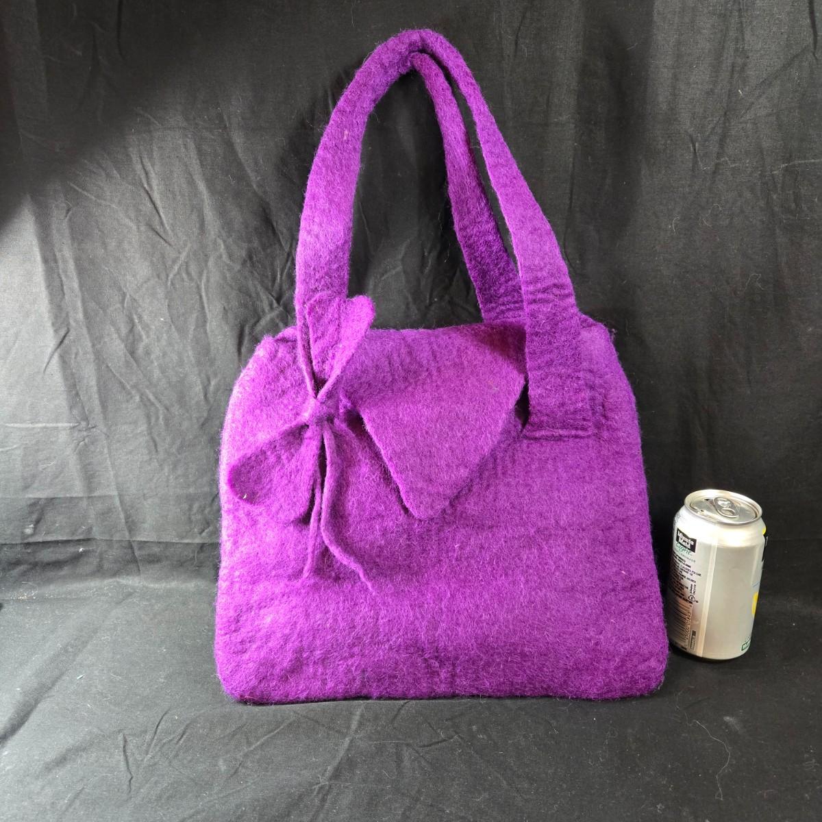 This lot is for a Hand Made Felted Purple Purse. It is actually darker than in the photo. It is of a simple design with a felted box accent. It has a zippered closer under the flap It measures about 13-inches wide x 19-inches including straps, It has never been used. Very light weight.