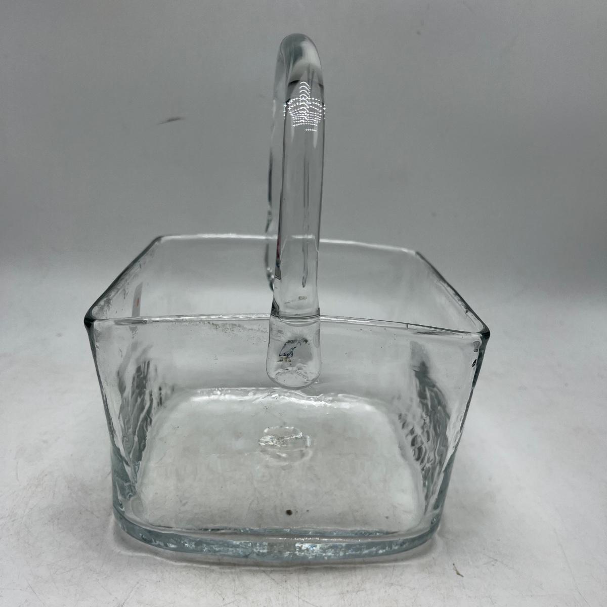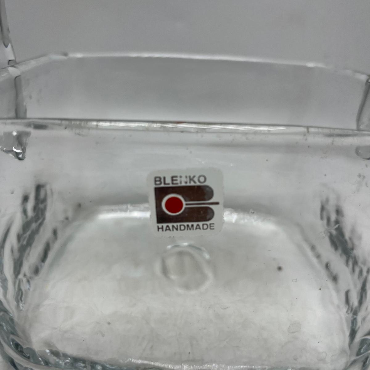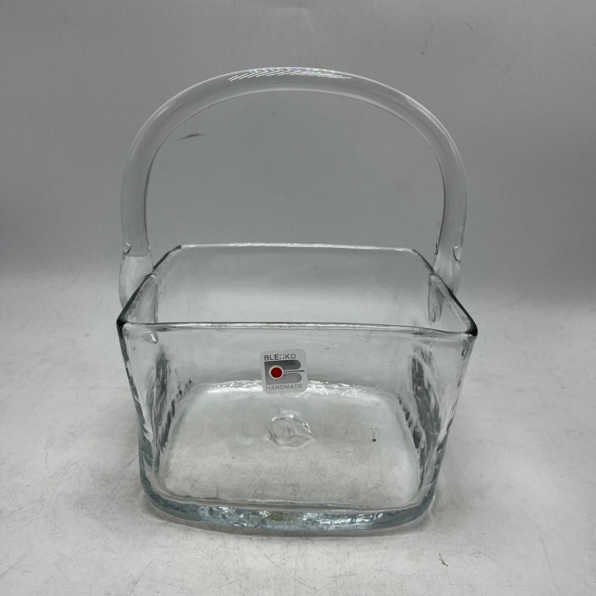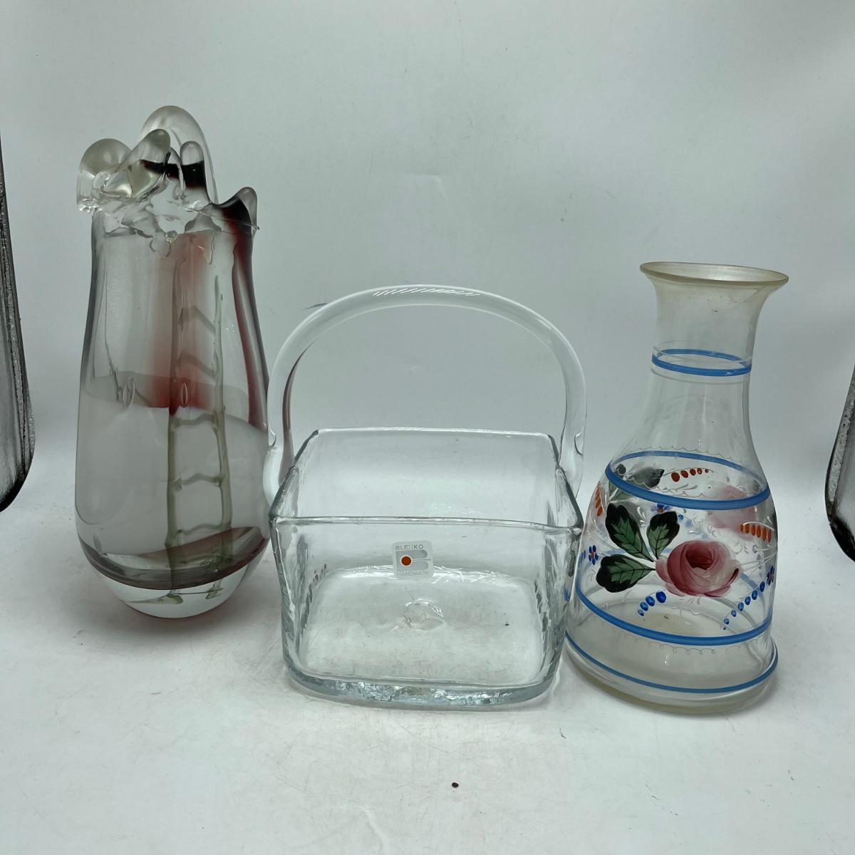 Lot includes a Blenko handmade glass basket, glass vase and a glass bottle with floral design. Basket measures 5.75” x 6” x 8”.