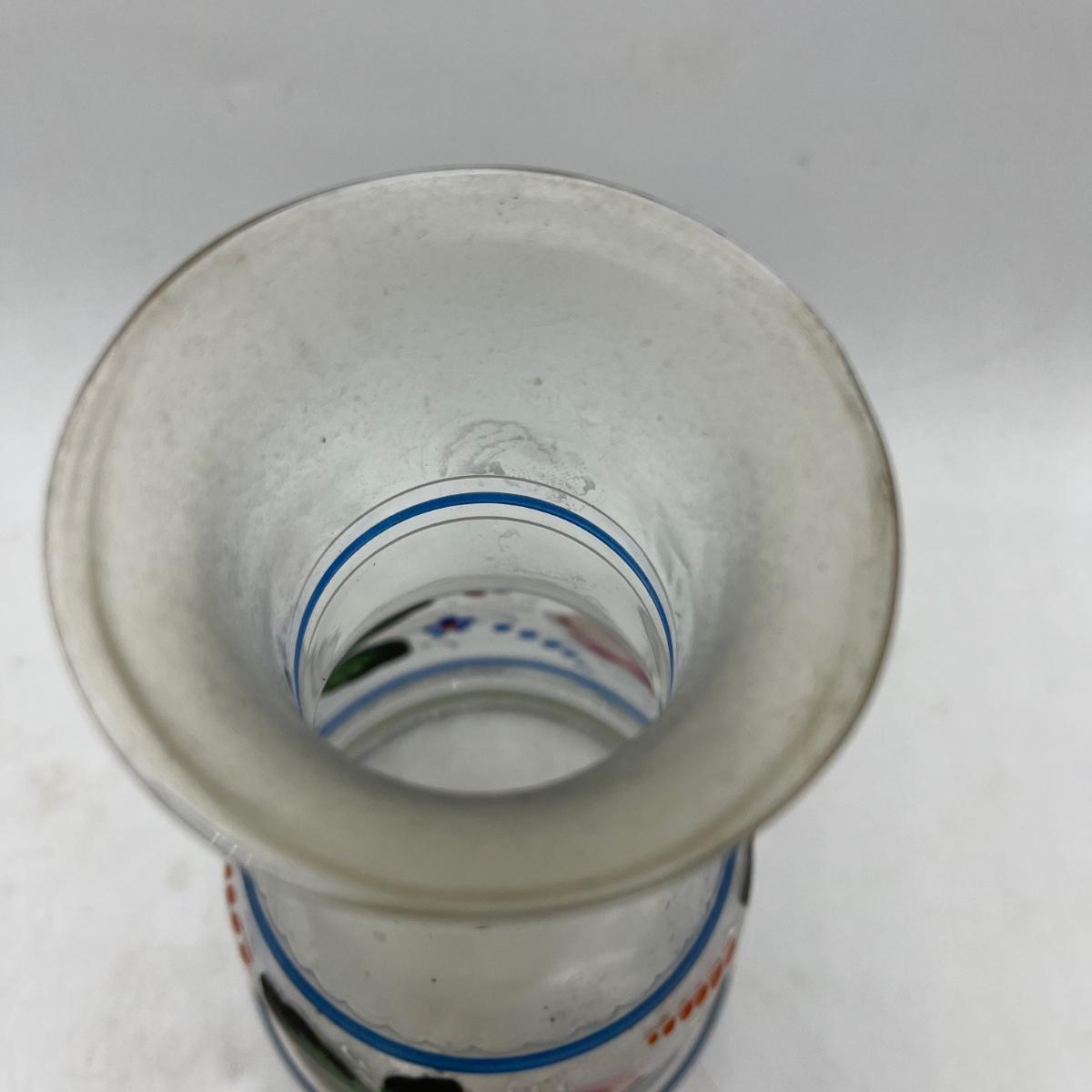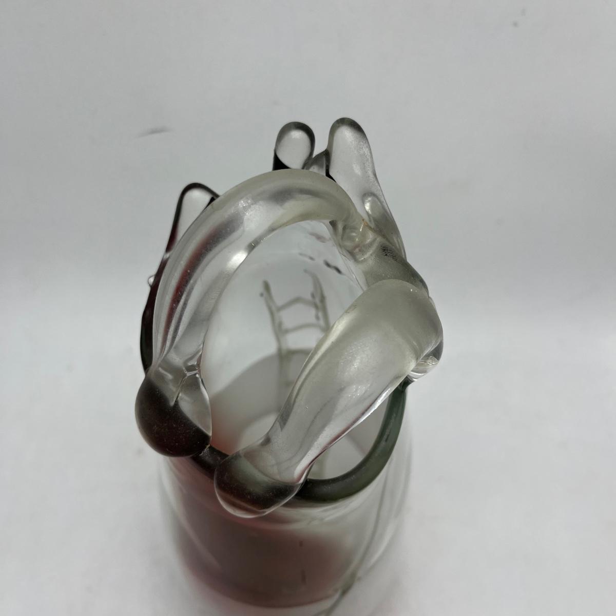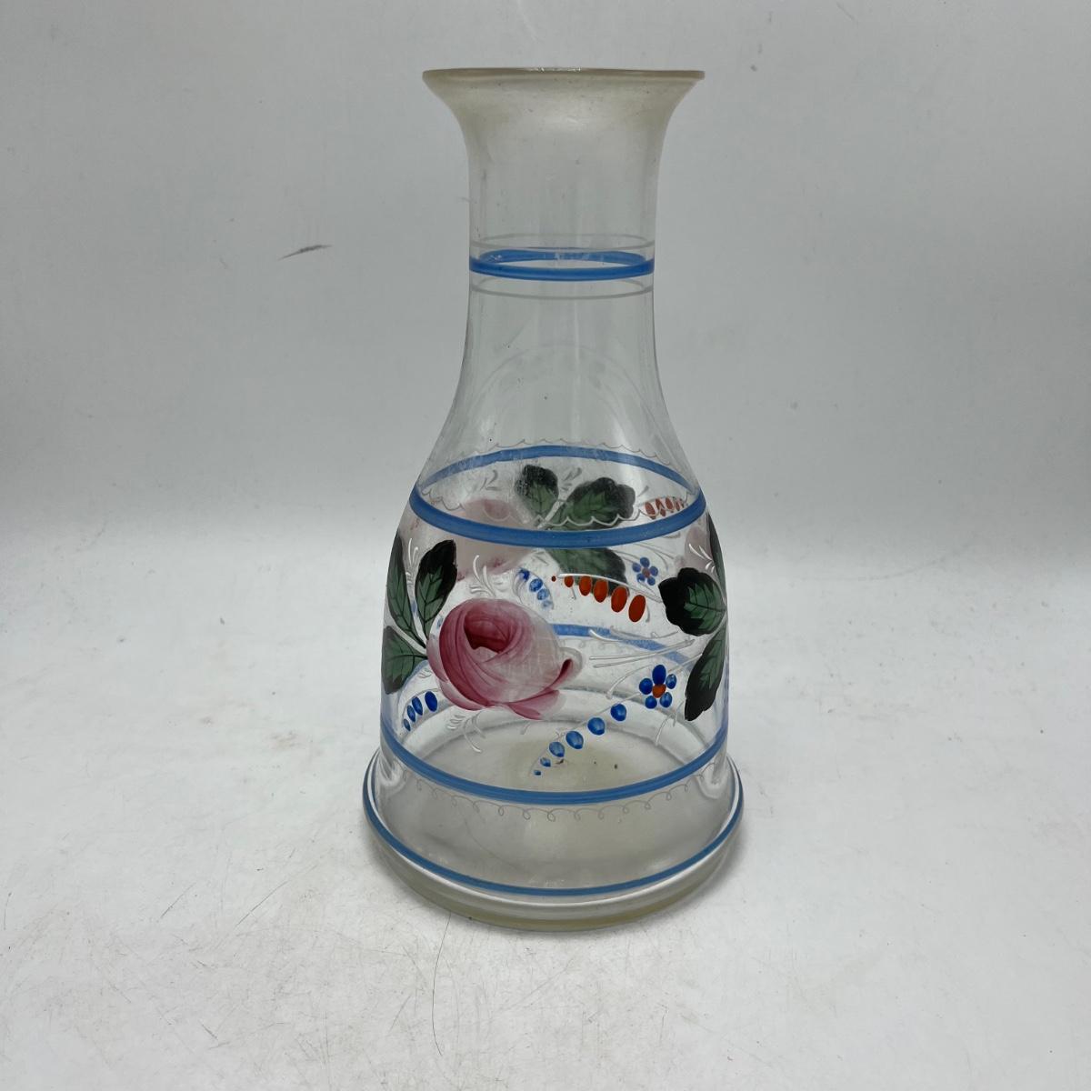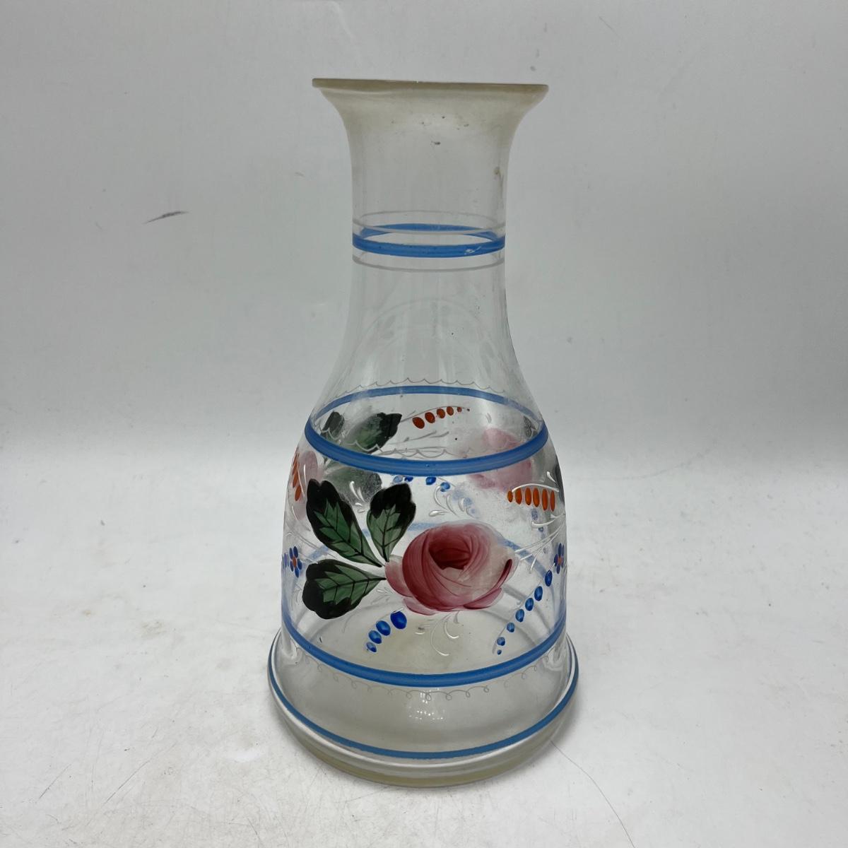 Lot includes a Blenko handmade glass basket, glass vase and a glass bottle with floral design. Basket measures 5.75” x 6” x 8”.