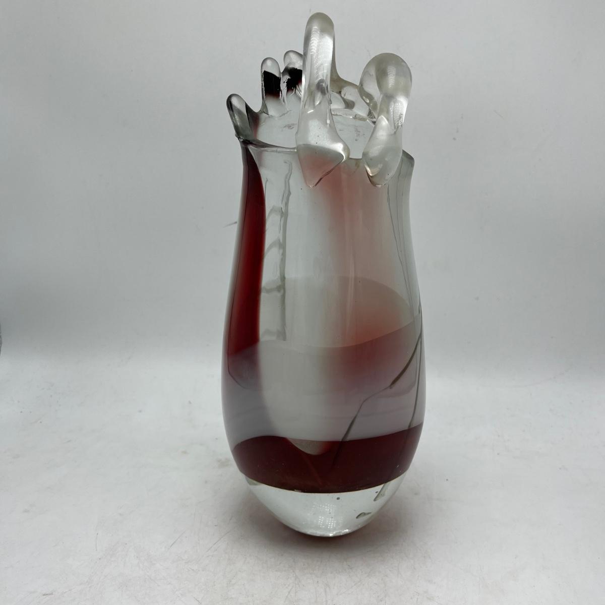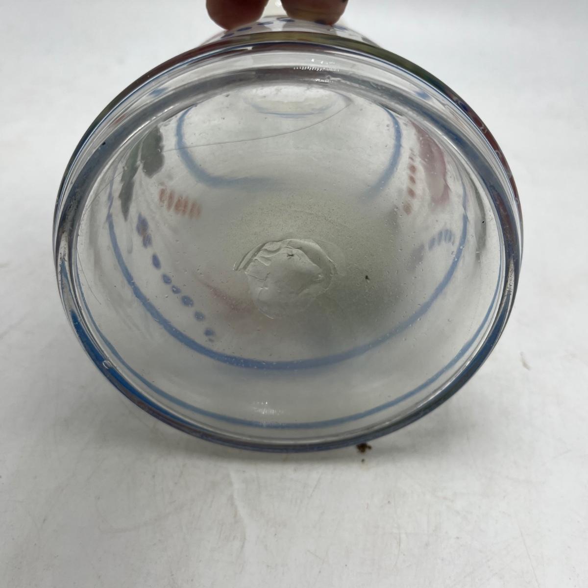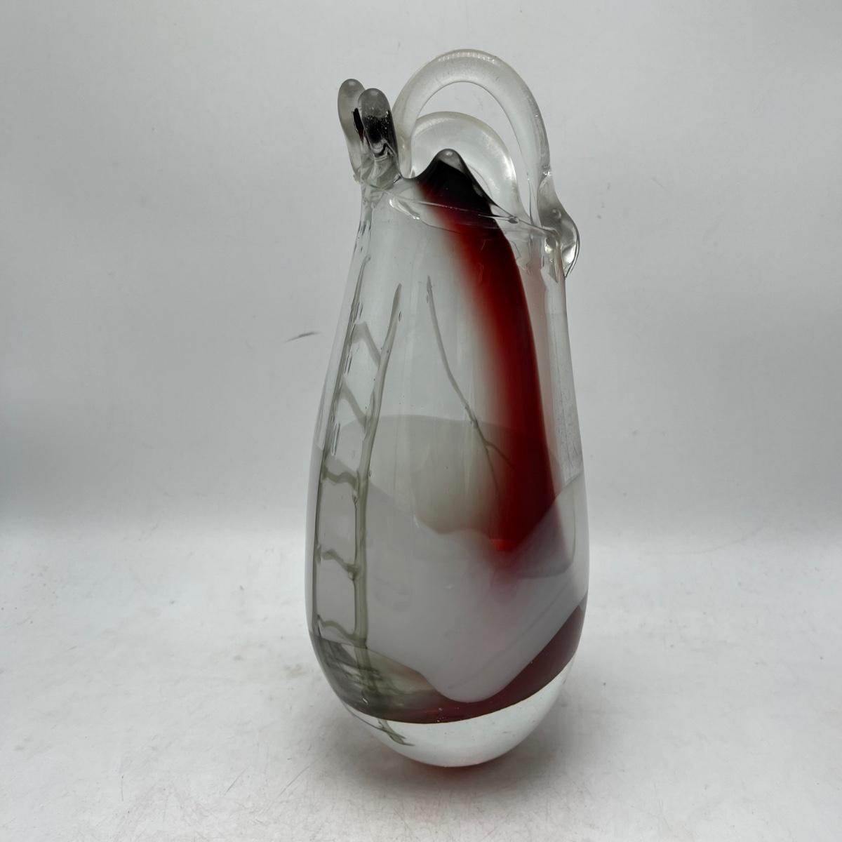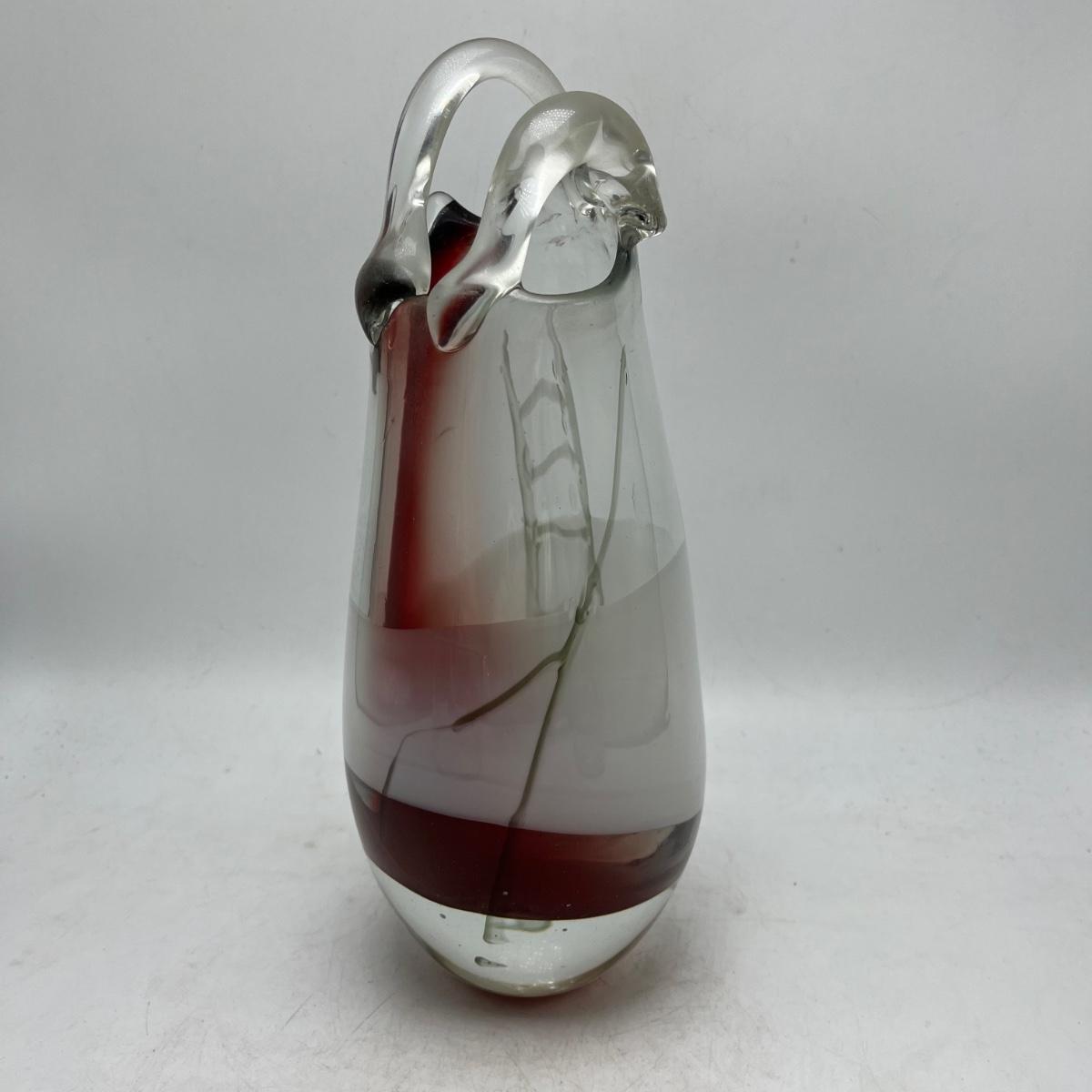 Lot includes a Blenko handmade glass basket, glass vase and a glass bottle with floral design. Basket measures 5.75” x 6” x 8”.