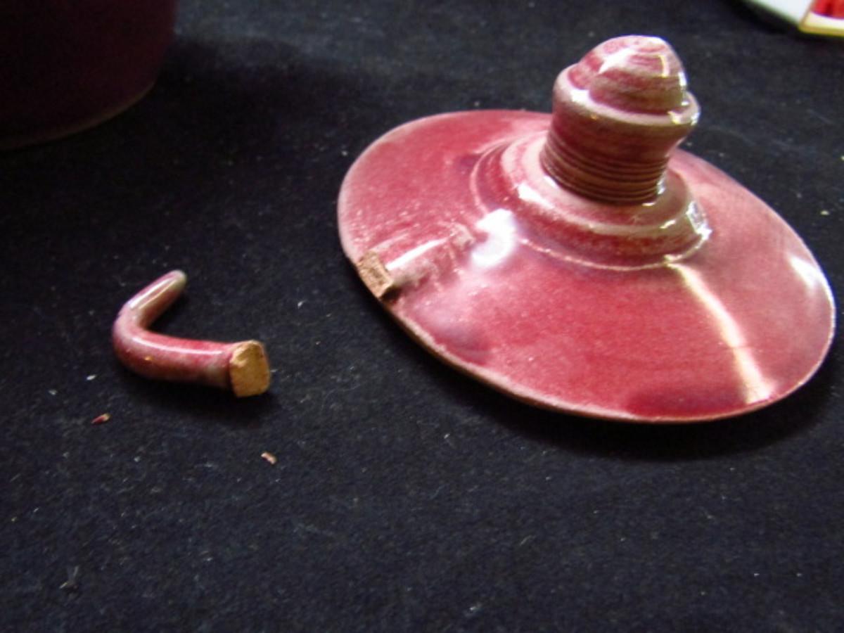Hand Made Glazed Pottery Tea Set by Kenneth Beam (#413). Please see all pictures- lid of teapot has a broken piece that needs to be reattached.