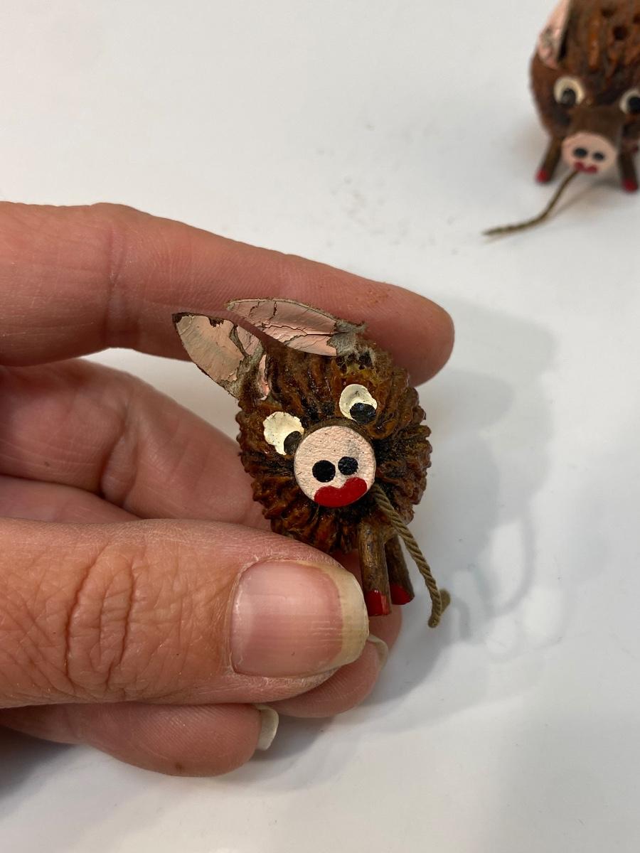 Hand Made Peach Pit Nut Pig Cow Animal Salt & Pepper Shaker Miniatures, Cute. Small, about 1.5" size. Could not figure out if they open and would be refillable.